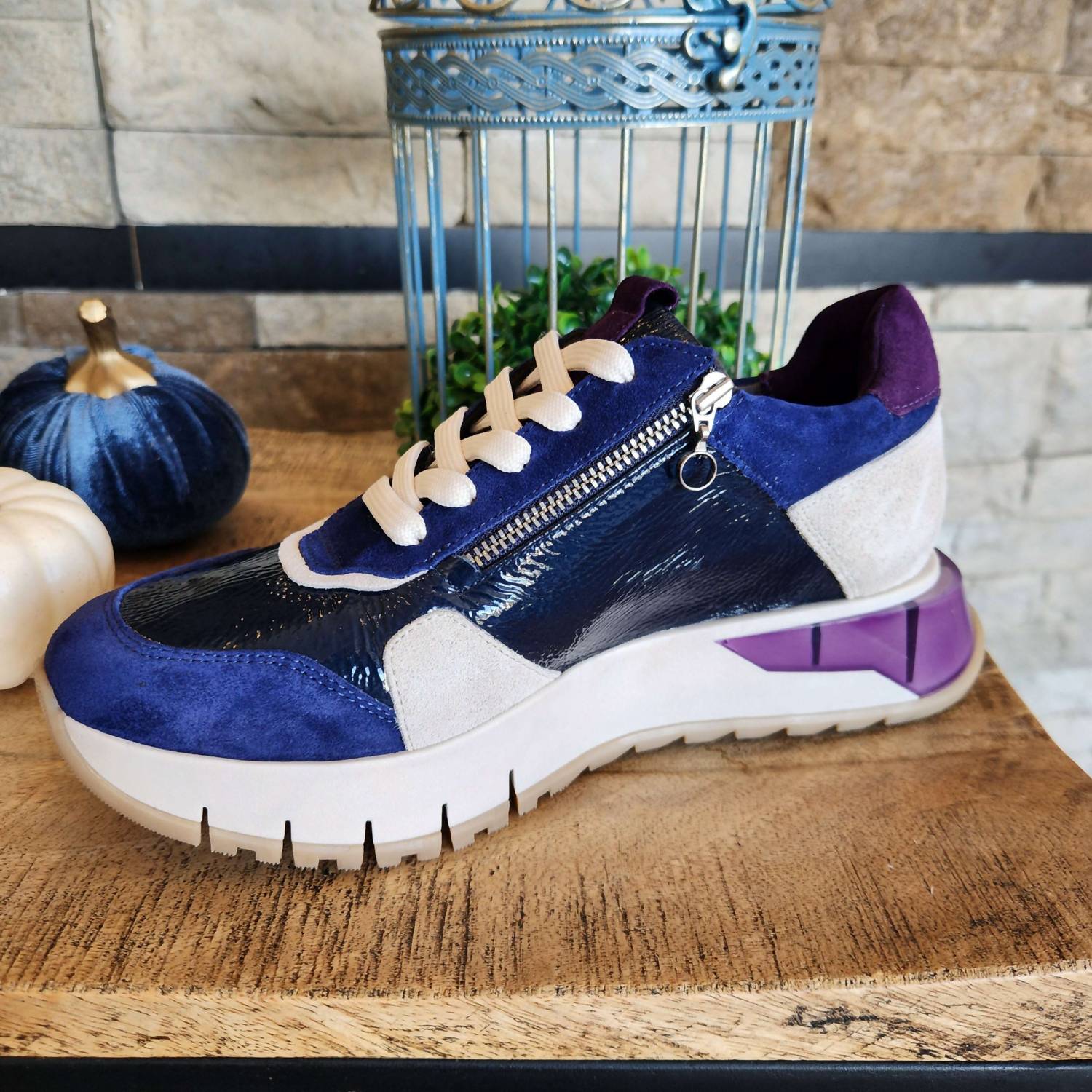 Get your daily steps in with these adorable sneakers. Step up your style with the Women's 8.48.15 Sneaker by Softwaves, a perfect blend of navy and purple faux suede. Designed with a tie closure and a removable insole, this sneaker ensures superior comfort and support. Featuring a round toe and flat heel, it captures a sporty essence perfect for summer streetwear or travel. Ideal for those seeking a stylish yet practical option, complete your wardrobe with this standout piece in color Blue Azel.