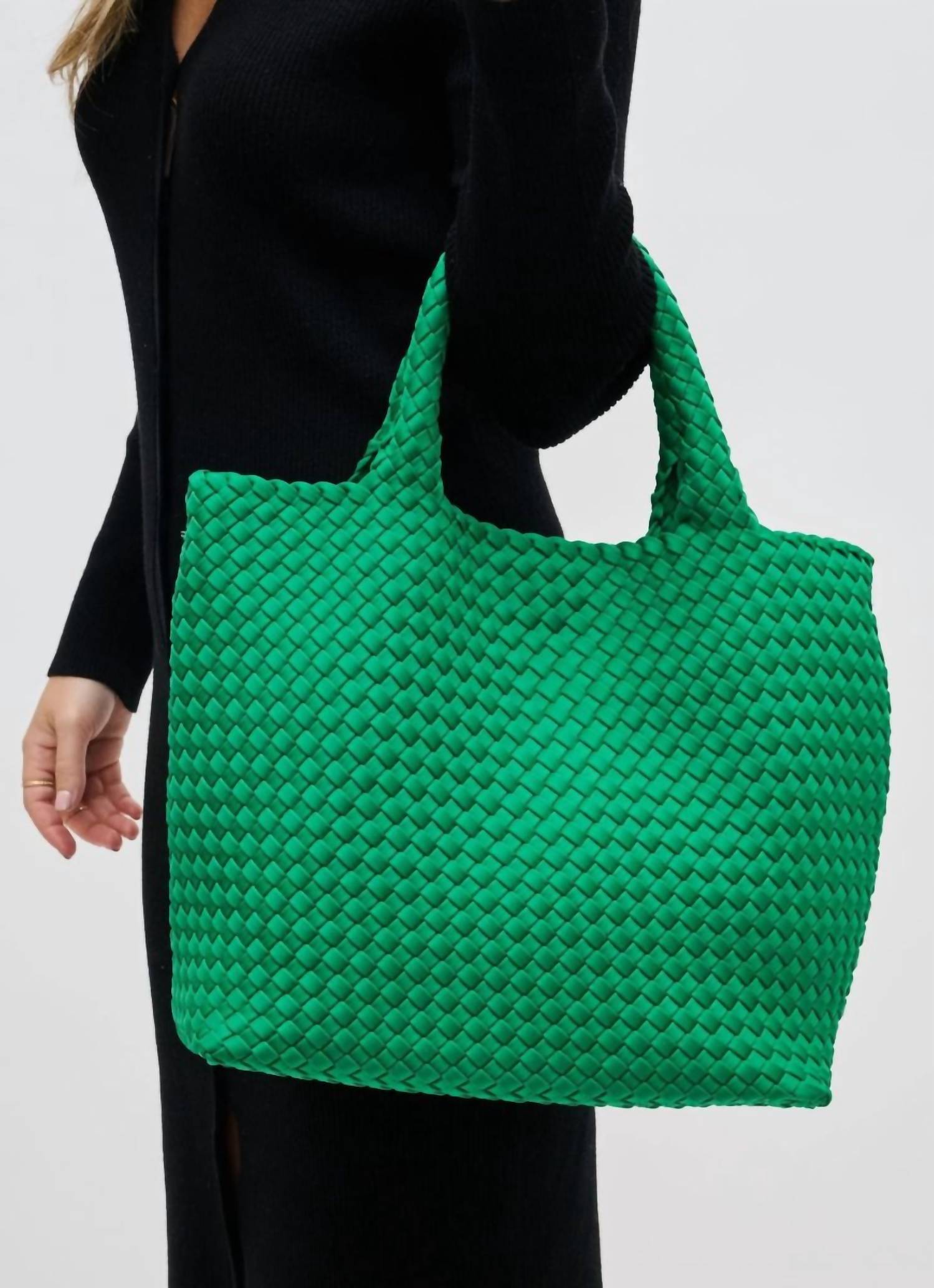 The perfect throw-it-in-and-go bag for your next weekend away or beach vacation! Its classic design will never go out of style and you'll be reaching for this bag season after season. The Women's Sky's The Limit Medium Woven Neoprene Bag by SOL and SELENE is the perfect blend of style and utility. Crafted from 100% durable Neoprene, this tote in classic green features a convenient detachable crossbody strap and a removable zipper pouch for versatile carrying options. The functional design is completed with a secure snap closure, ensuring your belongings stay safe. Measuring 12" L x 6.5" W x 12" H, this tote is easy to care for with a simple spot clean.