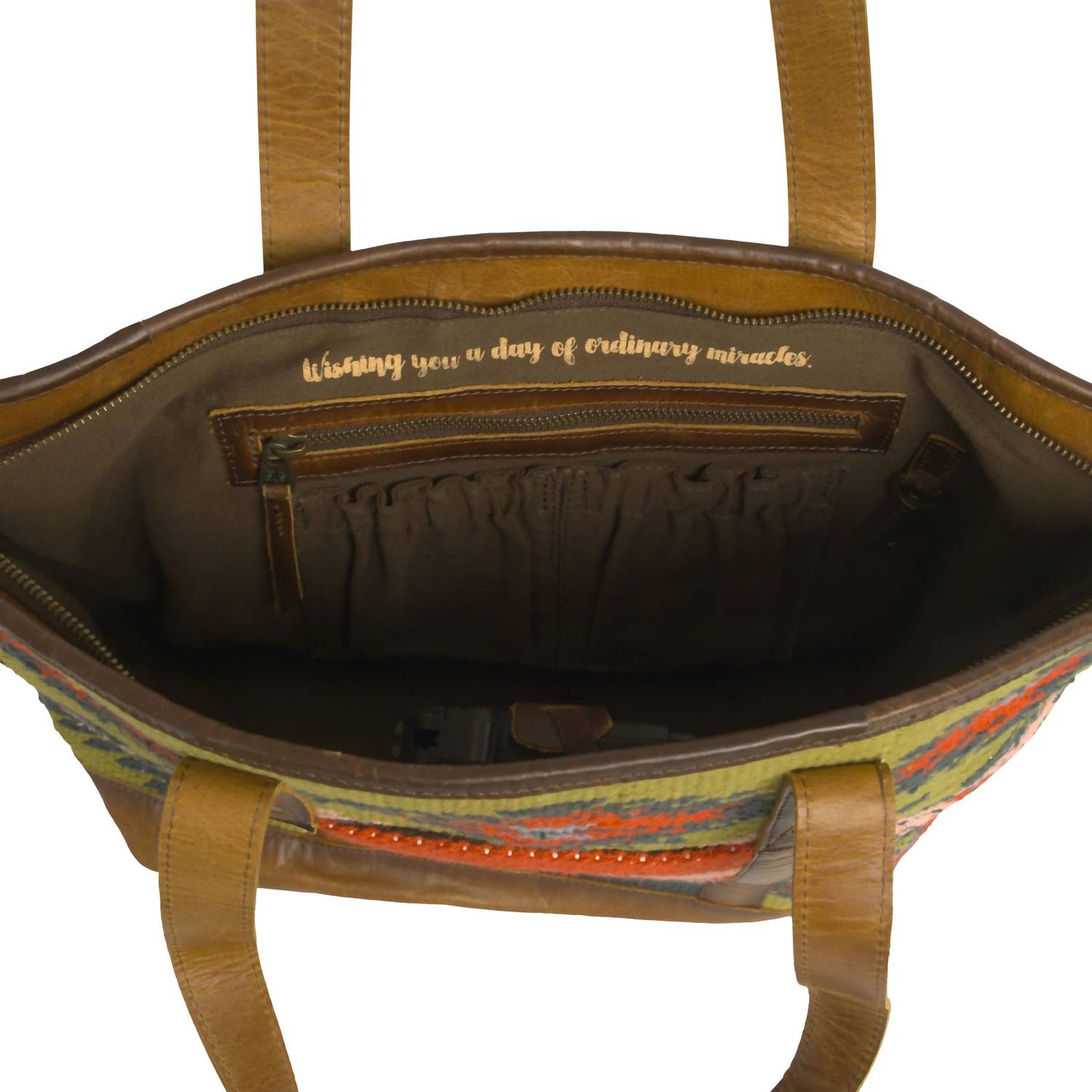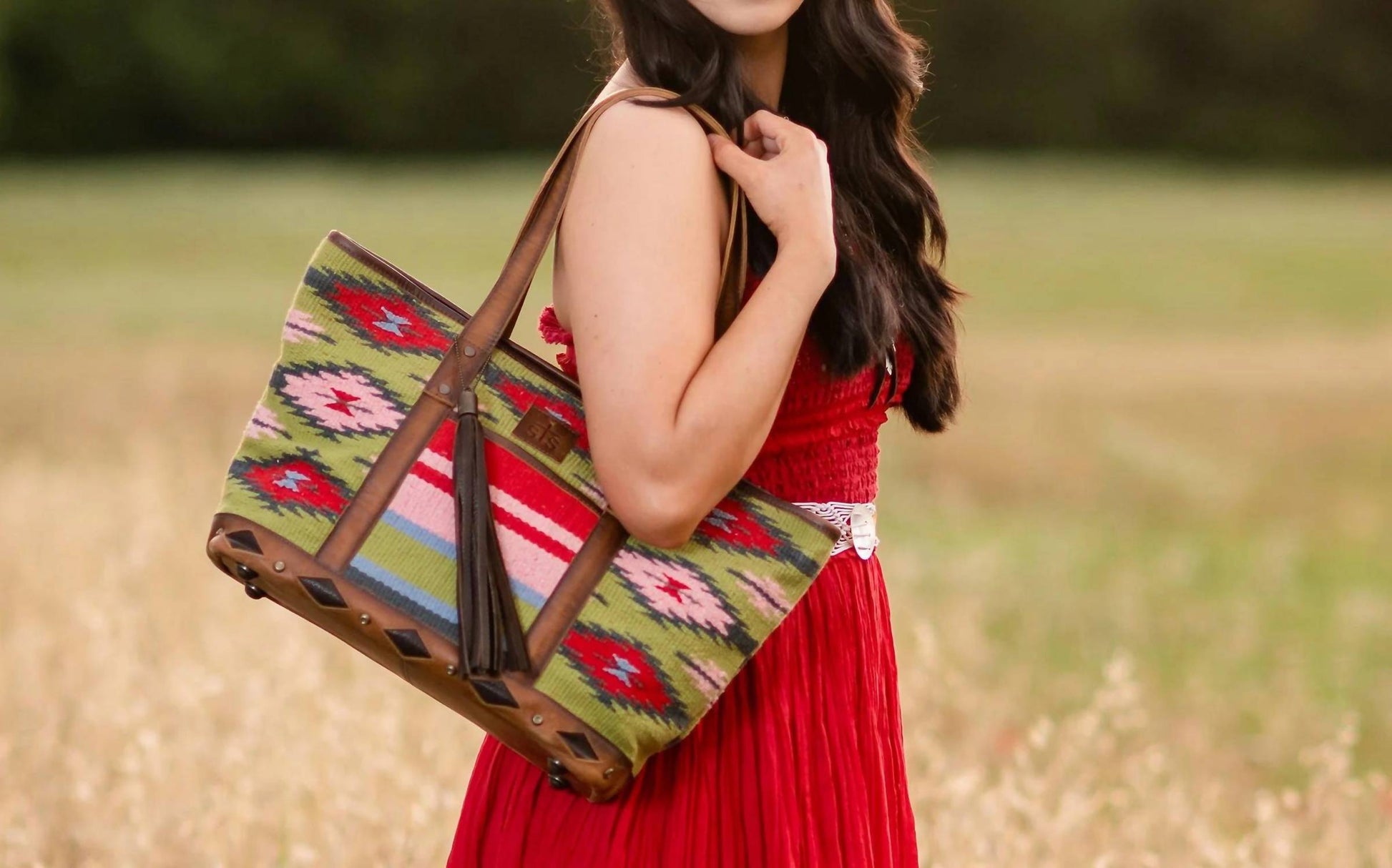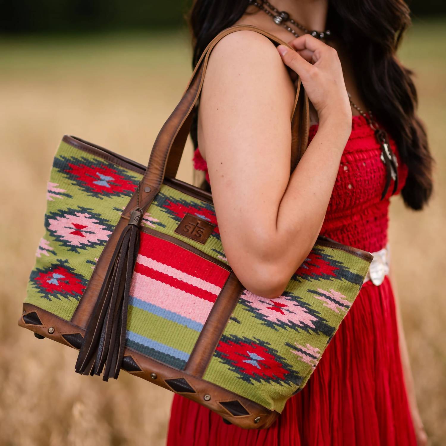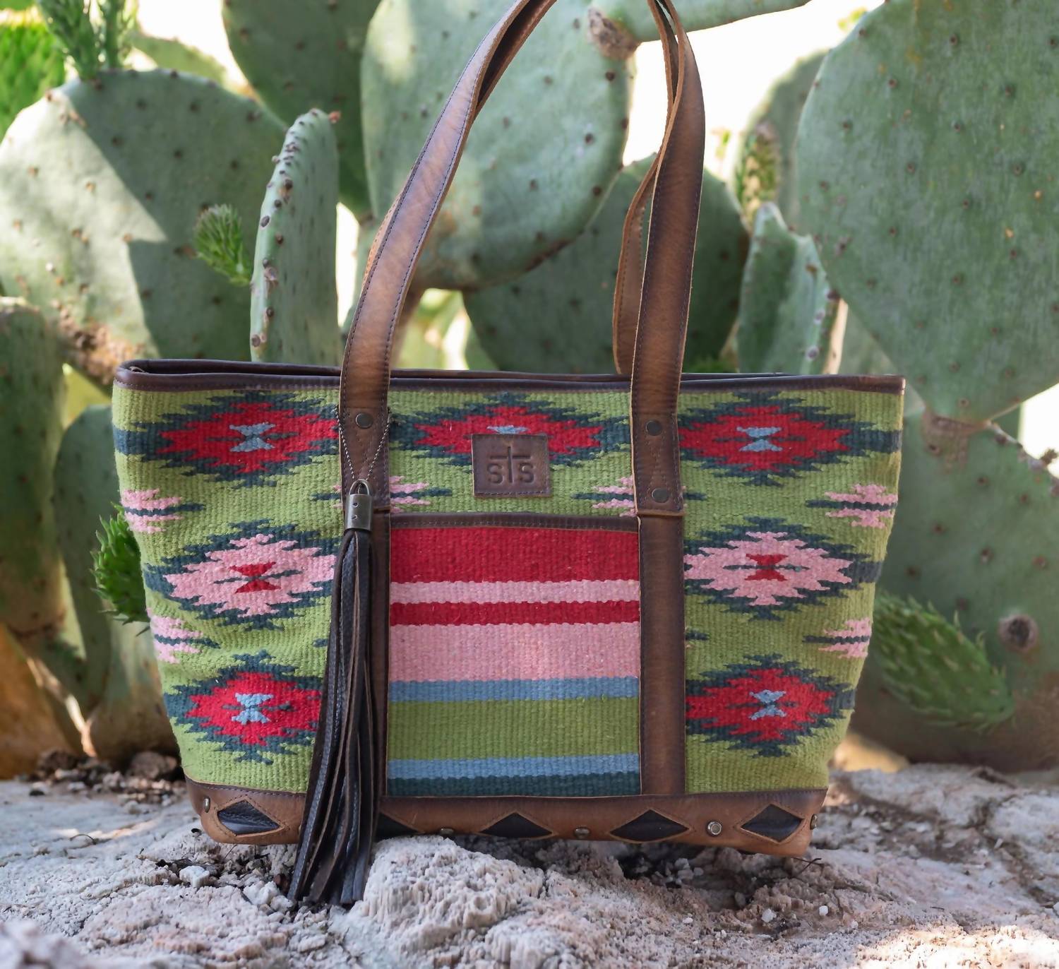 The perfect throw-it-in-and-go bag for your next weekend away or beach vacation! Its classic design will never go out of style and you'll be reaching for this bag season after season. Discover the Women's Baja Dreams Tote Bag by STS Ranchwear, a captivating blend of style and functionality in a Green Multi colorway. Crafted with a handwoven 100% cotton shell and genuine leather accents, this tote measures 18.5" W x 11" H x 6" D. Featuring a zip top closure and dual leather carrying straps, it offers ample organization with 2 exterior slip pockets, 1 interior zip pocket, and 2 interior scrunch pockets. Elevated by an STS embossed leather patch, decorative tassel, and a thoughtful interior message, this luxurious tote pairs vibrancy with practicality.