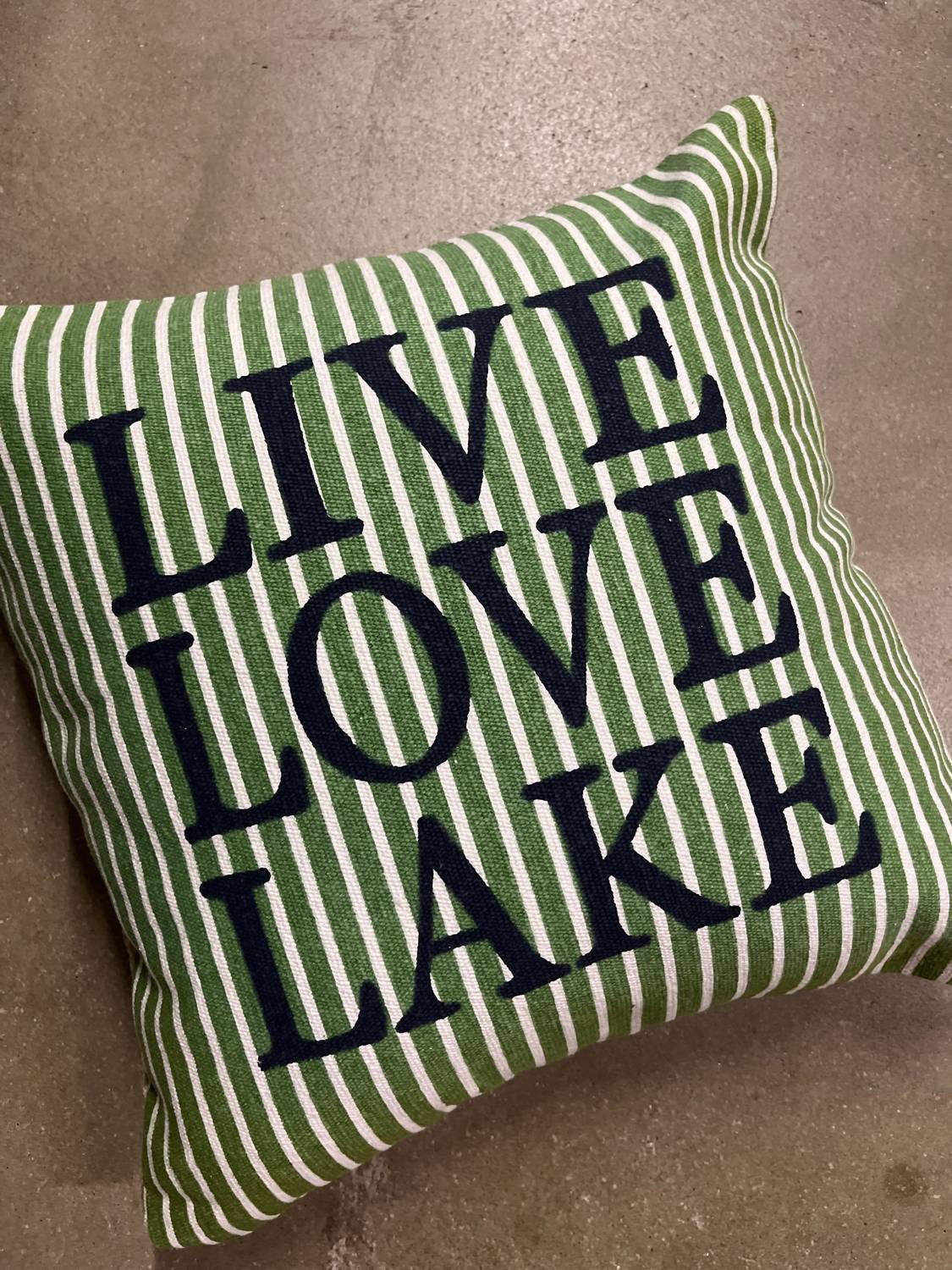 Introducing the Love Jute Back Lake Pillow by Mud Pie, a charming home accessory perfect for any lake lover. This square pillow is made from 100% cotton and features a green and white striped design with the phrase "Live, Love, Lake" on the front. Featuring a woven jute backing for added style, it comes with a zipper closure for easy maintenance. Care for this washable pillow with ease—simply machine wash and tumble dry.