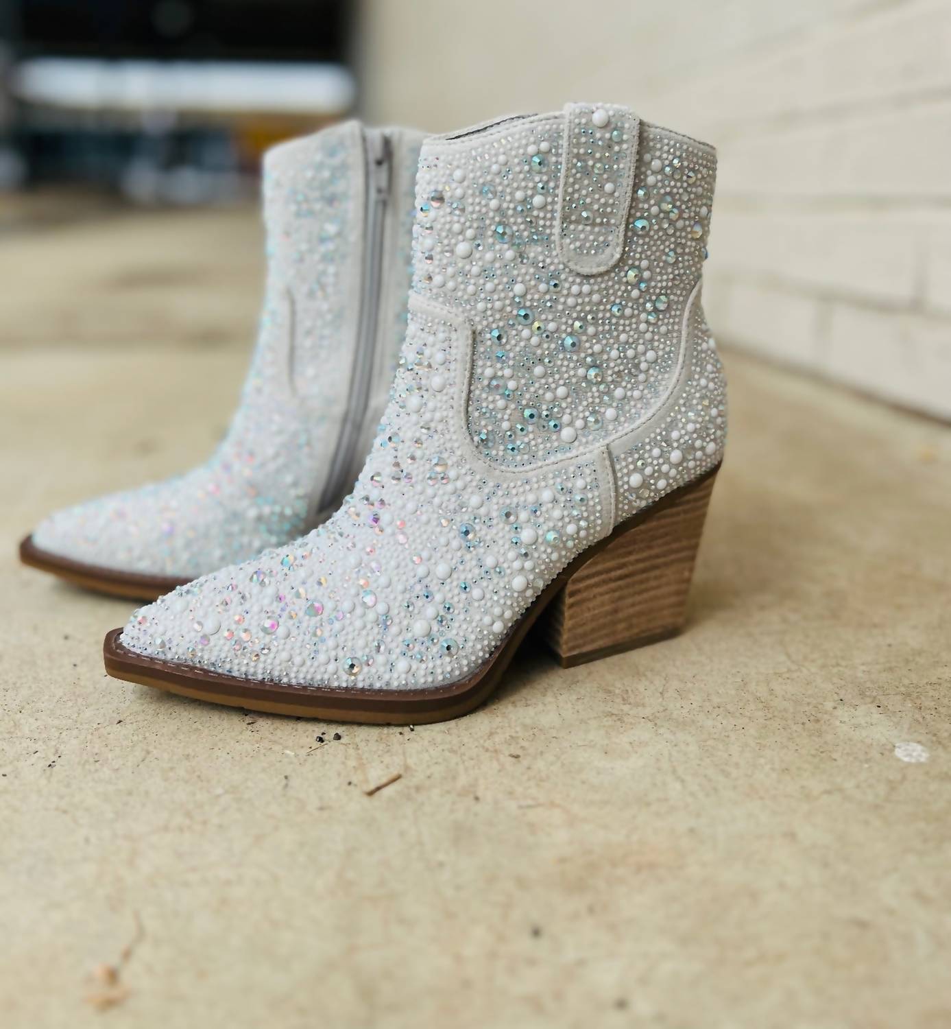 Say hello to the perfect, most versatile boot. The ankle height makes this style easily transition from day to night. Wear them with your favorite skinny jeans and tee for a more laid back look, or pair them with your favorite mini dress and jacket for a night out on the town. Step into elegance with the Pearl "Kady" Silver Rhinestone Booties by Very G, where sophistication meets the bold western trend. Featuring a pointed toe silhouette, these booties are adorned with pearls and rhinestones, offering an unmatched level of luxurious detail. Designed with a convenient side zipper closure, they stand at an ankle length of 5 inches, with a total height of 8.5 inches from sole to top, and a sturdy 3-inch wooden block heel. Perfect for any NFR or Rodeo event, these booties are also available in black and white.