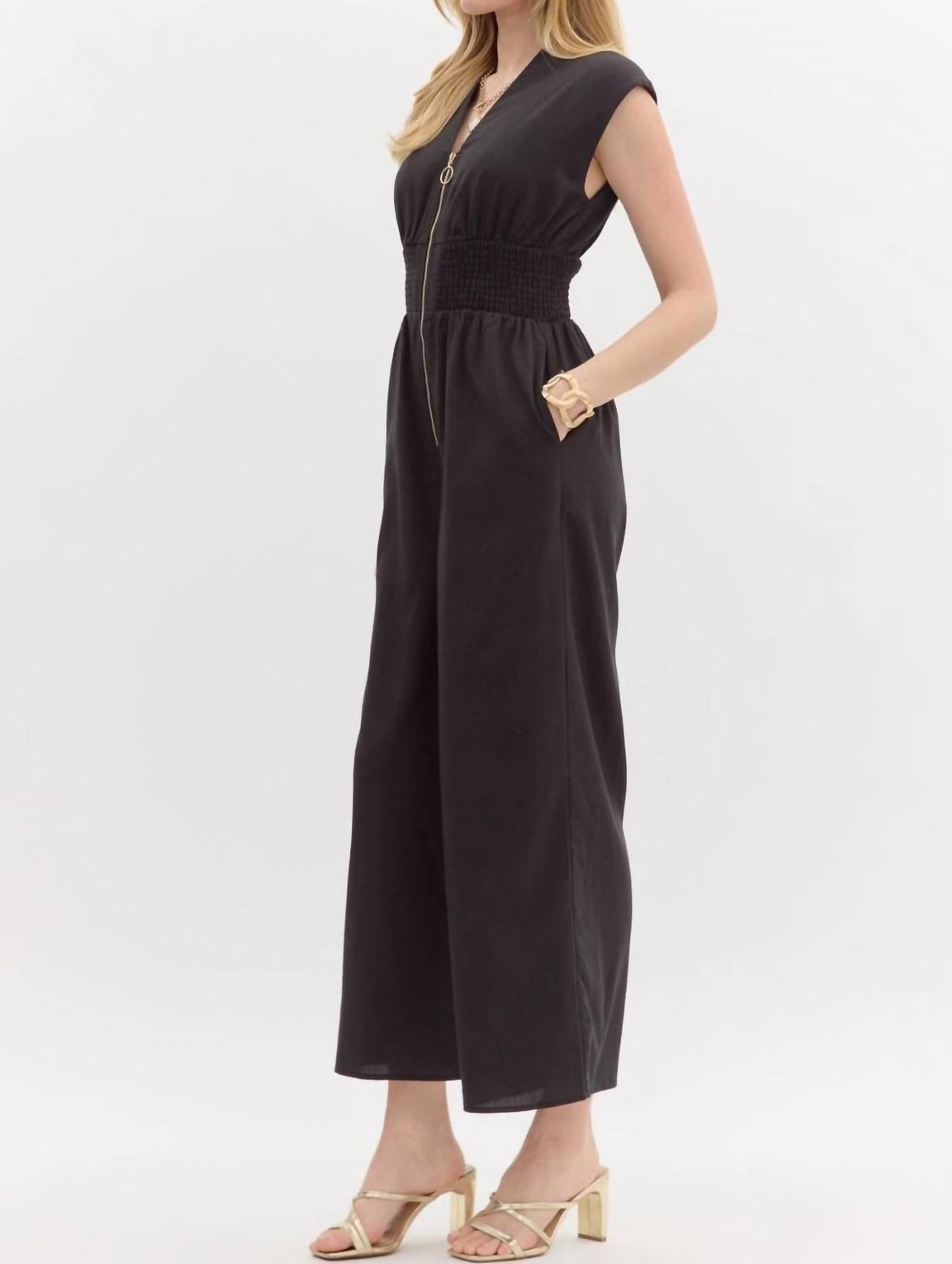 Elevate your wardrobe with the Sleeveless Zip Front Jumpsuit by Entro, a chic choice in timeless black. This is made from  49% Rayon, 34% Polyester, 17% Nylon. This nylon blend piece features a high-rise smocked waist and wide leg design, providing a flattering, relaxed fit perfect for vacation wear. Closure: Front zip closure. Care: Machine wash cold, tumble dry low or hang to dry, cool iron if needed. Enjoy the convenience of side pockets in this versatile summer essential, ideal for effortlessly chic monochrome styling.