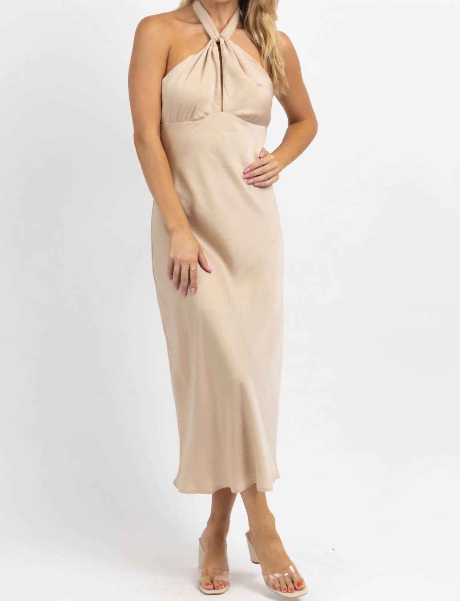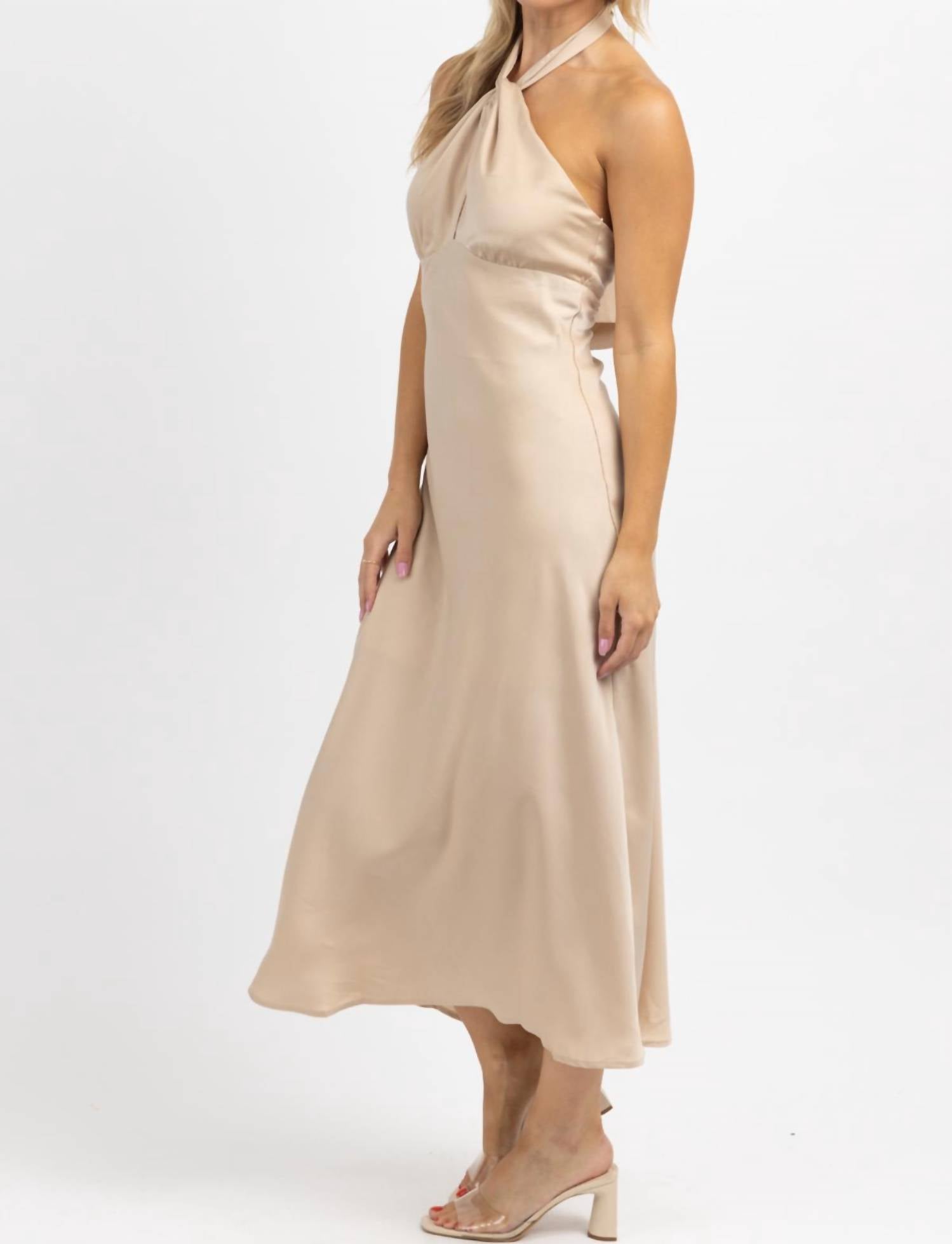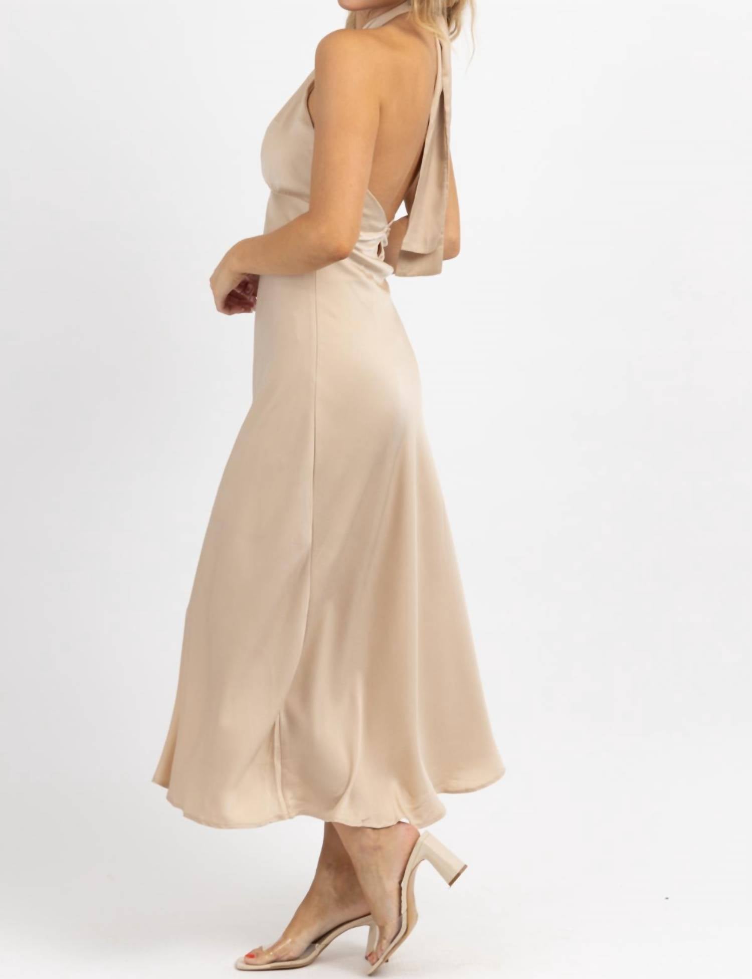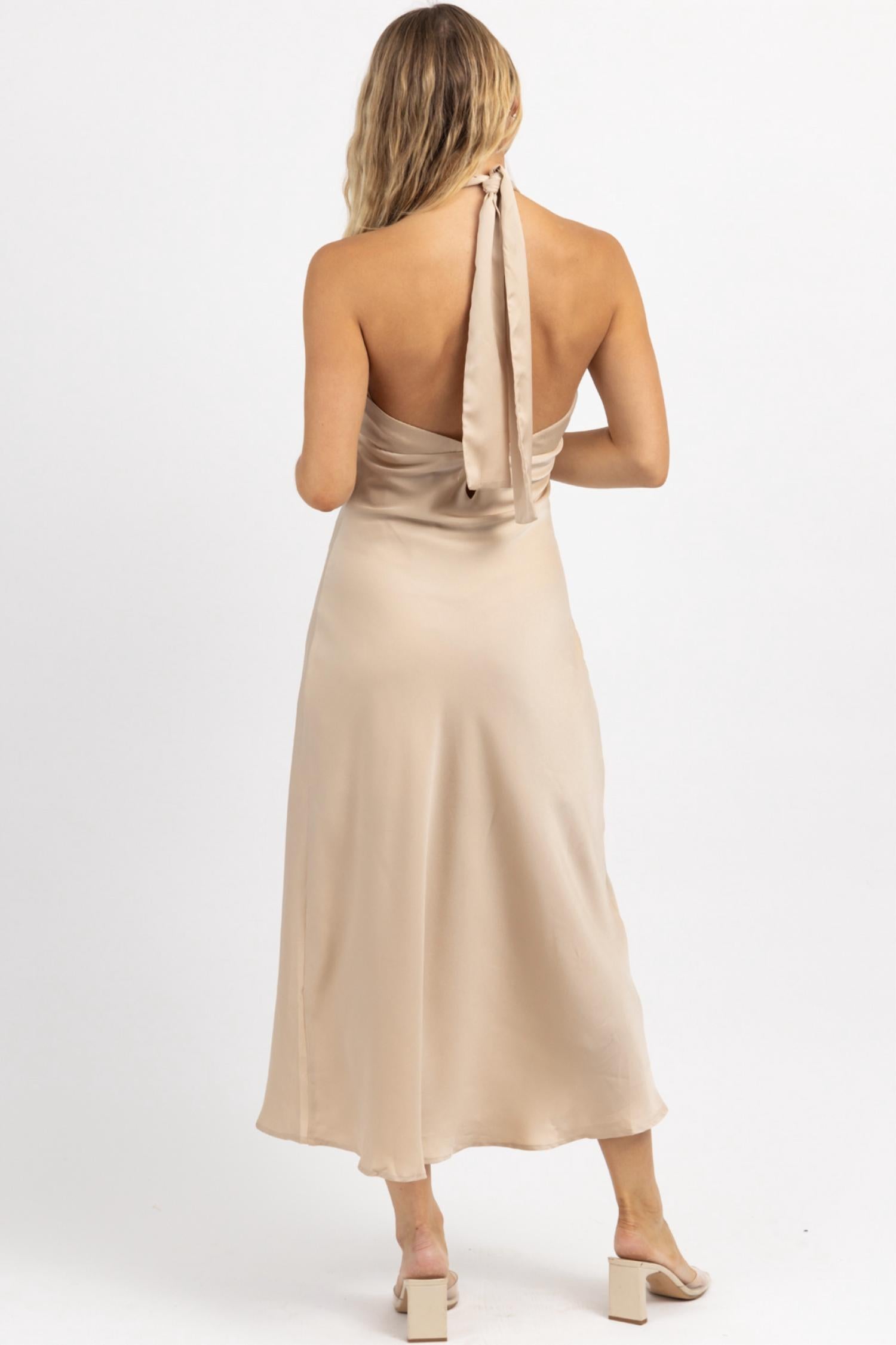 Sleeveless, halterneck with self-tie + loop, satin, zippered, midi length, backless. 100% polyester. The model is wearing a size small. Height 5'8, and the dress size 2.
