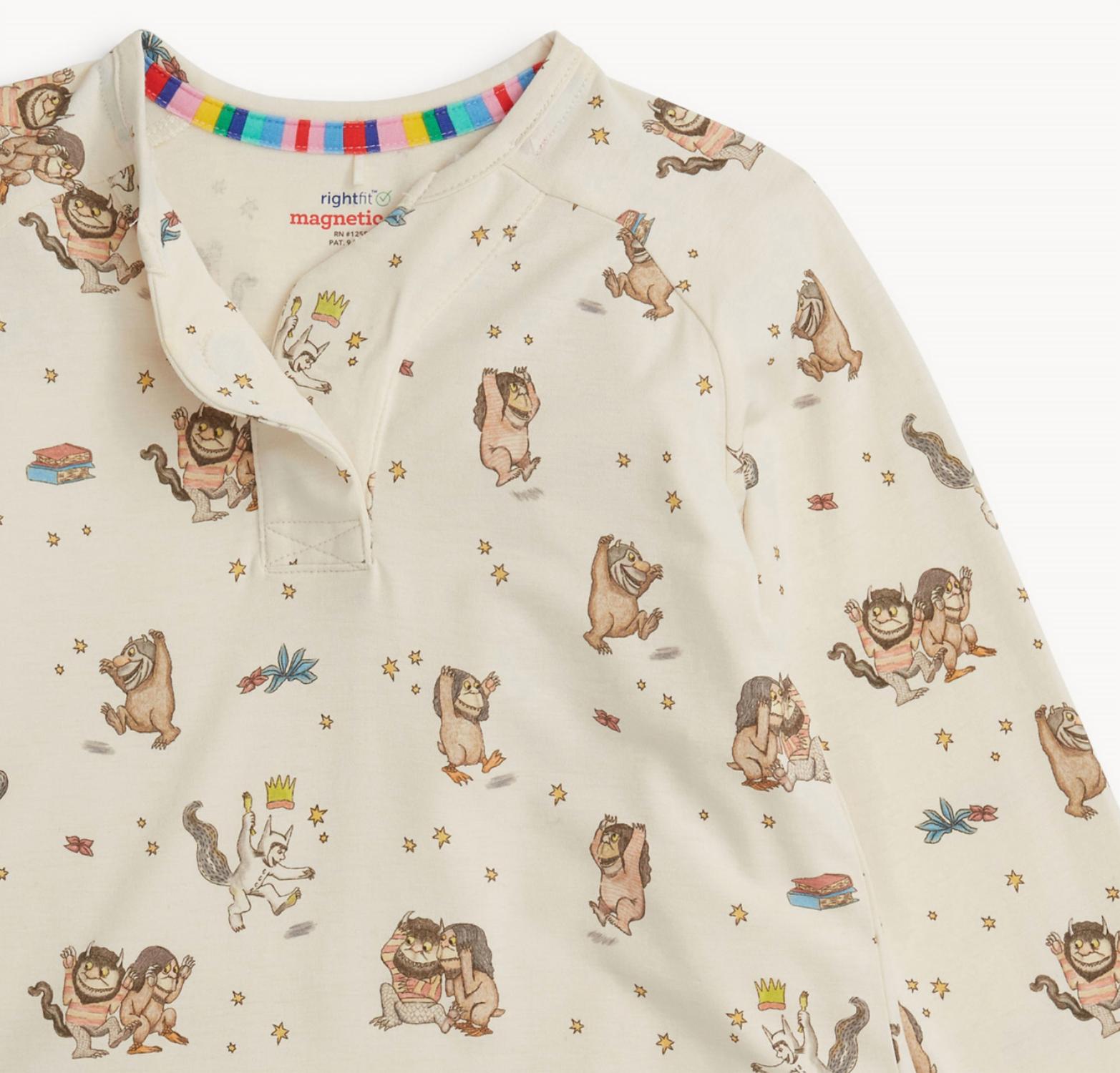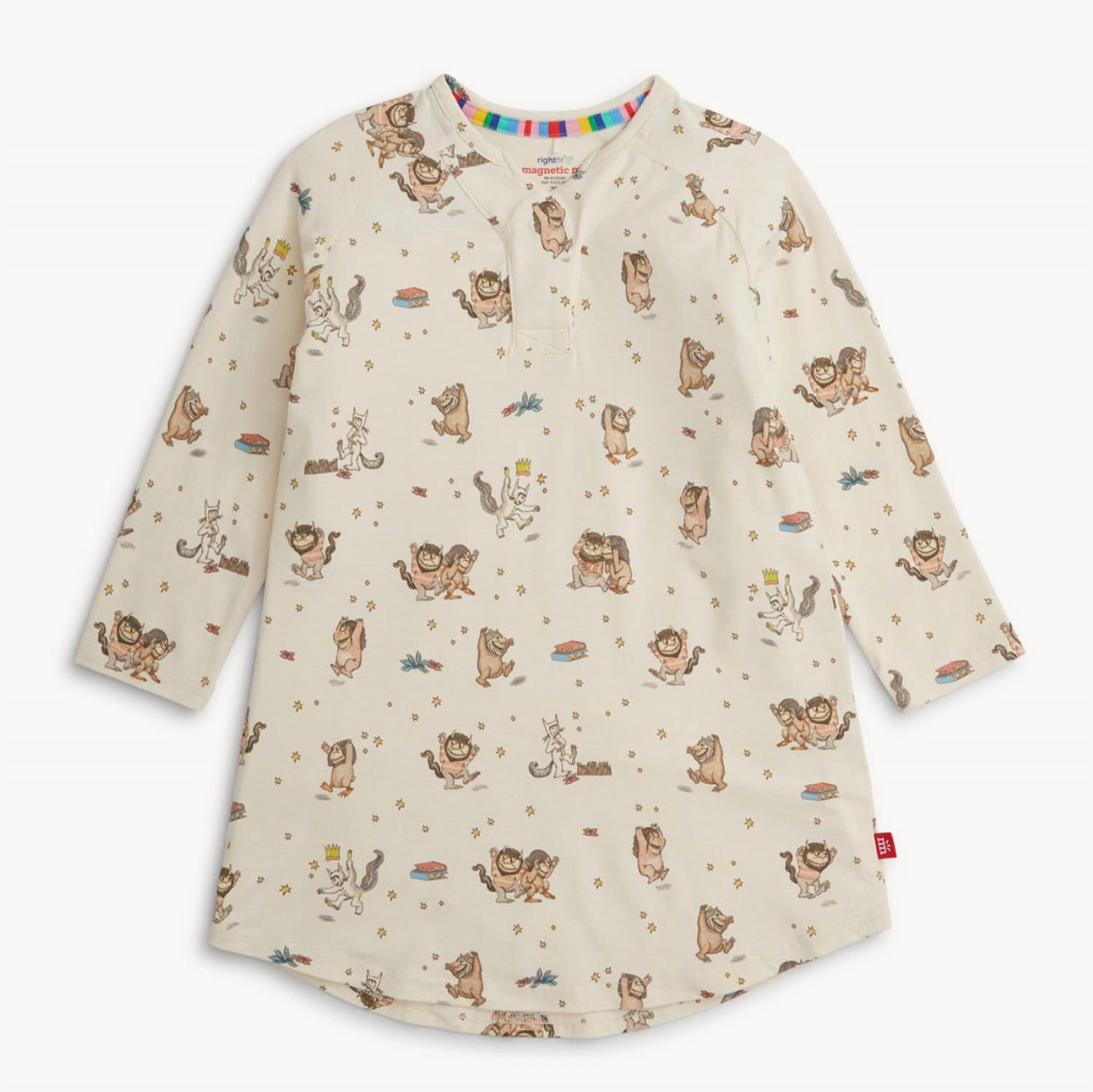 Introducing the Girl's Graphic Nightgown by Magnetic Me in Where The Wild Things Are design, perfect for a cozy Halloween. This nightgown is crafted with innovative magnetic neck closures that encourage independence in dressing. Composed of 60% modacrylic, 35% TENCEL™ modal, and 5% elastane, it ensures breathability and comfort with its naturally flame-resistant fabric free of toxic chemicals. Care instructions: Machine wash for easy maintenance.