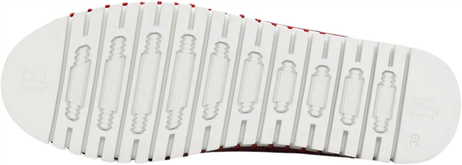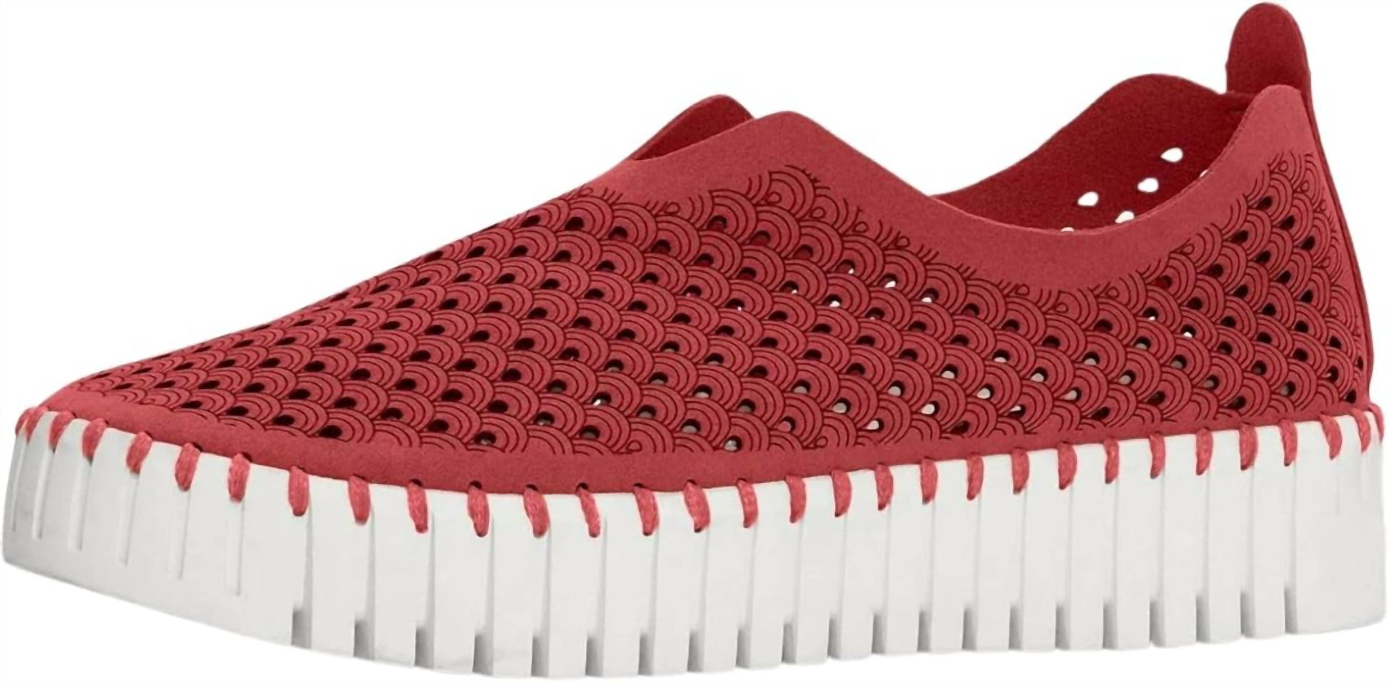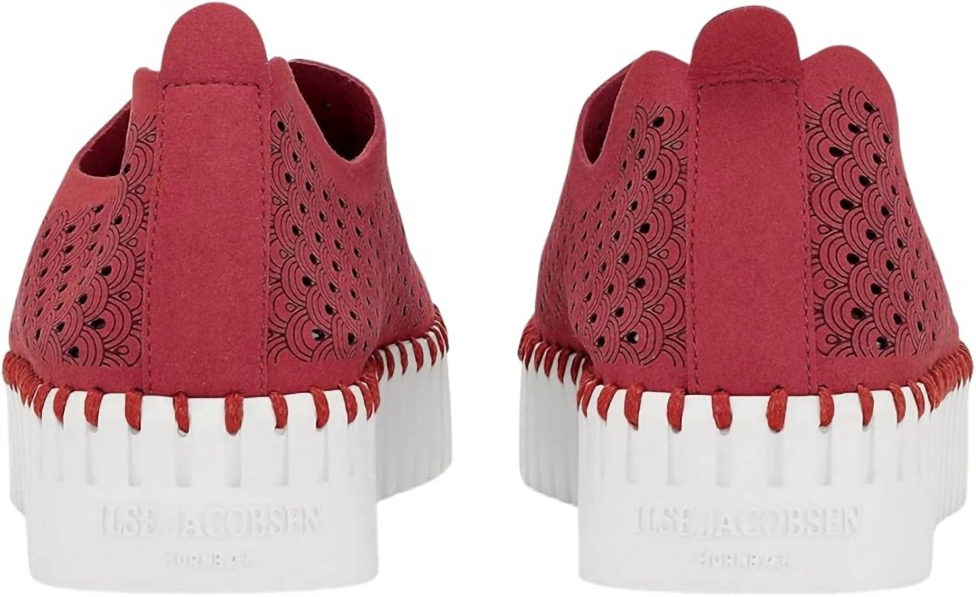 A trend that everyone is loving and this style might just be our favorite. Step up your style with the Women's Platform Tulip Slip-on by Ilse Jacobsen, a refined blend of comfort and elegance in a striking deep red. These flats feature a recycled microfiber upper with intricate laser-cut detailing and rest on a flexible Tulip outsole designed for added lift without sacrificing lightness. Crafted with meticulous care, they boast a glue-free, tone-on-tone construction using matching recycled thread, offering sustainability and style hand-in-hand. Composition includes 60% Nylon and 40% Polyurethane, with a softly padded insole ensuring all-day comfort and support.