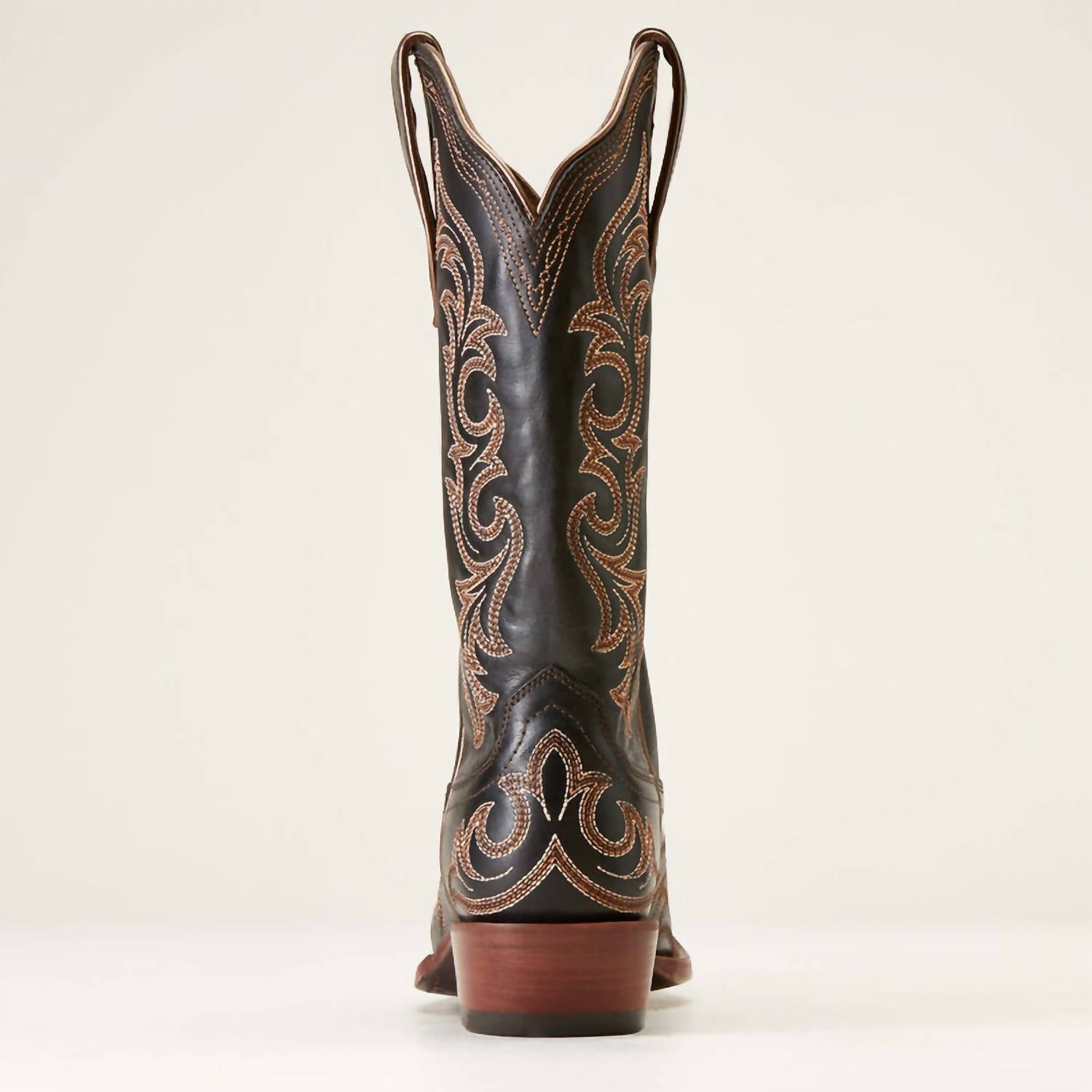 A stylish boot with a comfortable fit and the perfect amount of height. These classic boots are the perfect addition to any outfit and can be worn season after season. Embrace classic Western style with the Women's Hazen Western Boot by ARIAT, crafted from premium leather. This black heeled boot features a 12" height and a comfortable 1.5" block heel, perfect for both vacation and fall outings. It boasts ergonomic ATS® technology for support on uneven terrain, a resoleable Goodyear leather welt construction, and a distinctive five-row stitch pattern. With a pointed toe and a vibrant veg-tan leather sole, it's designed to suit both dressy and casual looks seamlessly.