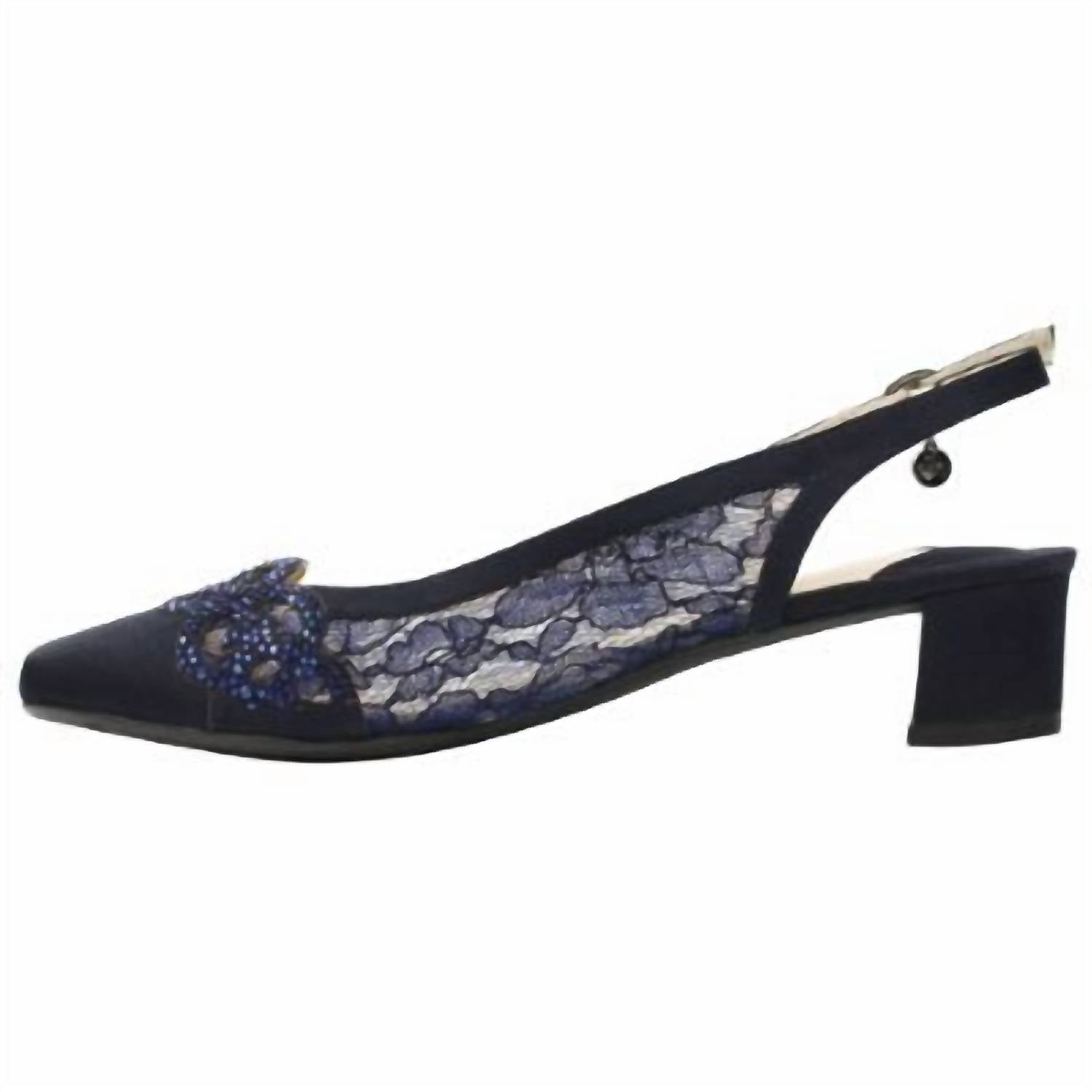 Pair these beauties with your favorite skinny jeans or dress for a night out on the town. Step into elegance with the J. Renee Women's Faleece Sling Heels in sophisticated Navy. These chic heels feature a feminine lace upper and a comfortable 1.5" low block heel, perfect for adding a touch of quiet luxury to any outfit. An adjustable buckle ensures easy wearability, while the memory foam insole provides exceptional cushion and comfort. Designed with a squared toe, these heels effortlessly blend style and practicality for the modern woman.