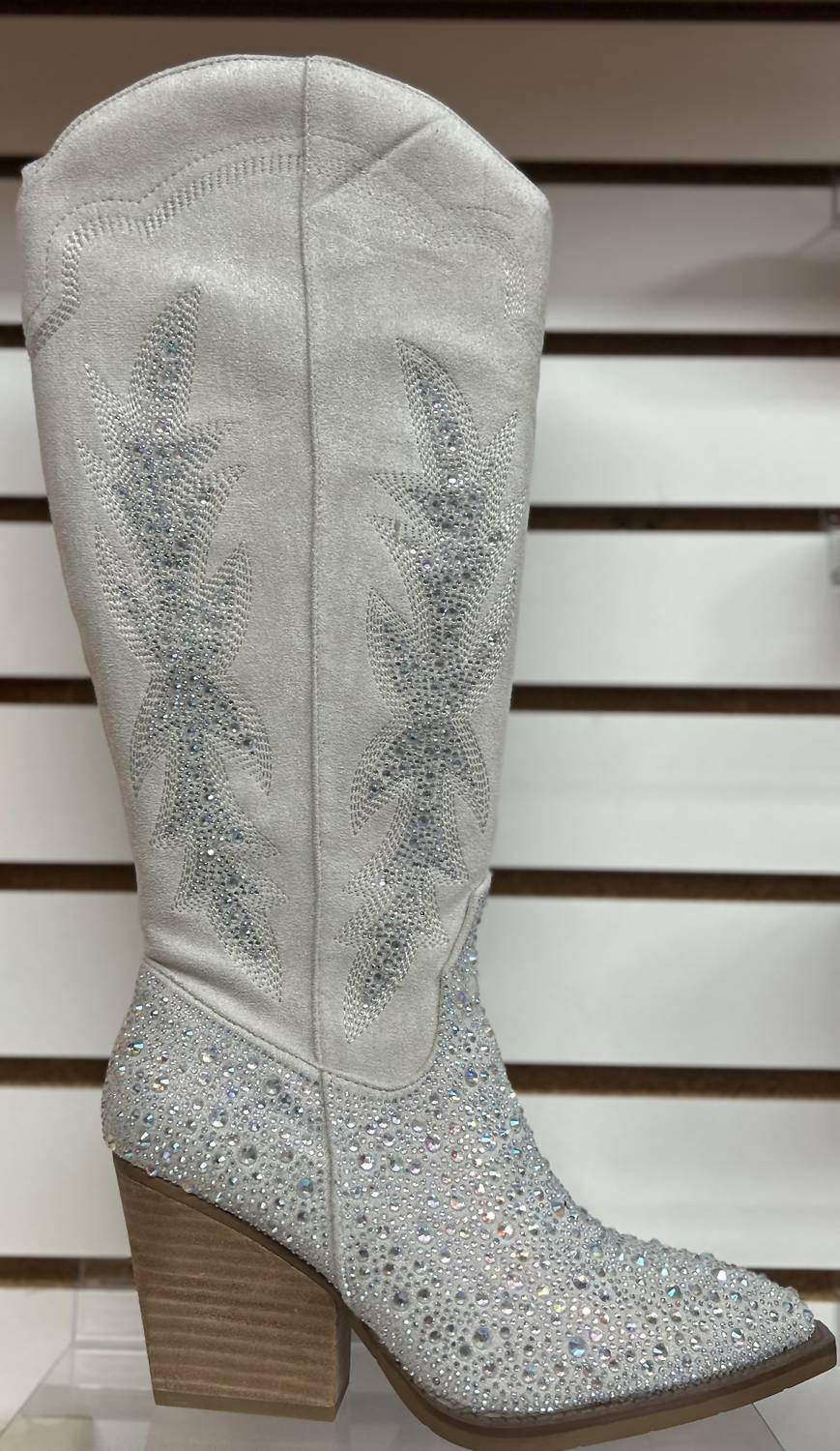 A stylish boot with a comfortable fit and the perfect amount of height. These classic boots are the perfect addition to any outfit and can be worn season after season. Creamy tall boot with shimmery rhinestone crystals. Soft cushioned footbed.