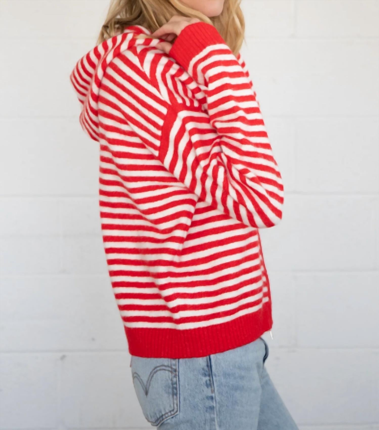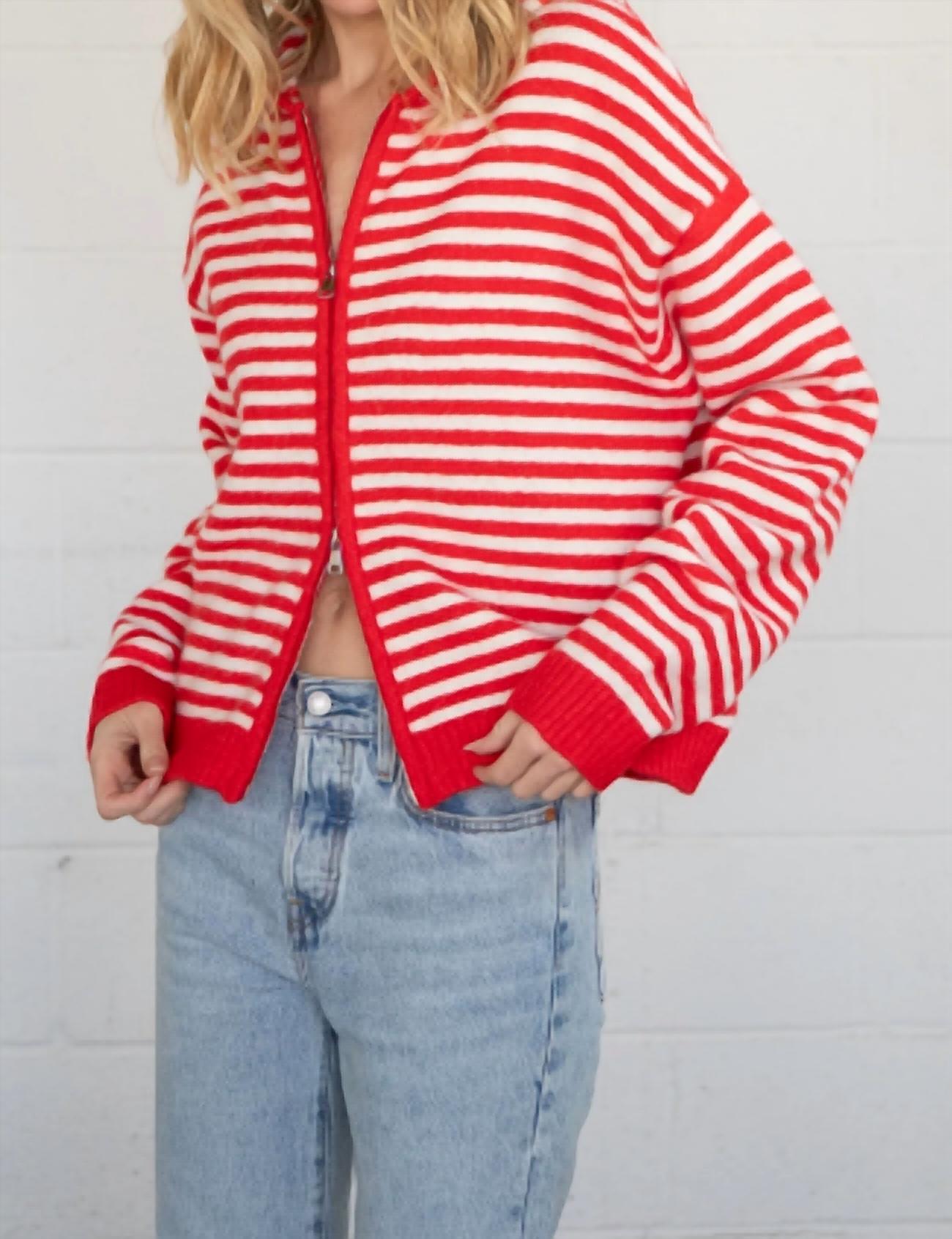 A classic fit that works just as good buttoned as it does left open. Meet the By Together Cooper Zip Up Sweater, a chic addition to your cardigan collection, perfect for a Summer vacation or a Valentine's Day outing. This women's sweater features long sleeves and an elegant hooded neckline, crafted from a wool blend with striking stripes in a vibrant red. With a composition of 53% recycled polyester, 39% acrylic, 5% wool, and 3% spandex, it offers a slightly oversized fit, sealed with a 2-way zip closure for versatile styling. Care is simple with hand wash instructions and a line dry finish to maintain its maximalist appeal.