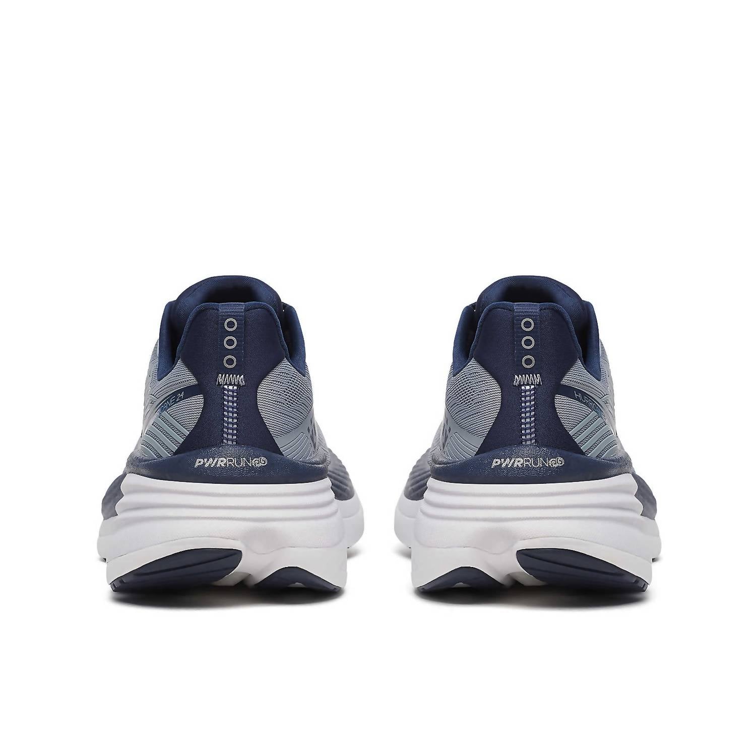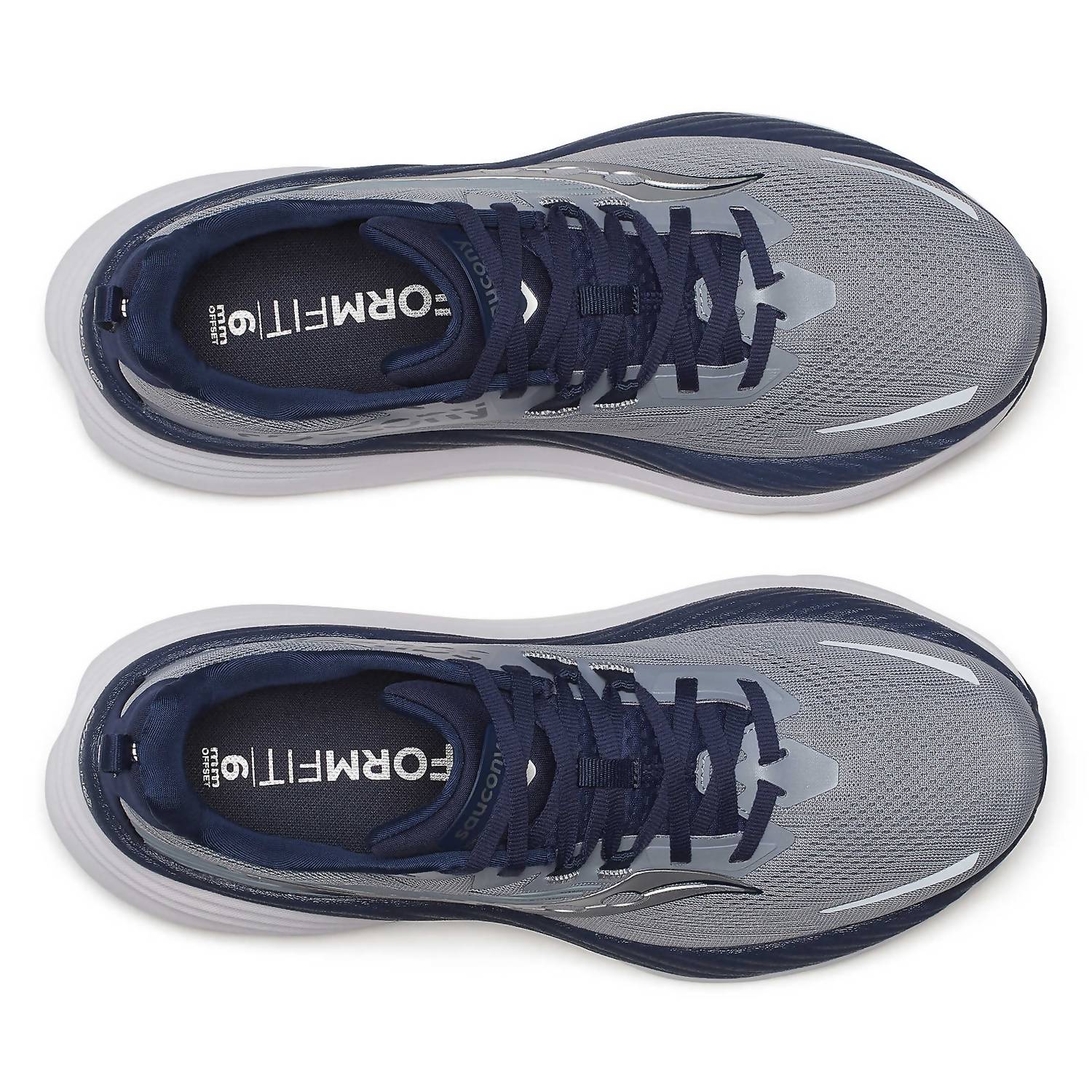 Introducing the Men's Hurricane 24 Running Shoes by SAUCONY, crafted for ultimate comfort and performance in an eye-catching flint/navy colorway. These shoes feature a supportive round toe design and are built with a dual-cushioning system, combining plush, energy-returning PWRRUN PB foam with a PWRRUN foam frame. The premium breathable engineered mesh and plush heel ensure a secure fit for all-day ease. Designed for adults, this innovative athletic shoe promises superior protection and enhanced ground contact with its advanced geometry, making every stride smooth and secure.