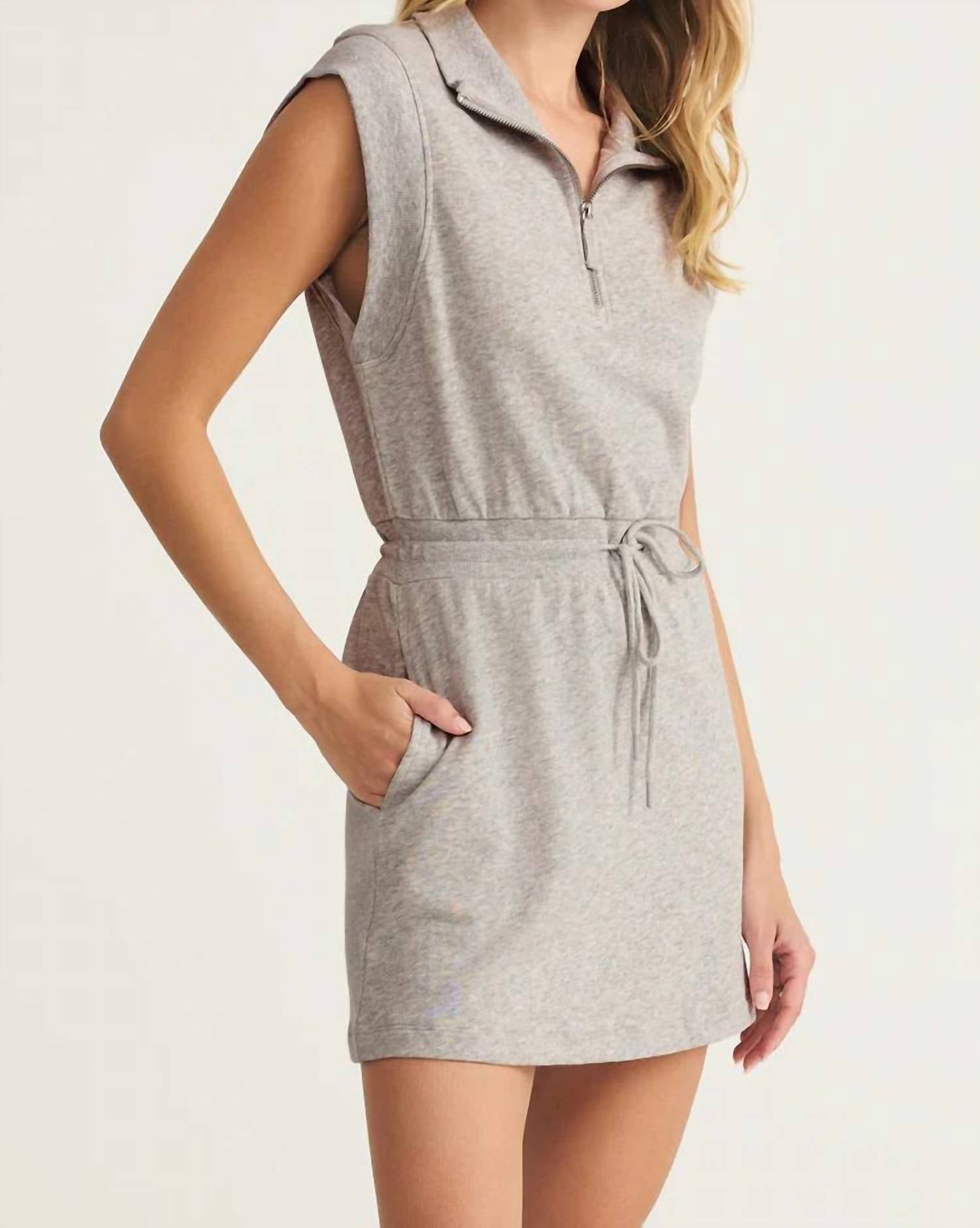 Pair with your favorite sandals for an effortlessly chic look. The Club Quarter Zip Active Mini Dress by Z Supply effortlessly combines sporty and casual vibes in a chic heather gray. Featuring a sleeveless design, this dress is crafted from 100% cotton French terry and offers a comfortable pull-on closure. The half-zip mock neck leads to a relaxed collar, complemented by ribbed details and a fitted drawcord waistband for a structured look. Enjoy the convenience of side seam pockets, with easy care instructions: machine wash cold on gentle cycle and tumble dry low.