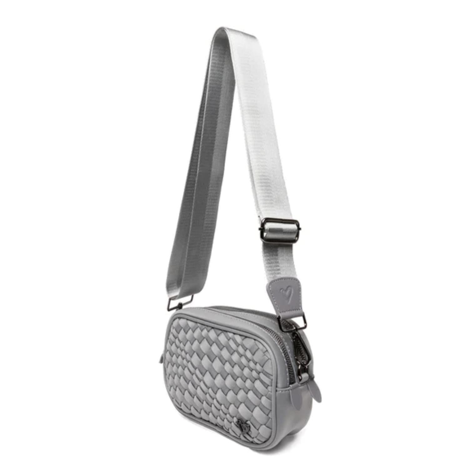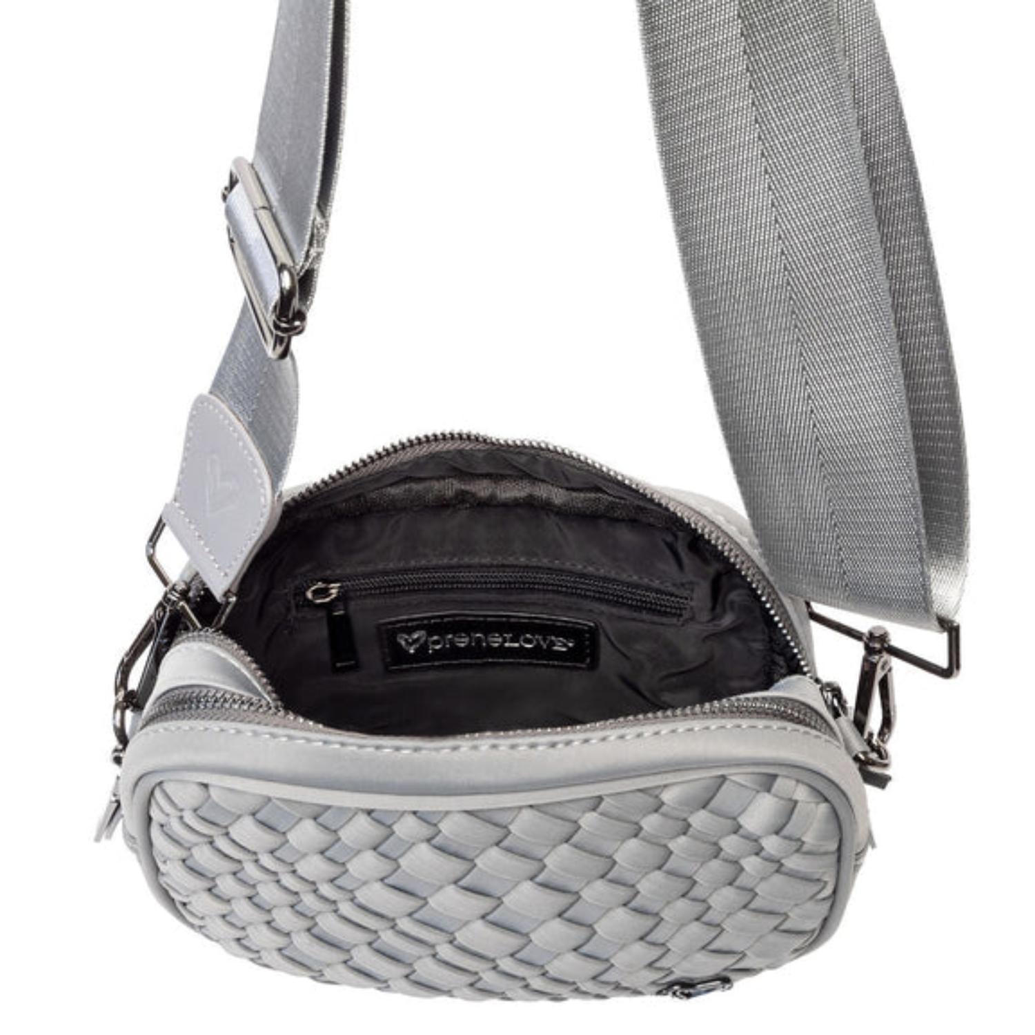 This little number holds all of the important things... lipstick, mints, credit card. Introducing the Caledon Woven Crossbody by preneLOVE, your slate-shaded style essential crafted for the modern minimalist. This mini bag is meticulously hand-crafted from premium neoprene, featuring two separate zipper compartments for organized storage. With a fully-lined interior that includes both a zipper and slip pocket, it offers functional elegance. Measuring 9 inches wide, 5 inches high, and 4 inches deep, this bag is designed to keep you stylishly efficient on the go.