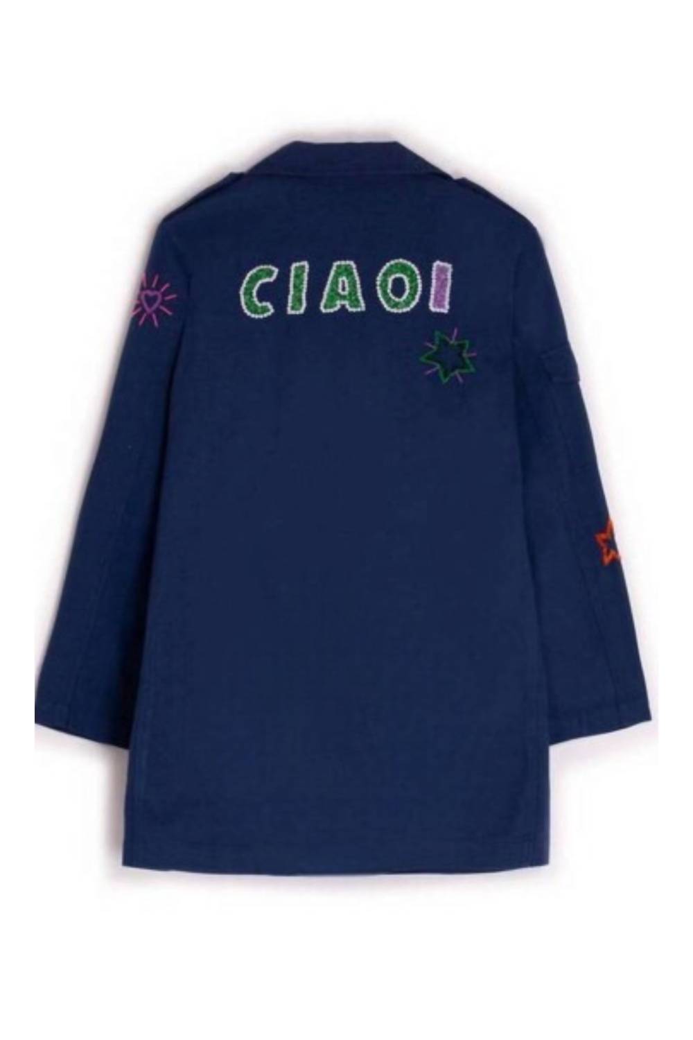 With hand embroidered star and colored bead motif. Lapel collar. Silver metallic buttons. Front pockets. Pocket on right sleeves. True to size. Machine wash cold. 100% Cotton.