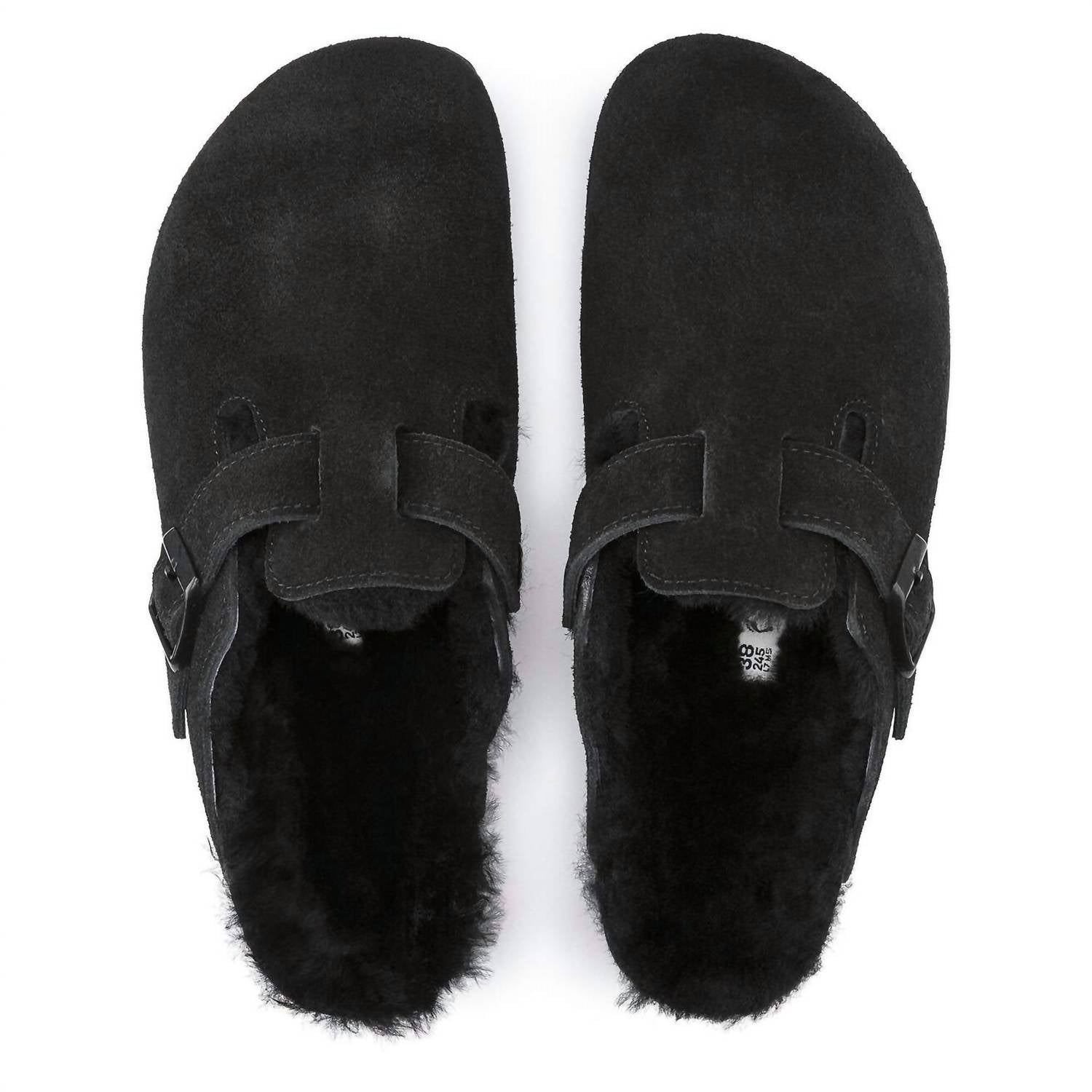This cozy version of a classic clog is made for chilly days, featuring a soft suede-like exterior and a warm, fuzzy shearling lining throughout—even on the contoured footbed that forms to your foot for lasting comfort and support. It has an adjustable strap with a metal buckle for a secure fit, and a lightweight, flexible sole that makes it easy to wear indoors or out.