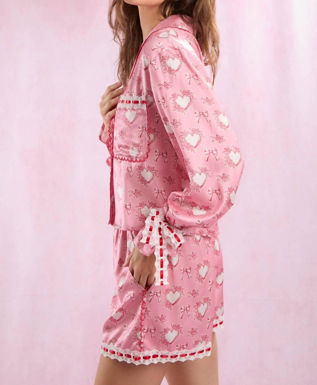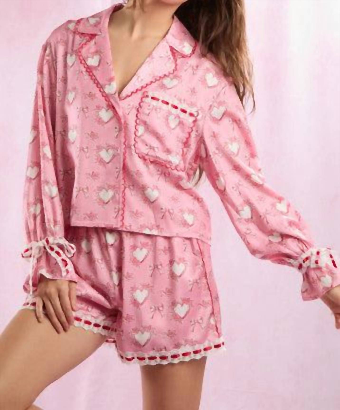 A match made in heaven. This two-piece set is so cute, you'll wish you could wear it out of the house! Did we mention how comfortable it is, too? You may want two sets! Introducing the Satin Heart Print Pajamas by Peach Love, the epitome of cozy and stylish loungewear in a delightful pink shade. Crafted with long sleeves and a charming collar, this graphic set is perfect for feeling loved and pampered. Made with attention to detail, these pajamas are ideal for chilly February nights or any time you crave comfort. Care instructions: Hand wash and line dry. The model is wearing a size small (Height 5'9", Bust 30.5", Waist 24", Hips 34.5").