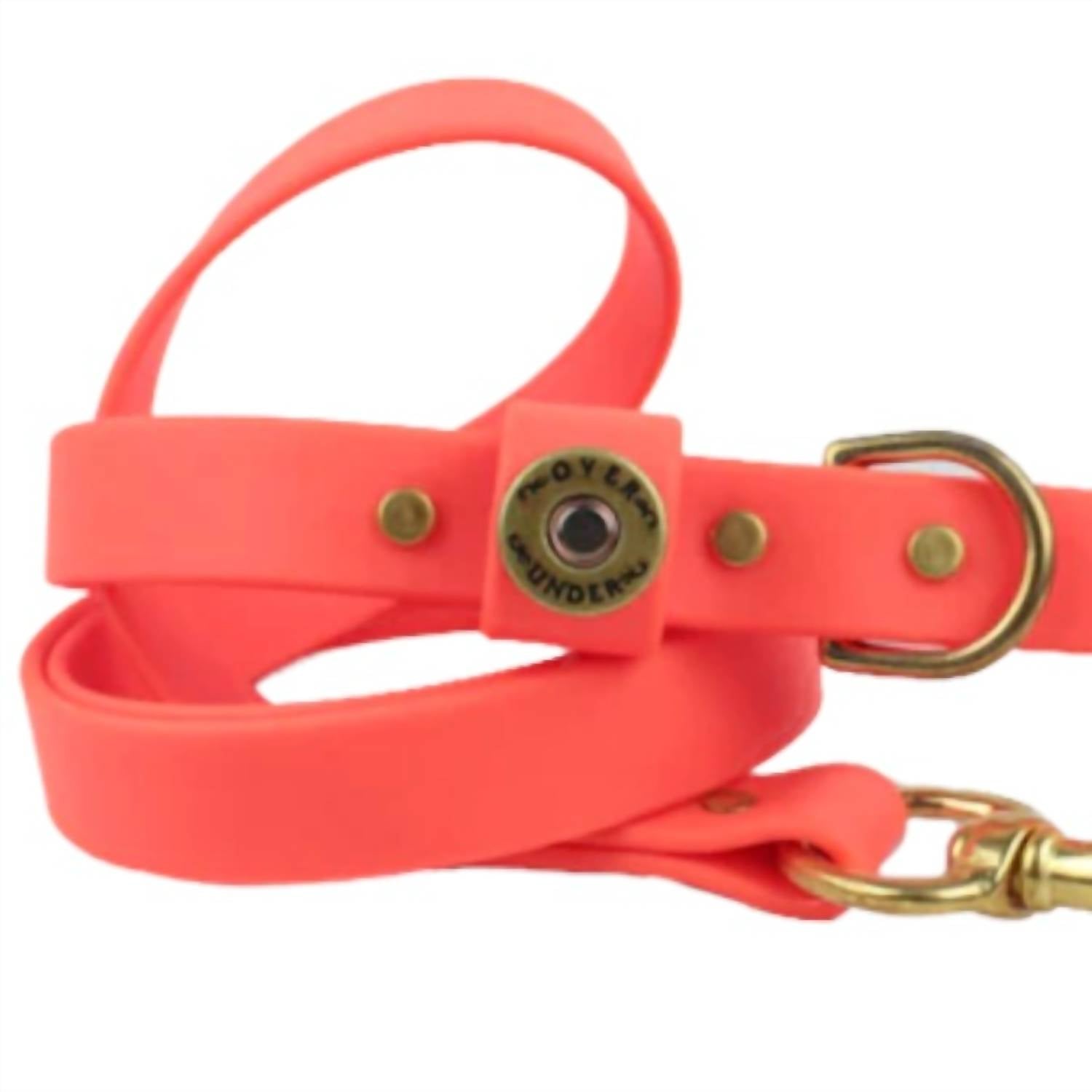Elevate your pup's walking experience with the Water Dog Leash by Over Under, crafted for exceptional durability and style in vibrant hue. Featuring the resilient Water Dog DuraHide material and solid brass hardware, this 5ft leash is designed for long-lasting use. The secure brass slider clasp closure ensures a reliable grip, while the hand loop offers comfort during walks. Proudly made in the USA and backed by a lifetime guarantee, this leash is a true standout in every pet's wardrobe.