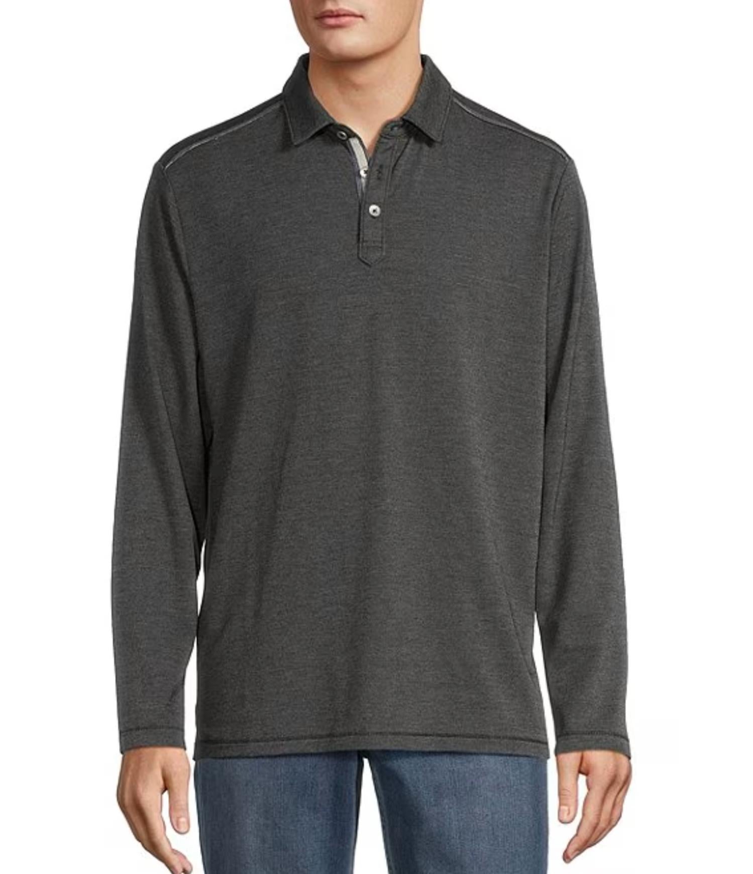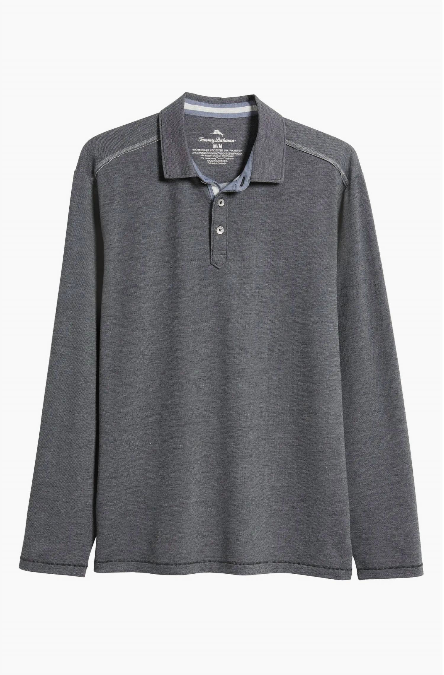 Elevate your summer style with the Coasta Vera Long Sleeve Polo Shirt by Tommy Bahama, crafted in a timeless Coal hue. This minimalist piece features long sleeves and a self collar with a decorative neck tape, offering a refined look. Made from a yarn-dyed recycled polyester blend with mini French terry, it provides both comfort and sustainability. Closure: Three-button placket. Care: Machine wash and tumble dry for easy maintenance.
