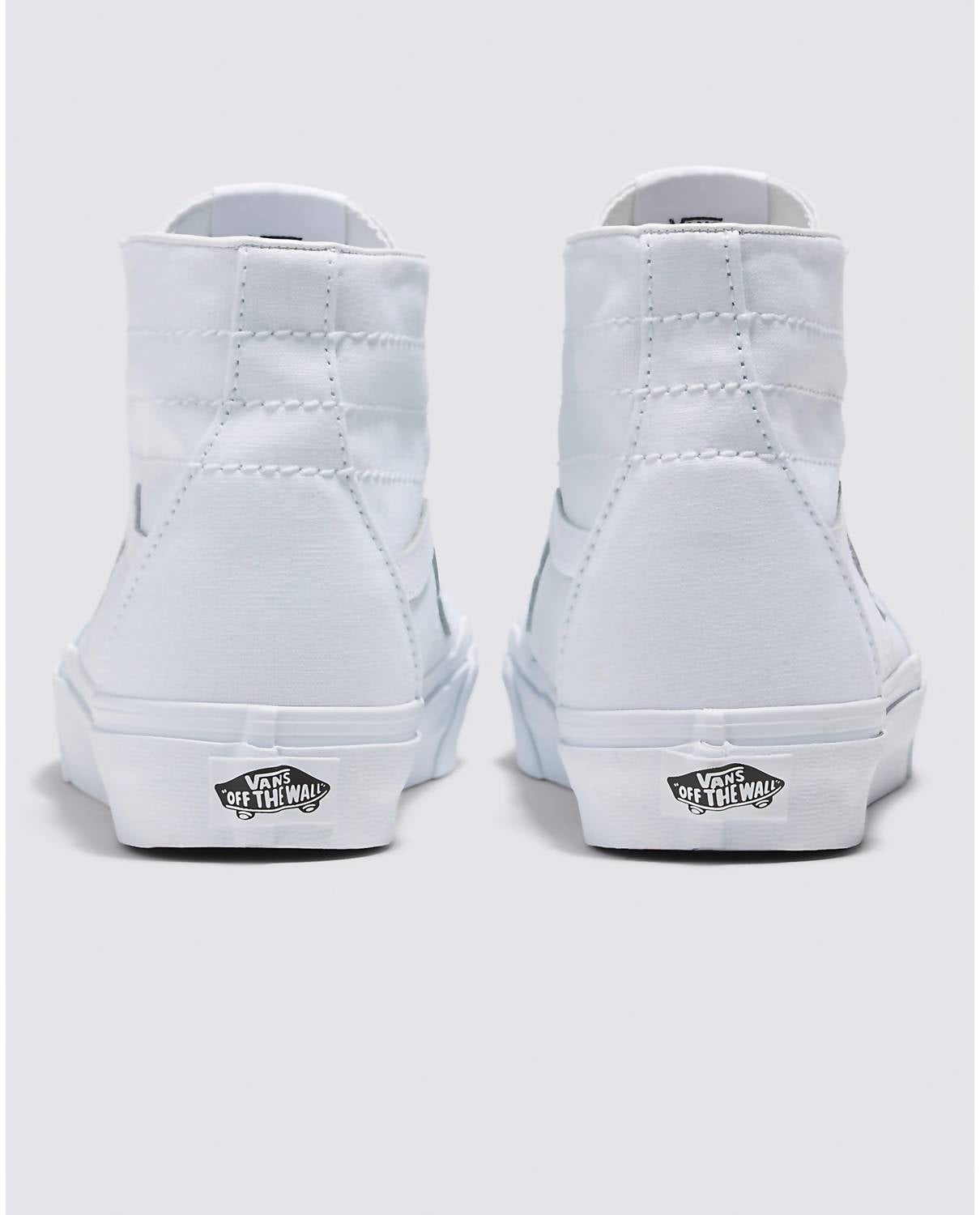 Experience the Vans Unisex Canvas Sk8-Hi Tapered Shoe, a minimalist sneaker reimagined in True White for those who appreciate simplicity and sophistication. Crafted from sturdy canvas, these adult sneakers provide the classic Vans stability with signature rubber waffle outsoles. The tapered design ensures a slim fit with a round toe and flat heel, perfectly embodying the "Off The Wall" ethos. Ideal for a spring dinner party, this versatile piece is a testament to Vans' commitment to being ahead of the game.