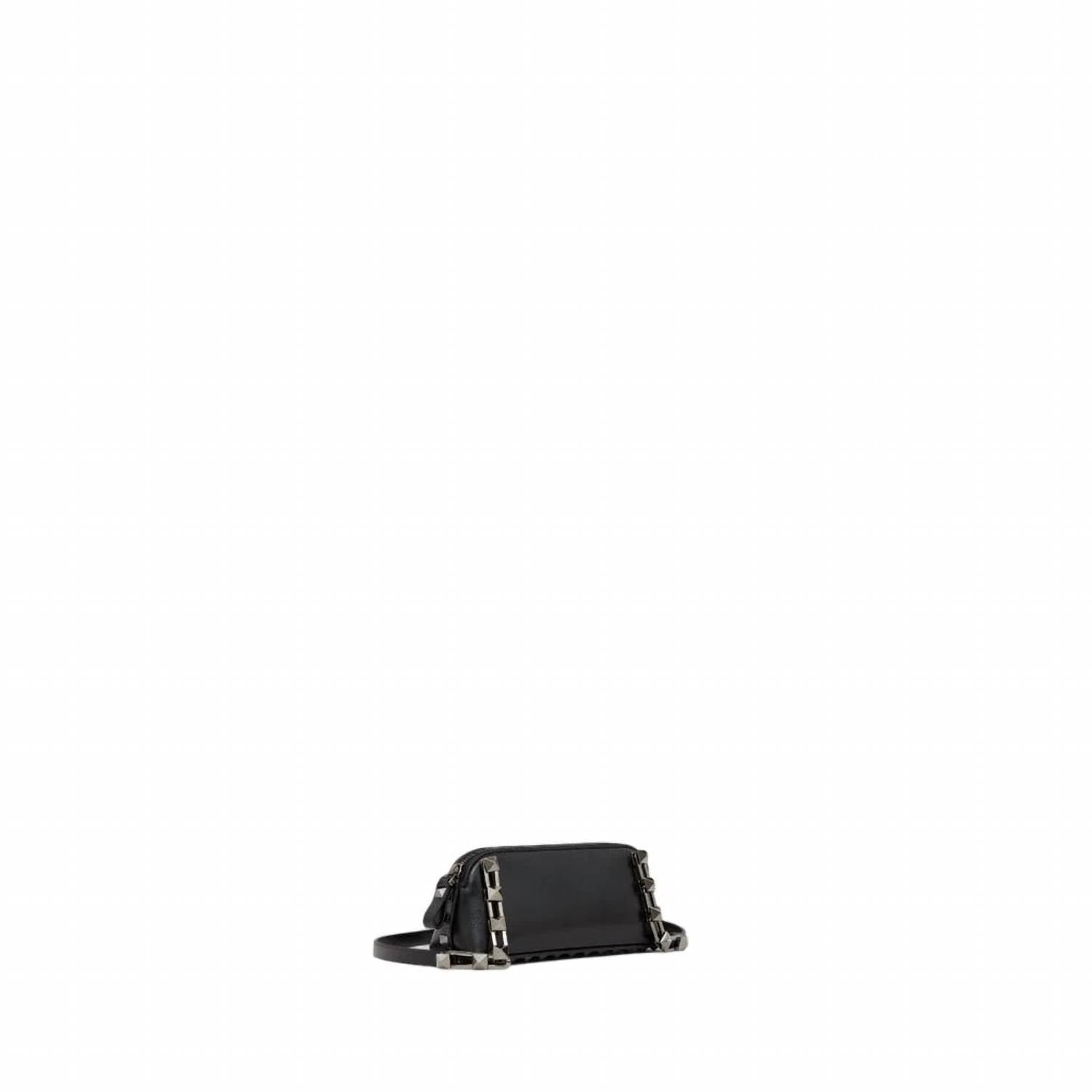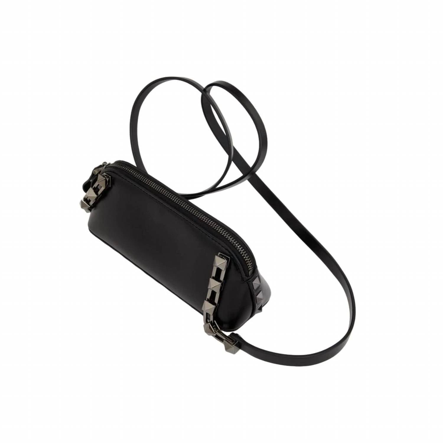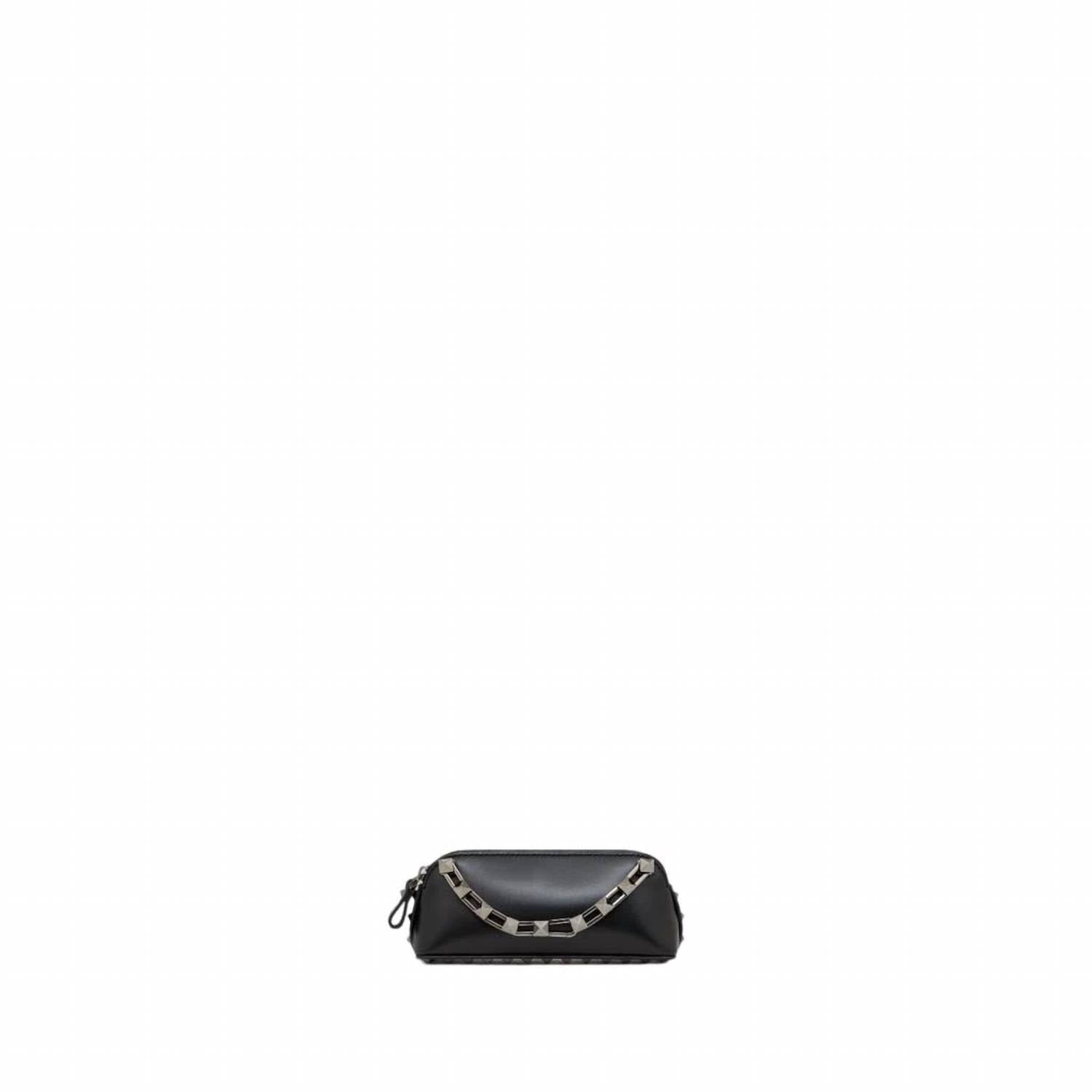 Lipstick, check. Mints, check. Credit card, check. The cutest little bag that holds all of your necessities. The Women's Mini Rockstud Clutch by Valentino Garavani is a striking accessory expertly crafted in Italy. Made from 100% calf leather with a 100% lambskin lining, this black clutch exudes sophistication and luxury. The design includes elegant chain details and iconic Rockstud rivets, with a zipper closure at the top for secure access. Featuring a detachable shoulder strap for versatile wear, this clutch combines style and functionality.