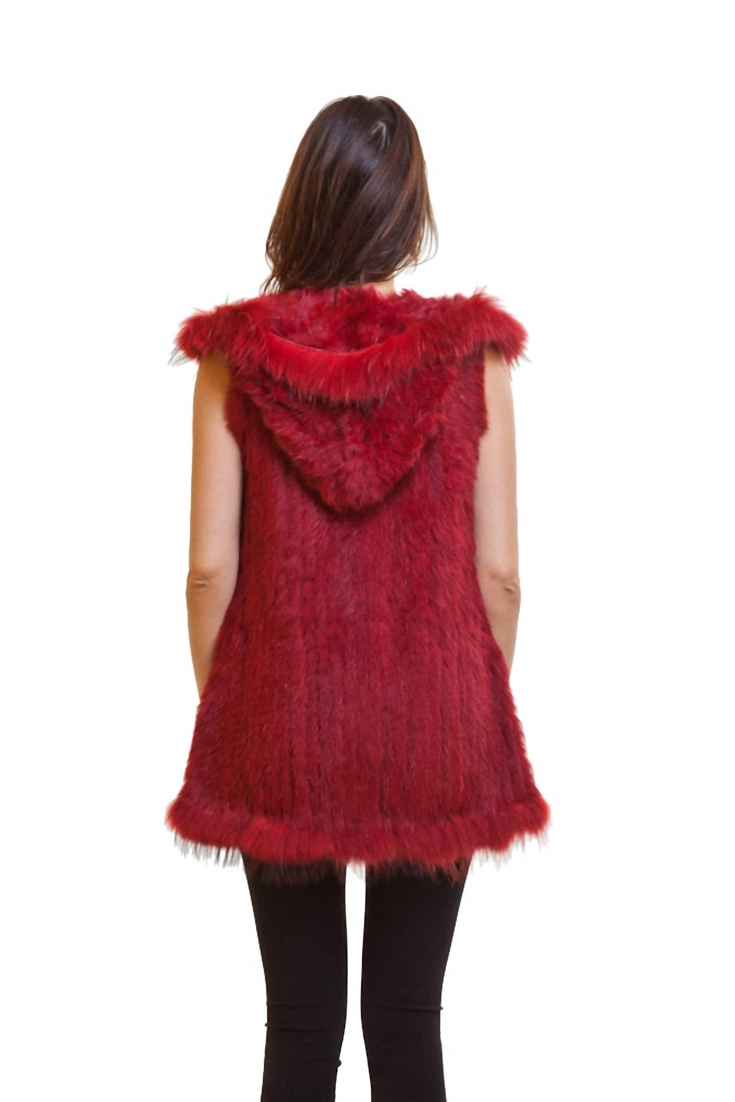 Long, hooded rabbit fur vest with raccoon trim. Body Fur: 100% Rabbit Fur. Trim: 100% Racoon Fur. Inner Mesh: 100% Cotton. Style LT06-07.