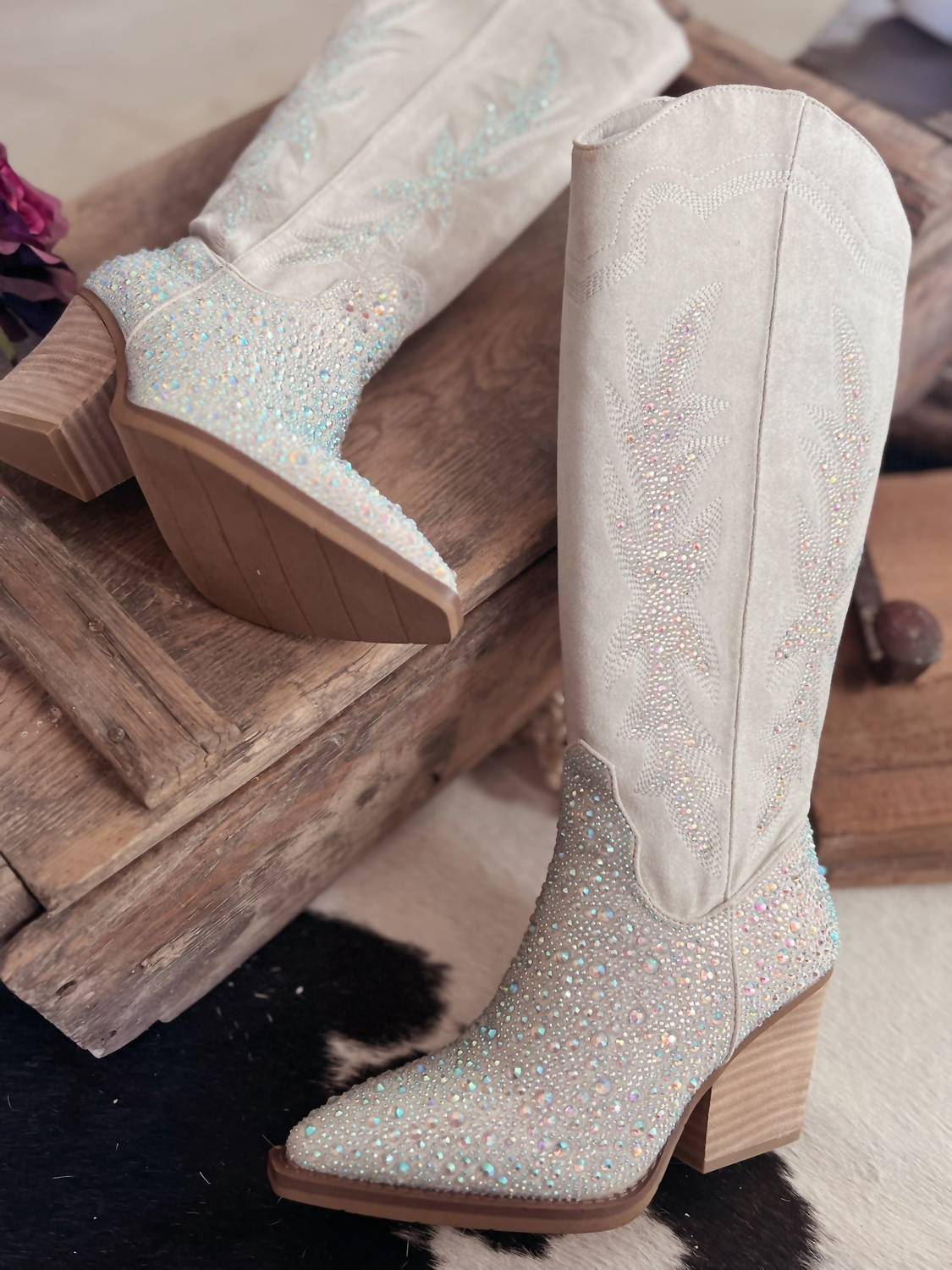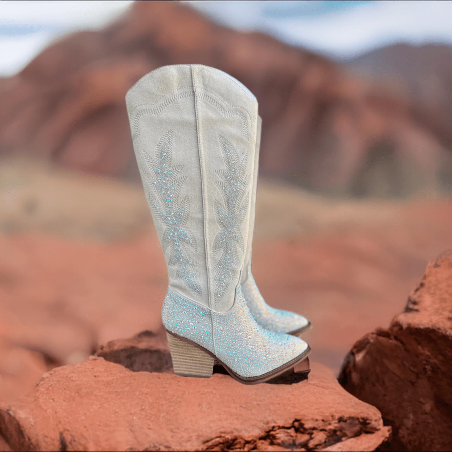 A trend that is here to stay. Elevate your footwear collection with the Women's Rhinestone Western Style Boots by Very G, perfect for adding glamour to any outfit. Designed in a classic grey, these boots showcase ankle iridescent rhinestone detailing and a striking side flared out feathered detail. They boast a pointed toe silhouette and are made from a soft suede-like material, with a convenient side zipper closure. Standing at a total height of 17 inches from sole to top, these boots feature a stylish 3-inch wooden block heel and a 14-inch calf length, ensuring both comfort and style.