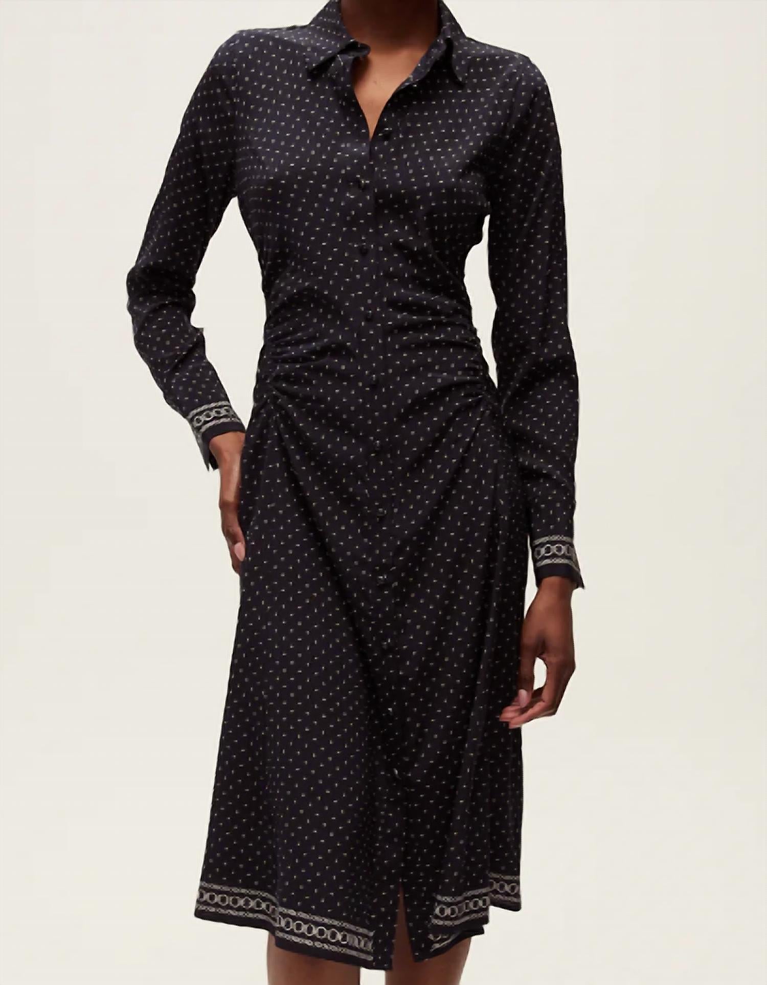 The pefect long sleeve dress for those cooler months. Meet the Lex Dress by Veronica Beard, a sophisticated choice for your fall wardrobe in Navy Multi. This shirt dress, ideal for a holiday party, features long sleeves with button cuffs and a collared V-neckline, offering a sleek sheath silhouette. Crafted from a luxurious 93% silk and 7% elastane blend, this midi dress falls gracefully below the knee. Its button closure adds a refined touch to the minimalist and solid design.