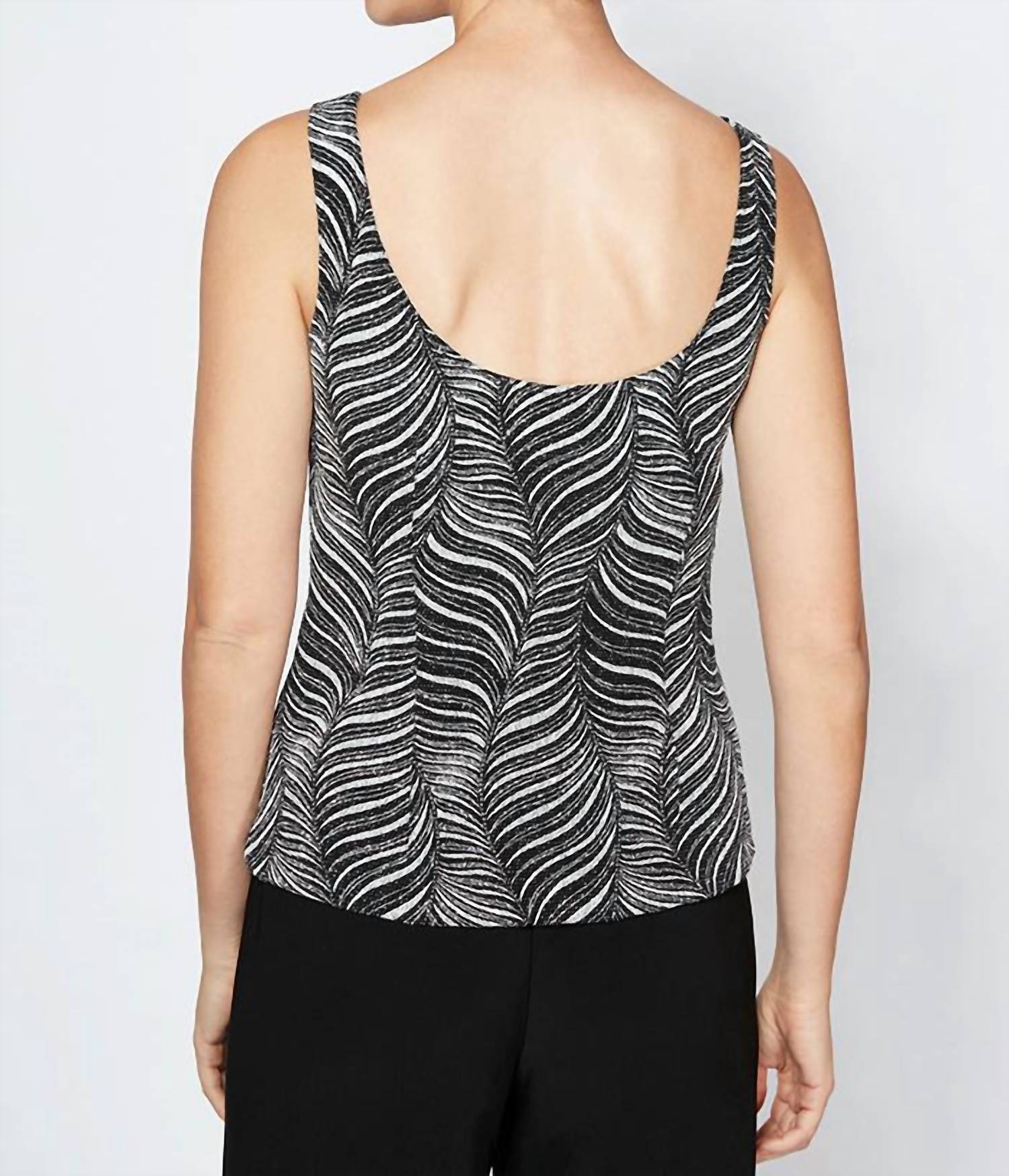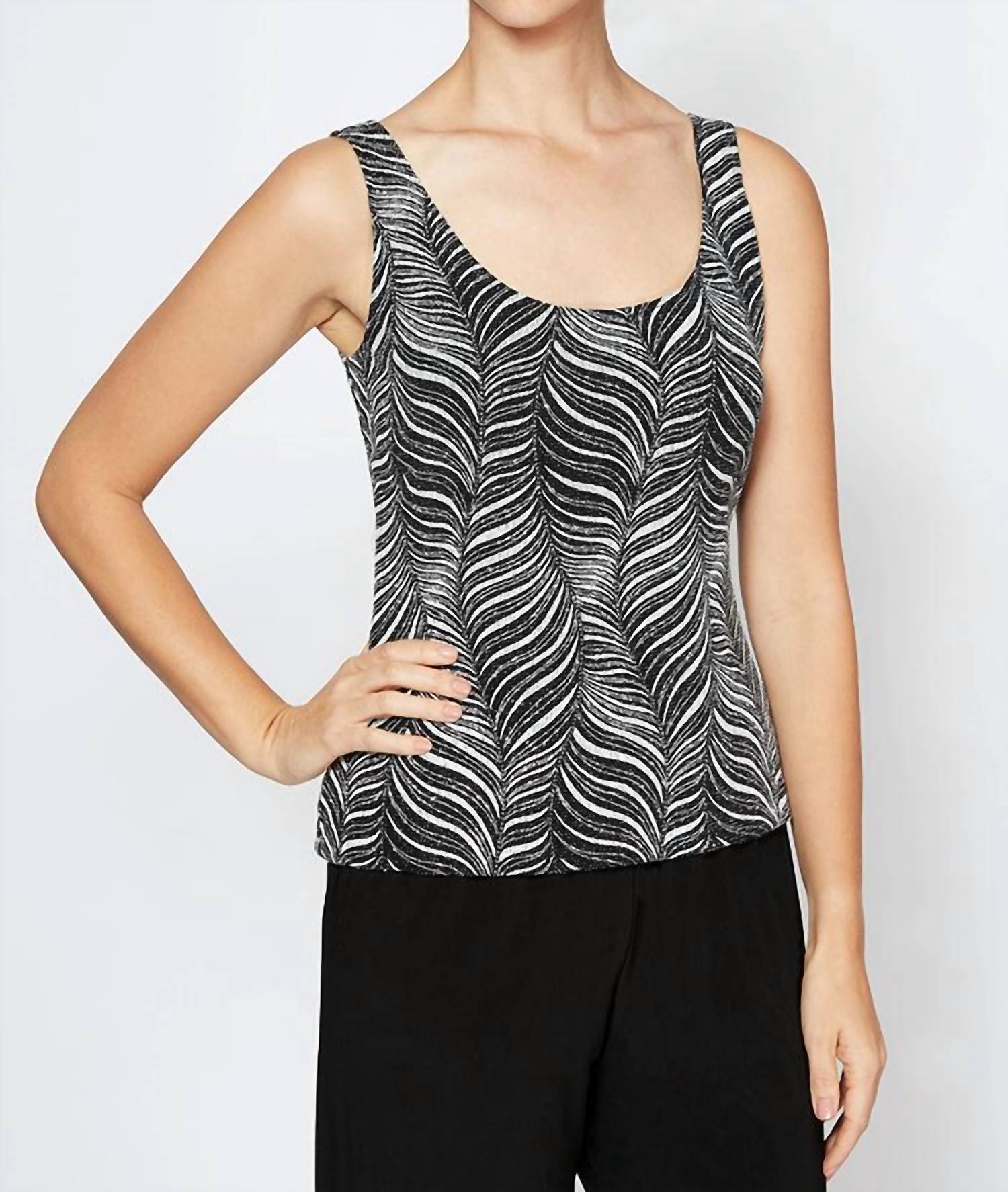 Loungewear doesn't have to be frumpy and this is exactly what we had in mind. Designed for a comfortable fit, this chic little number will be your favorite lounging-at-home look. Elevate your wardrobe with the Waves Glitter Printed Twinset by Alex Evenings, featuring a chic black and white pattern. The three-quarter sleeves in the mandarin neck jacket complement the scoop neck tank for a sophisticated and flattering silhouette. Perfect for any occasion, this loungewear set offers an elegant printed design. Care instructions: Hand wash and lay flat to dry.