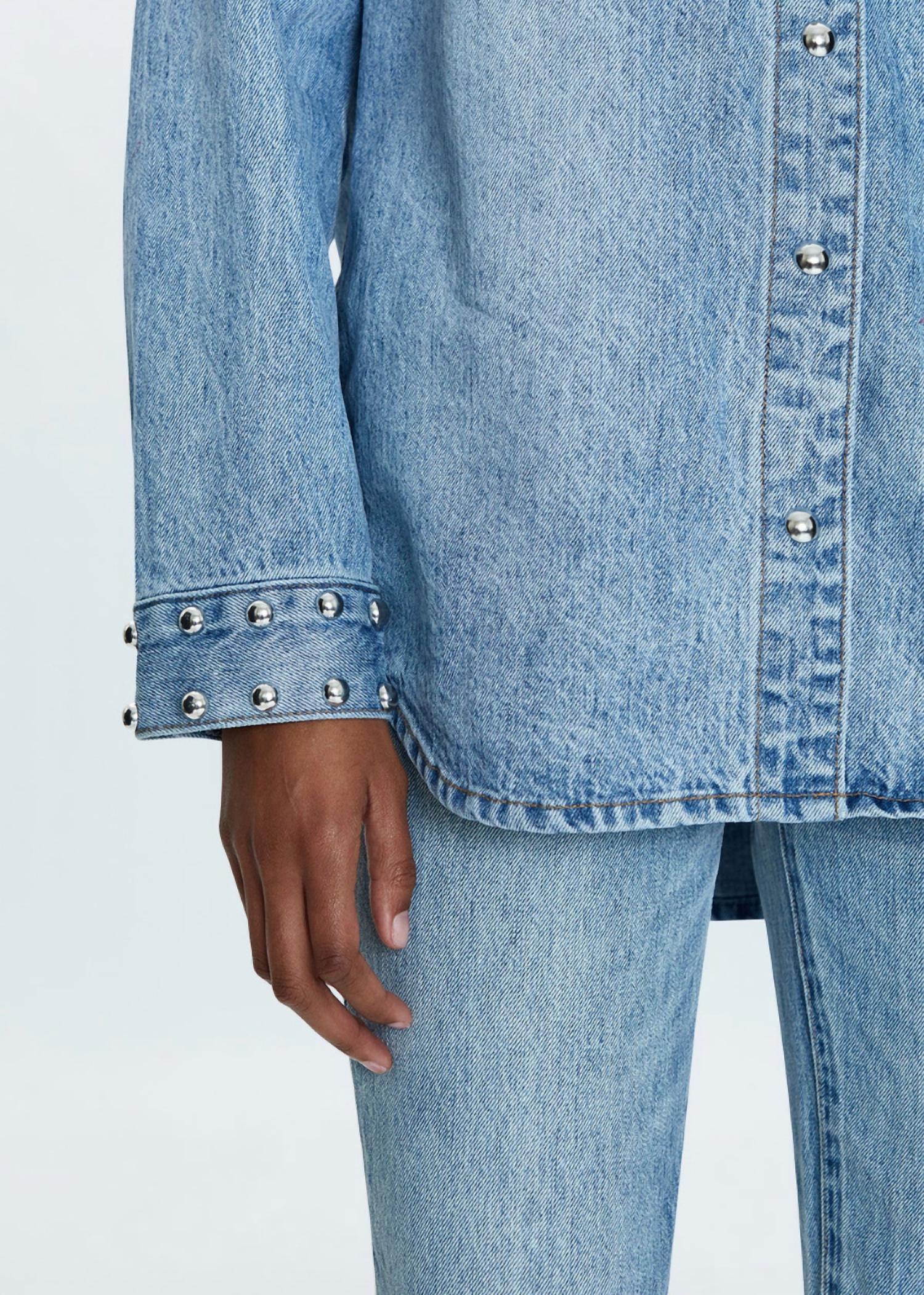 Oversized fit. 100% cotton. Satellite light blue denim wash. Long sleeves. Collared neckline. Button closure. Linear stud decorations. Front flap pockets. Vintage-inspired flair.