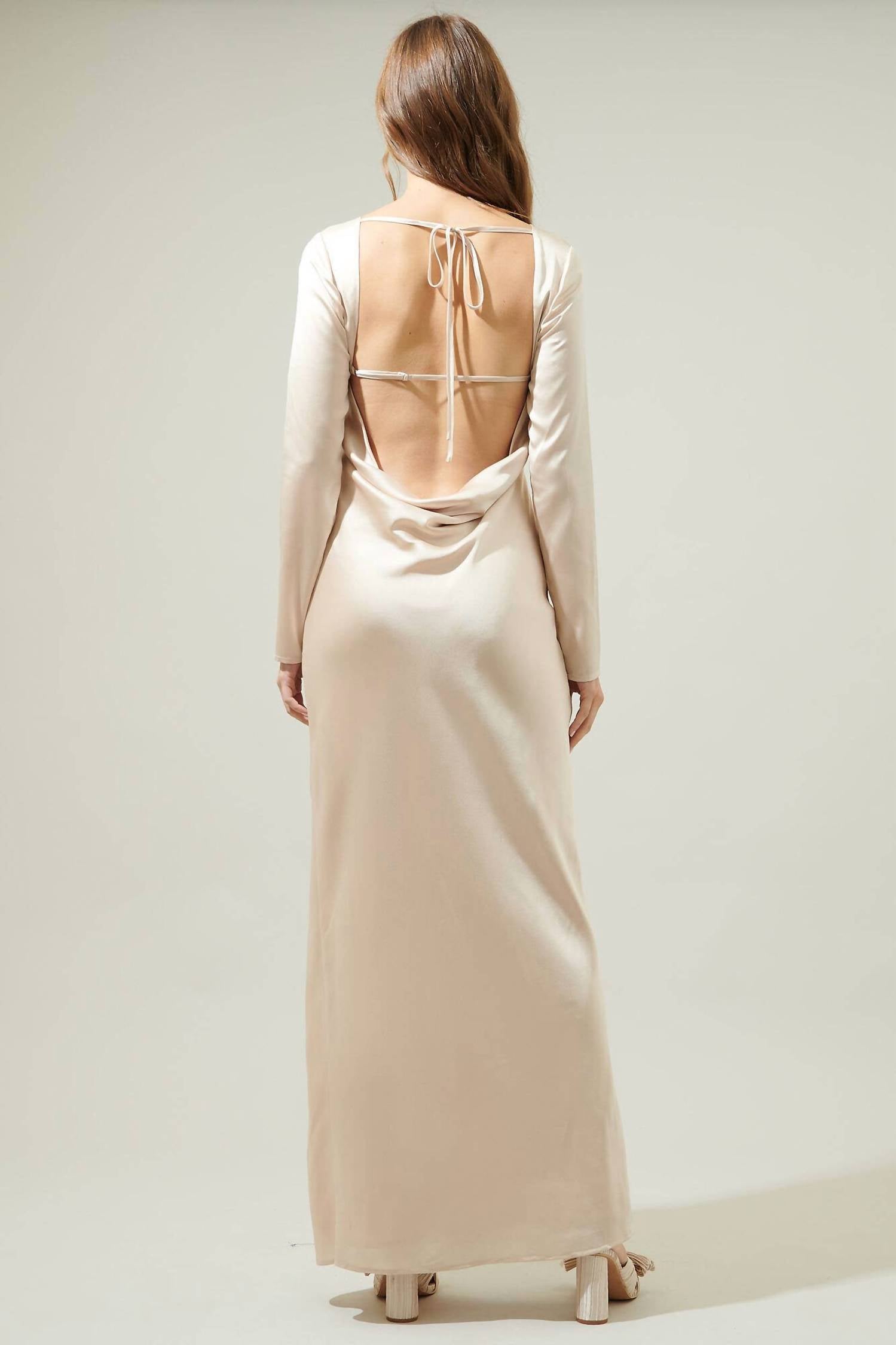 This backless dress is both polished and sexy and fit to flatter. Introducing the Romantic Spotlight Open Back Satin Dress by SUGARLIPS, perfect for making a memorable impression. This slip dress features long sleeves and an elegant open back with a tie closure. Crafted from smooth polyester in a chic champagne hue, it stretches to a striking 59" length with a thigh-high front slit for added allure. Designed for a straight fit and lined for comfort, it epitomizes quiet luxury, ideal for a sophisticated dinner party.