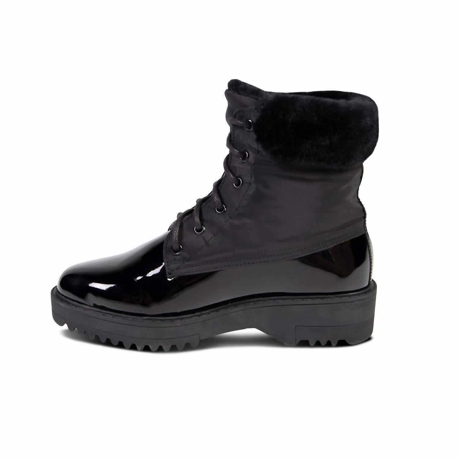 Model: CNS-173-2. Black patent leather, nylon upper and black sheepskin trim. A softly gleaming understatement, that shouts quietly from below. Lining: Wool blend. Insole: 100% Sheepskin. Upper: Patent leather. Sole: Rubber