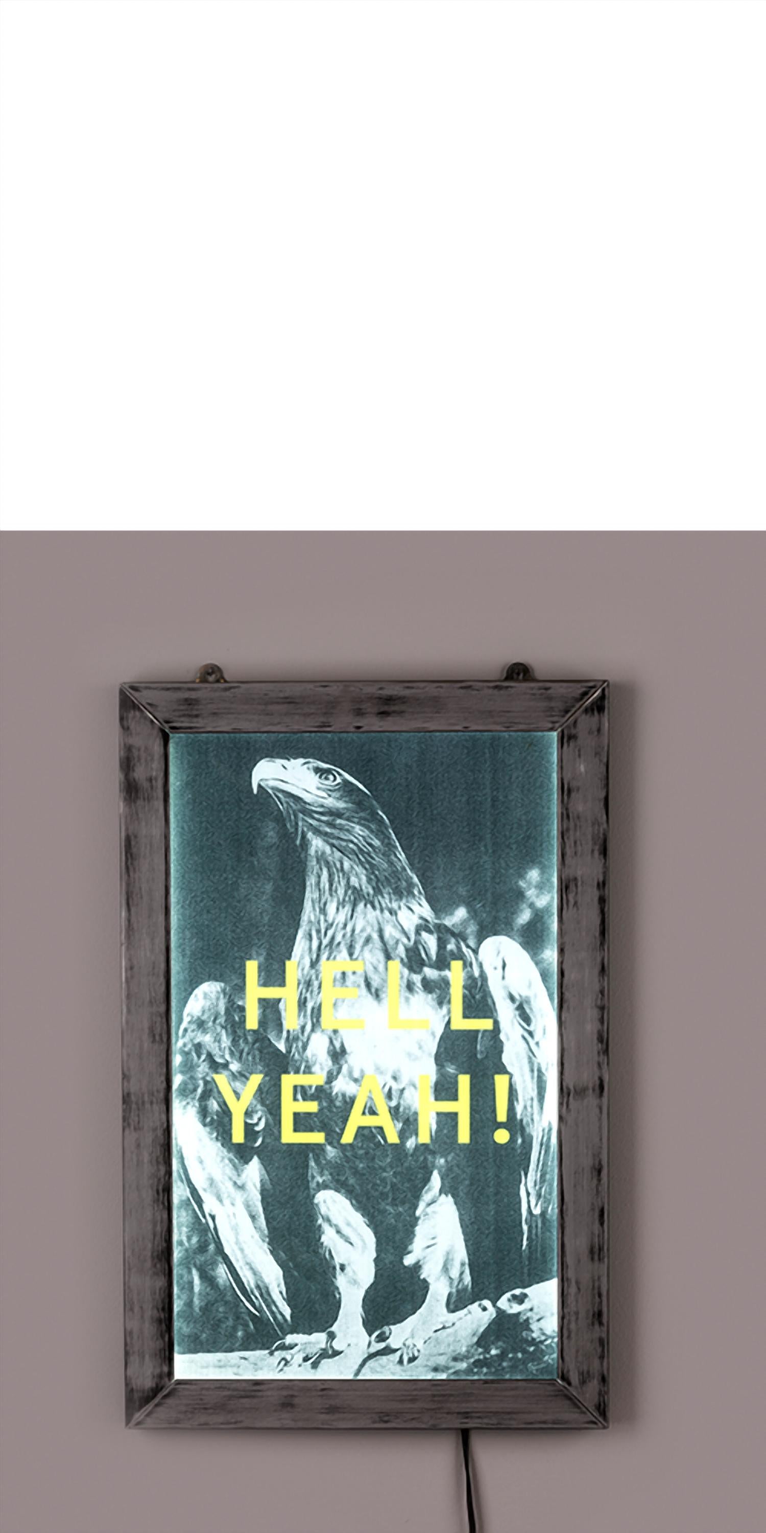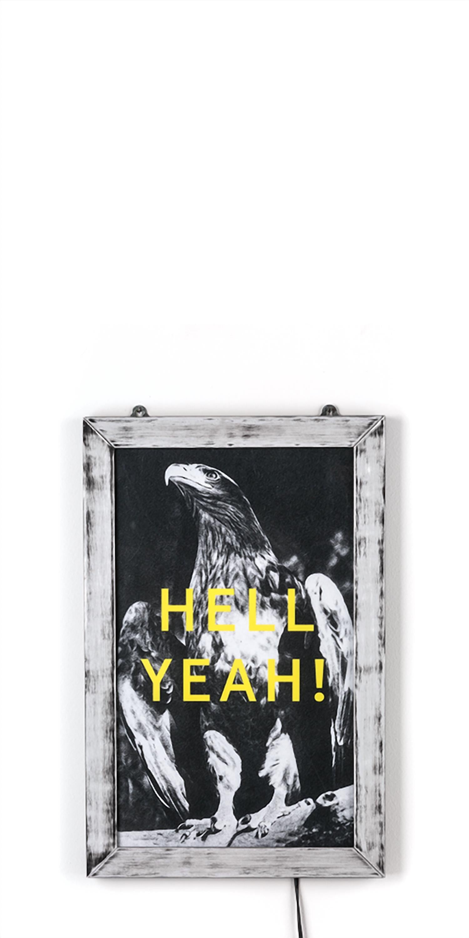 Illuminate your space with the stunning Hell Yeah! Bright Poster by Seletti/ Eye-catching piece features an LED-lit black aluminum frame that measures L 9.4" x H 14.5", with an interchangeable and removable glossy plastic poster sized at L 8.4" x H 13.6". Set includes a transformer and operates with LED light technology at 230V – 50HZ, with an output of 12V. Made for indoor use, this dynamic decoration makes a bold statement in any room.