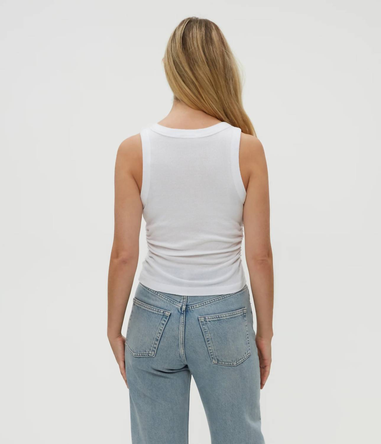 The perfect crop top for those warmer weather days. Introducing the Ella Shine Tank Top by Michael Stars, a minimalist piece perfect for summer vacations. This sleeveless tank features a scoopneck and a cropped, body-skimming fit, with ruching on the sides for a flattering contour. Made in the USA, it is crafted from Michael Stars' signature Shine fabric, composed of 58% Cotton and 42% Nylon, known for its subtle sheen and softness. Closure: Pull-on.