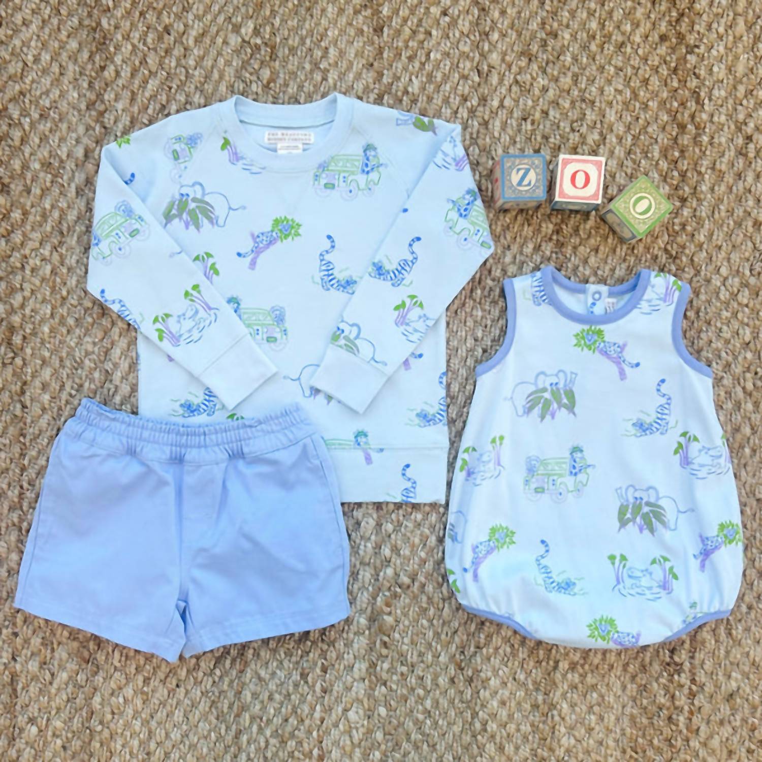 The Beaufort Bonnet Company's Boy's Cassidy Crewneck is a must-have for spring vacations, featuring a playful Millers Silly Safari / Buckhead Blue pattern. Made with a comfortable crewneck design, it ensures a perfect fit for your little one. Care for this patterned pajama top is simple with machine wash instructions and laying flat to dry. Ideal for boys seeking comfort and style.