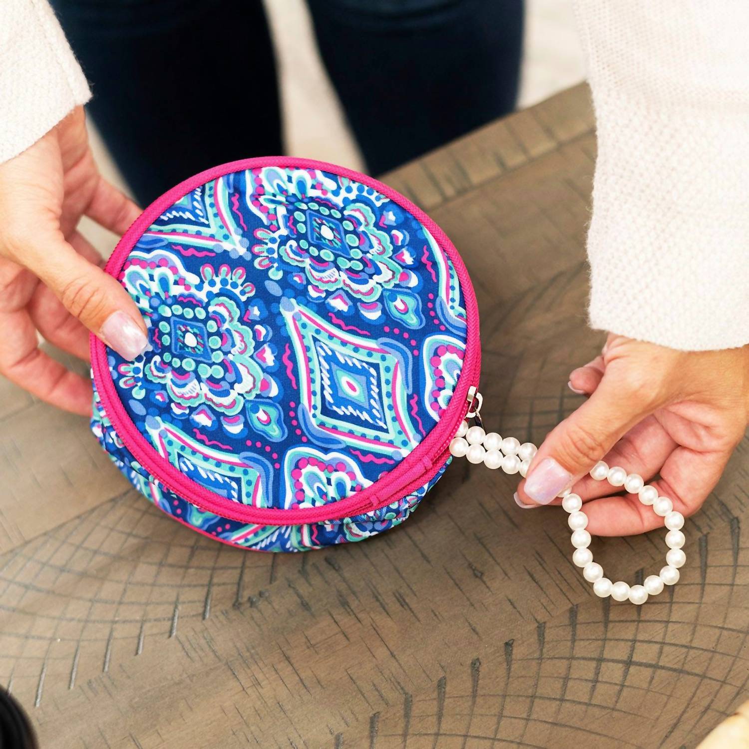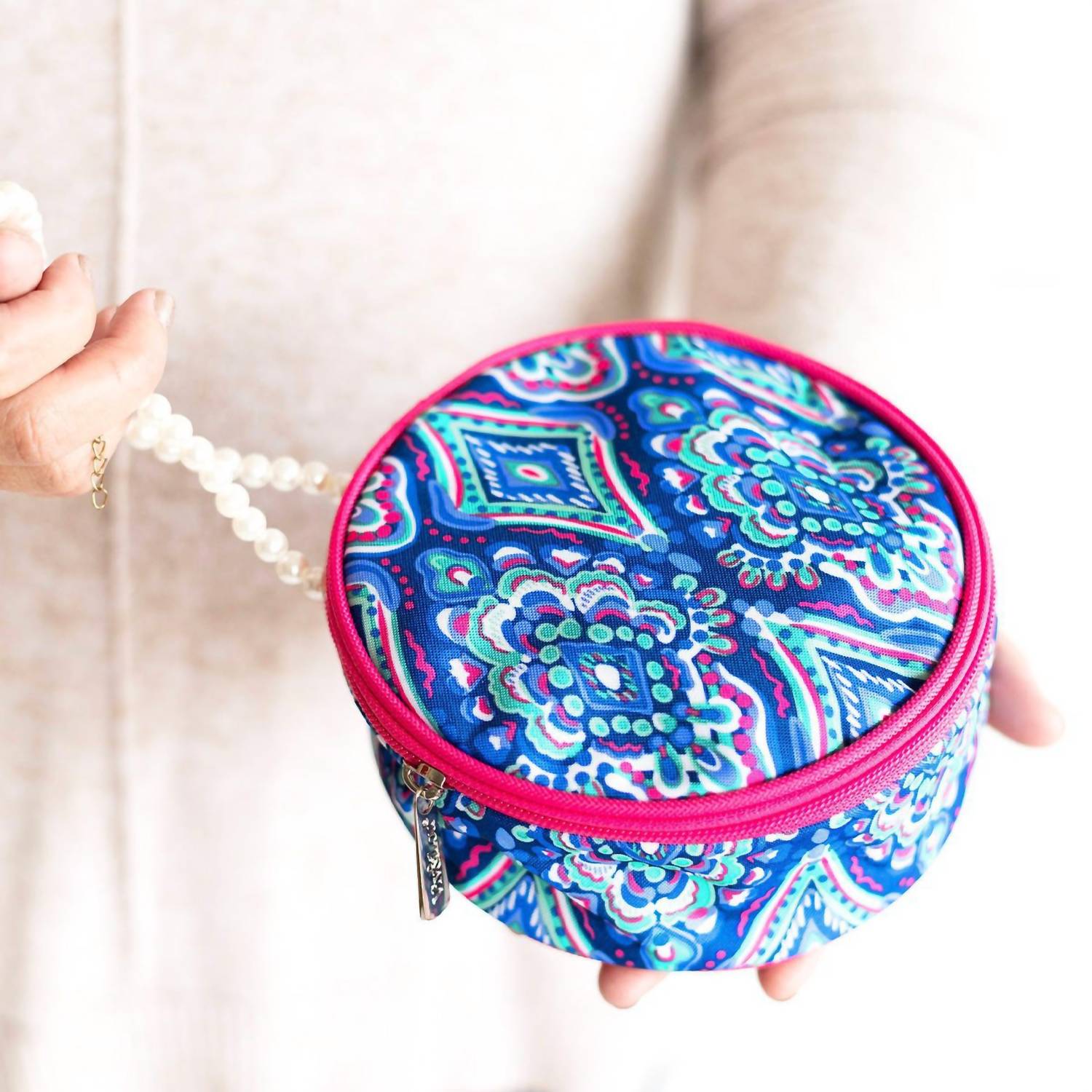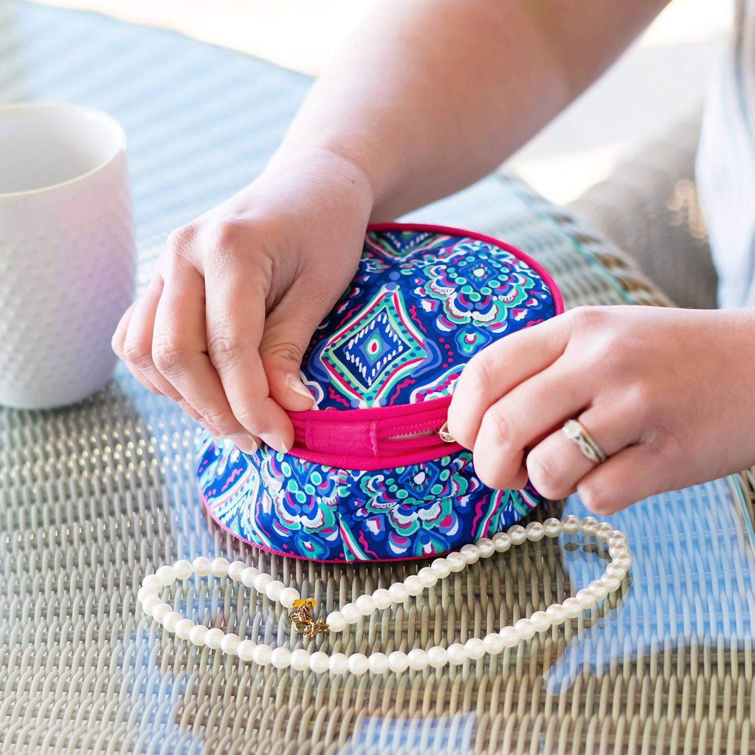This Women’s GypSea Jewelry Case is made from durable polyester and features a zipper closure with eight mini interior pockets for organized storage. Its 6” radius and 3” height make it perfect for both home and travel use.