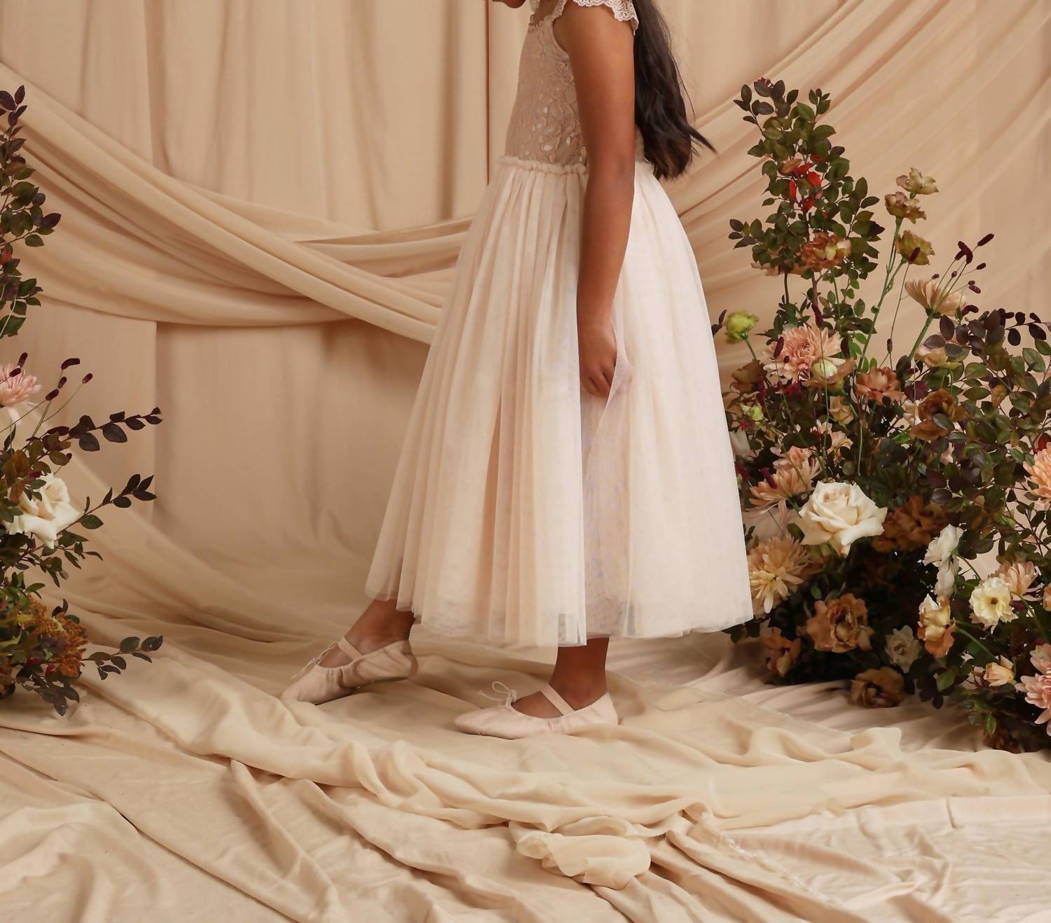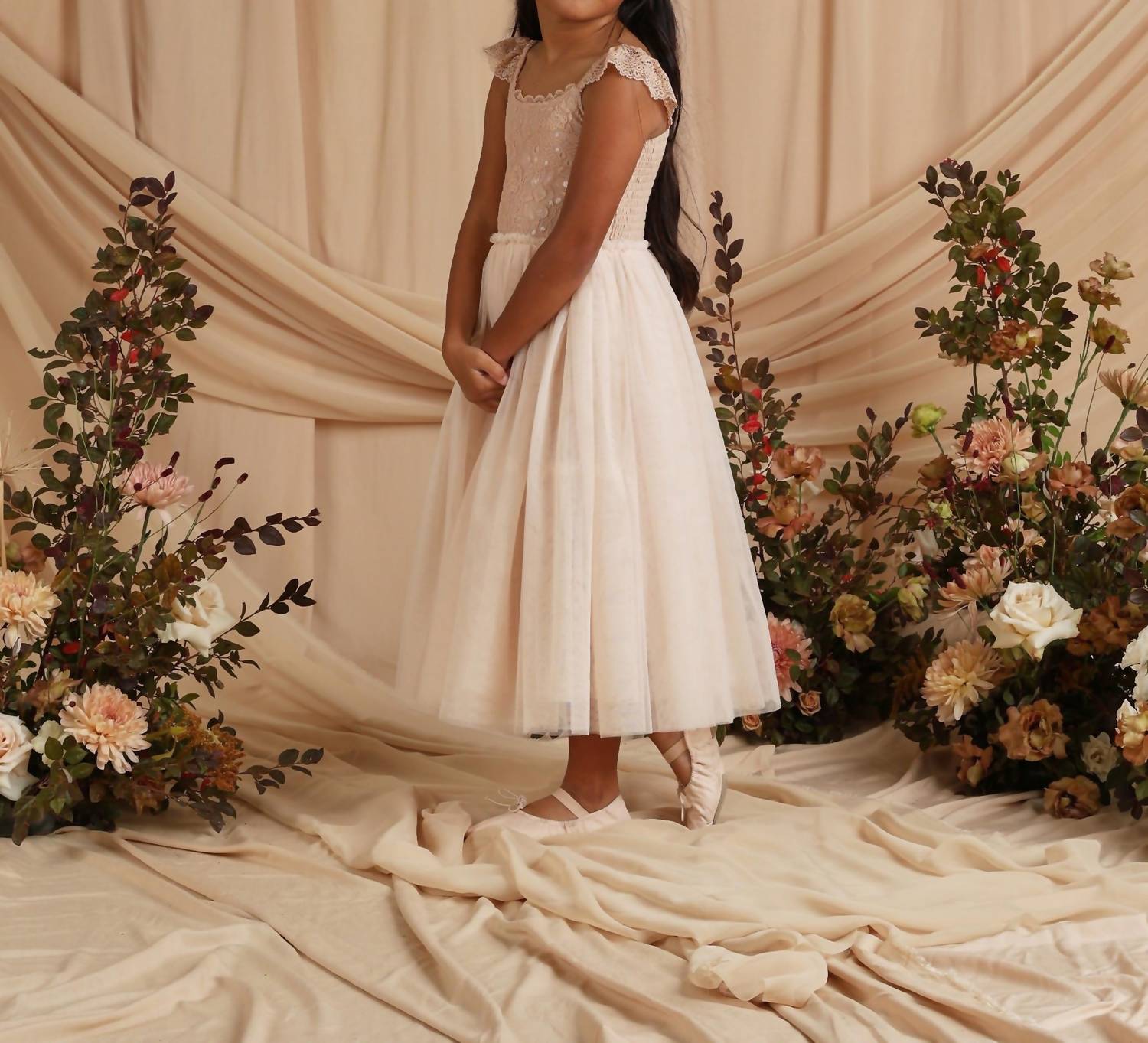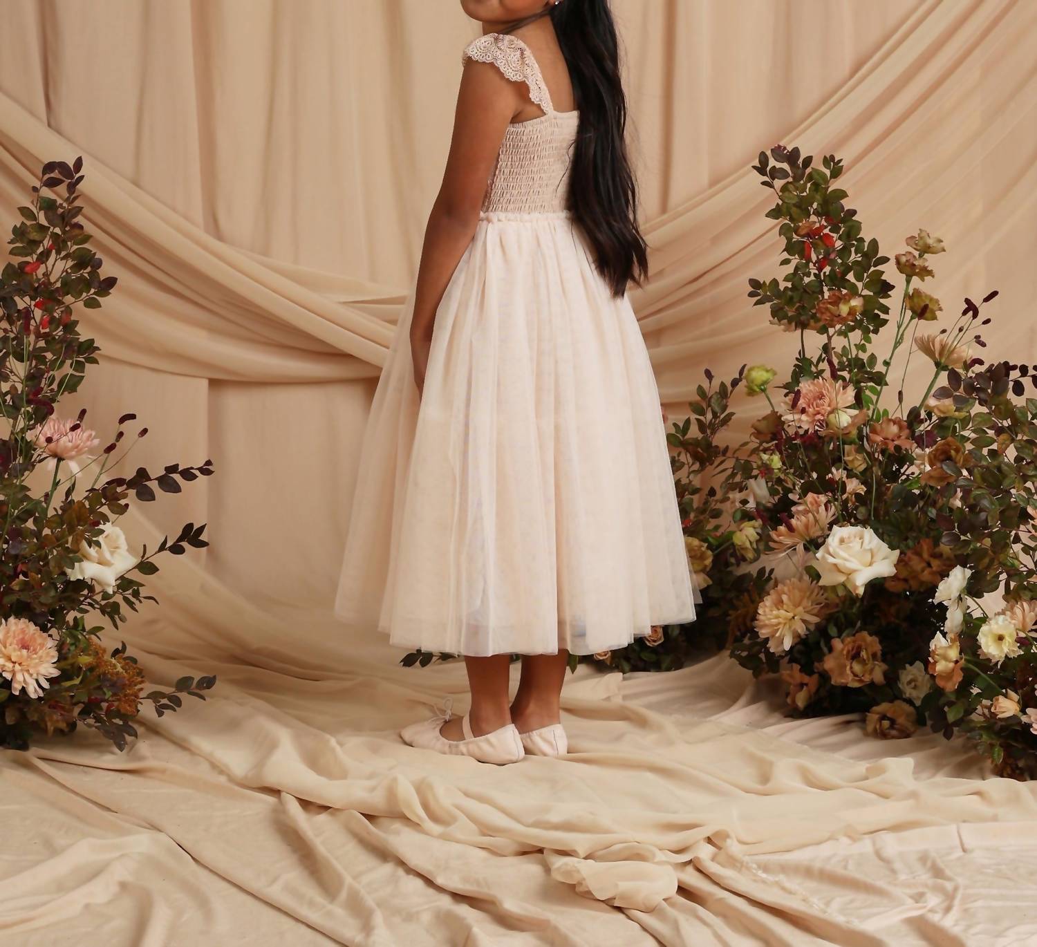 Introducing the Kid's Camilla Dress by NORALEE, a perfect choice for your little flower girl in an antique hue. This formal dress is designed with delicate flutter lace sleeves and a full skirt crafted in layers of tulle, making it ideal for weddings and special occasions. The bodice features a detailed lace overlay on a soft cotton jersey liner, ensuring comfort with its fully lined interior. Composition includes Tulle: 100% Polyester, Lace: 54.1% Polyamide, 31.3% Viscose, 14.6%, with Upper Bodice Lining: 100% Cotton, Lower Bodice Lining: 100% Viscose. Care: Machine wash cold and hang to dry, but avoid tumble drying to prevent shrinkage.