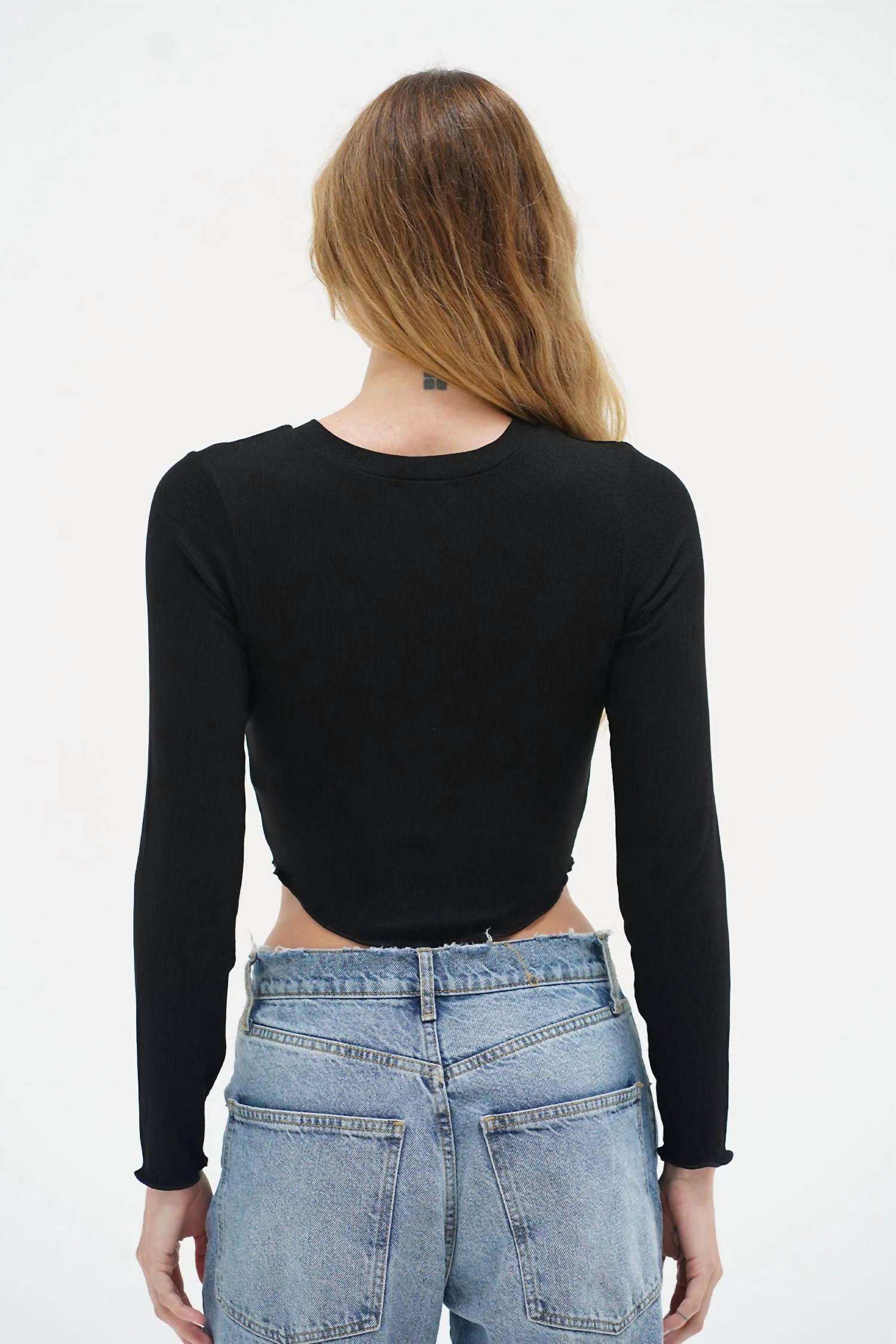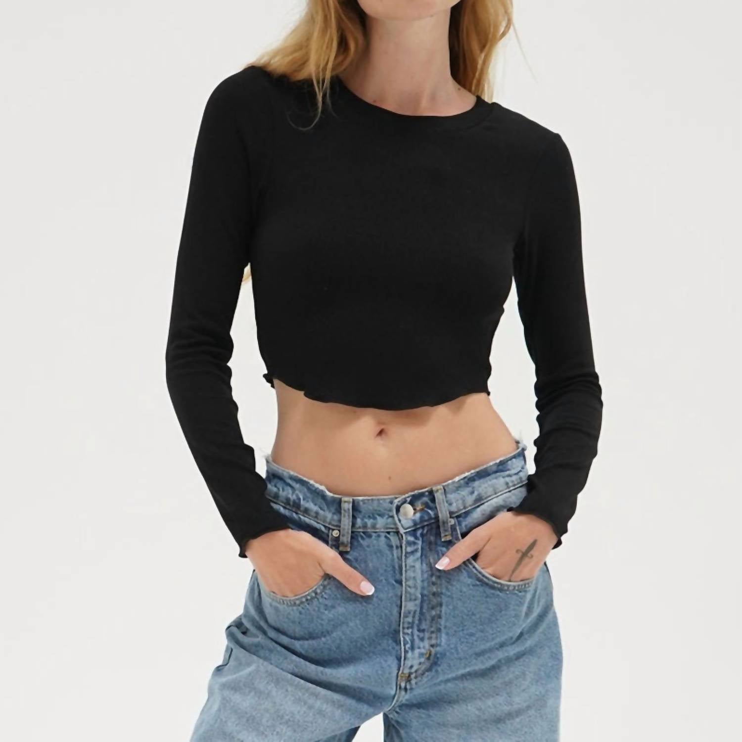 The perfect crop top for those warmer weather days. The Arya Ribbed Long Sleeve Top by LNA is a stylish and solid black crop top perfect for evening events or a casual daytime look. Crafted in the USA, this top features a crewneck and pull-on closure, composed of 95% Rayon and 5% Spandex for a light and airy feel. Ideal for layering, it pairs perfectly with high-waisted leggings or denim pants. Care for it by machine washing on a gentle cycle and laying flat to dry.