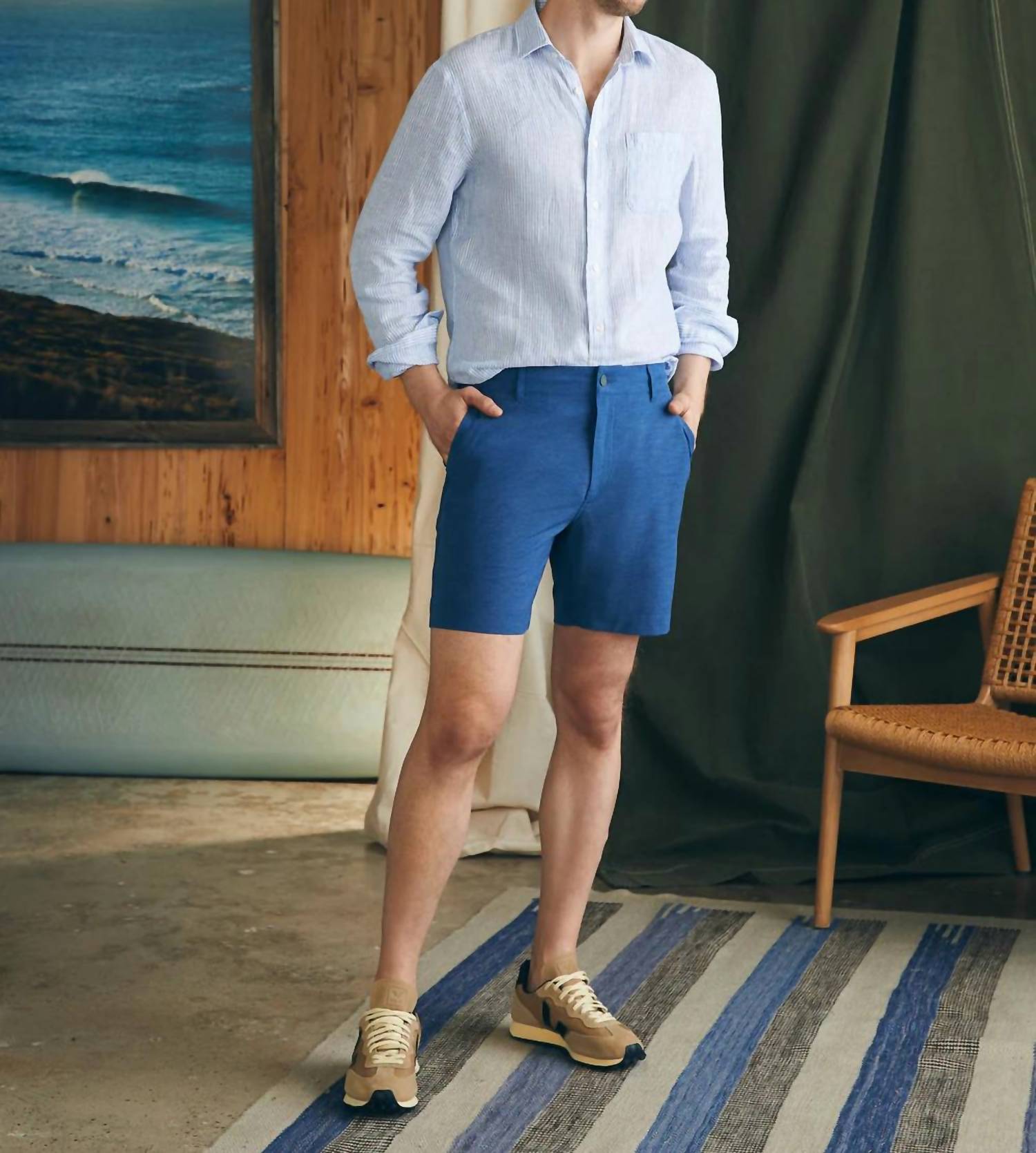 Meet the Faherty All Day™ Shorts in khaki, a stylish and functional hybrid essential for men. These shorts have a relaxed fit with a straight leg, featuring a 7" inseam suited for effortless summer style. Crafted from a premium blend of 75% recycled polyester, 17% cotton, and 8% elastane, they provide water-repellent technical performance with a soft, natural feel. Complete with an interior drawstring, mesh-lined side slash pockets, and a convenient back zip pocket, these shorts ensure all-day wearability with a button and zip fly closure. Care: Machine wash cold and tumble dry low. Model Steven stands at 6'2" and is wearing a size 32".