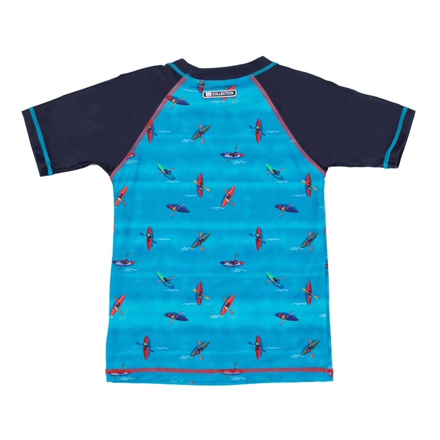 Introducing the Kayak Short Raglan Sleeve Rashguard Tee by Noruk Collection, crafted for boys with a focus on sun protection and style. This blue tee features short, contrasted raglan sleeves and a unique kayakers print on both front and back, offering UPF 50+ protection. Made from a blend of 82% polyamide and 18% elastane, it ensures comfort and flexibility. Care: Hand wash to maintain the vibrant design and material integrity.