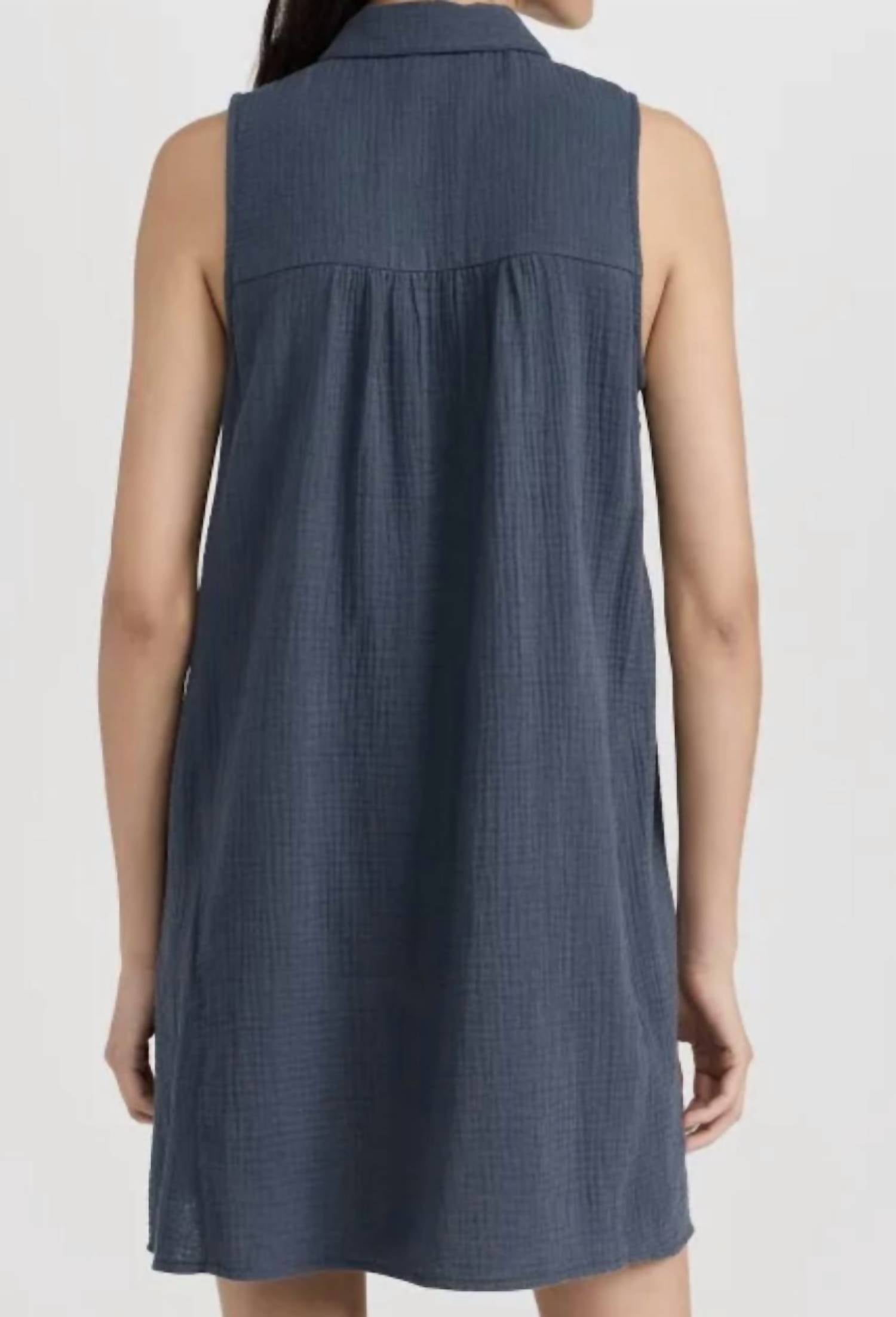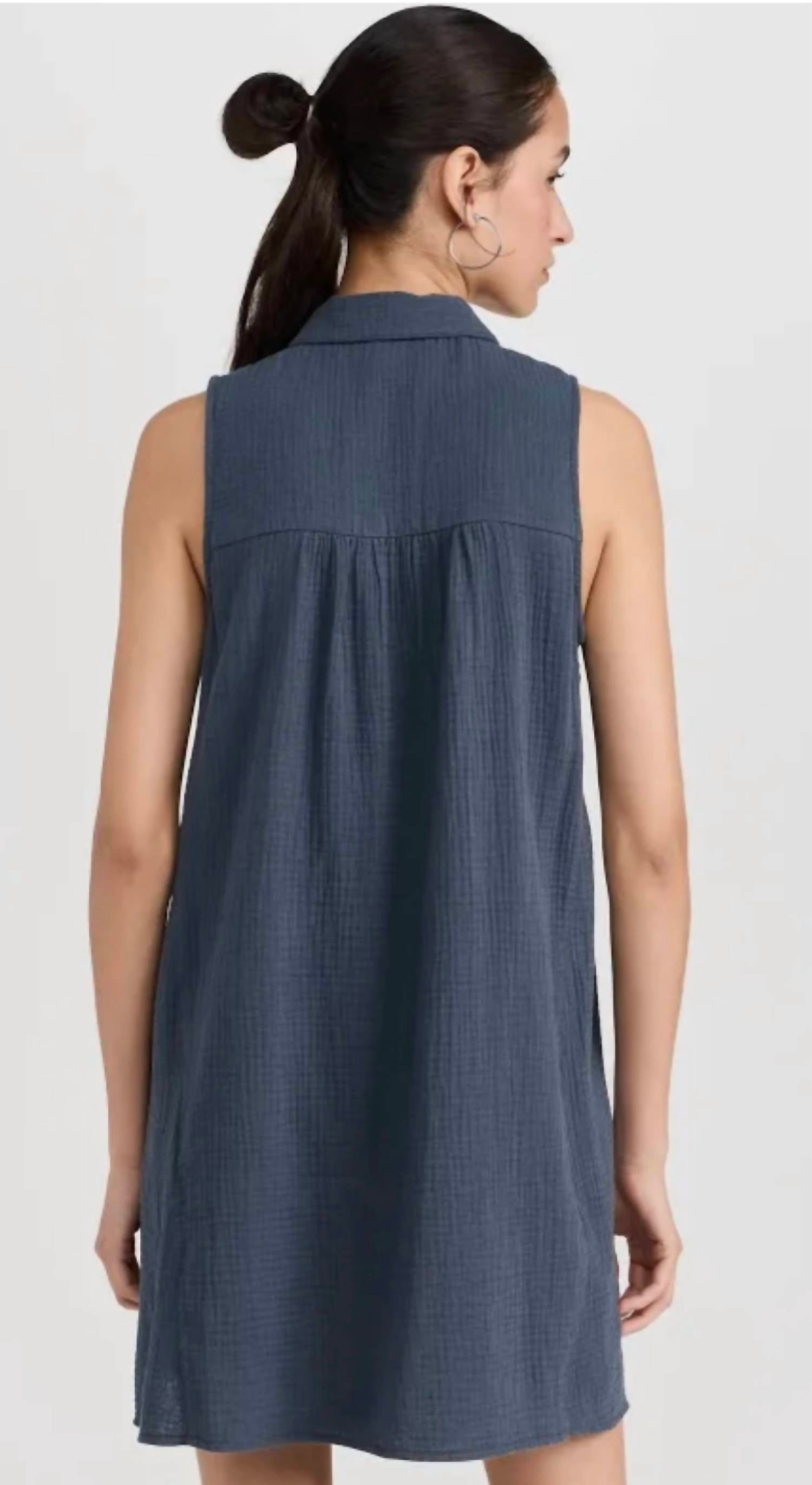 Collared neckline. Button down closure. Sleeveless. Front pockets.