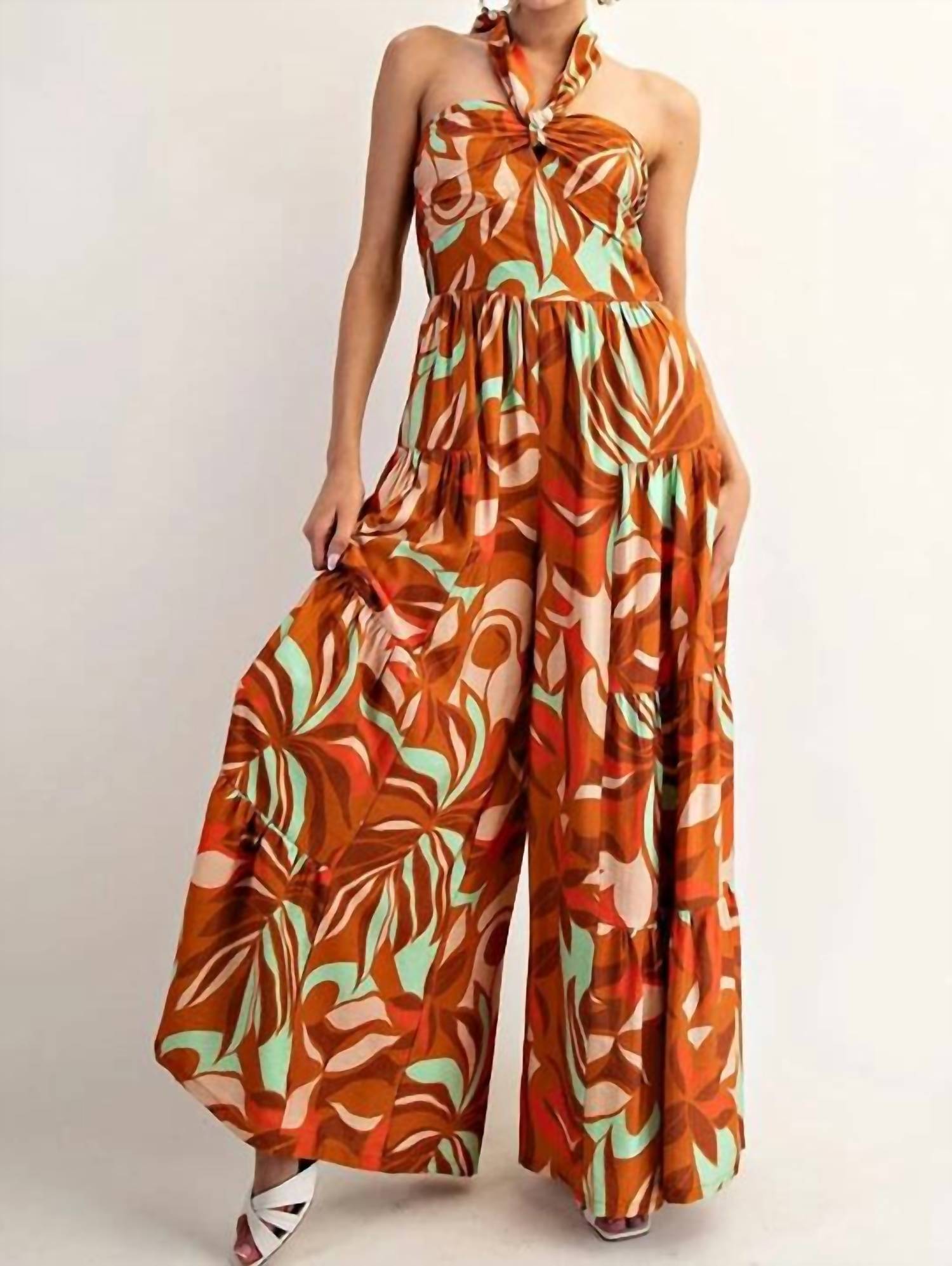 Discover the vibrant Ginger Halter Jumpsuit by ee:some, a perfect summer staple for your vacation wardrobe. This stylish piece is sleeveless and crafted from 82% Rayon and 18% Nylon, with 100% Rayon for a smooth finish. Its standout features include a twisted halter neckline, smocked back panel, and a flowy, wide-leg silhouette enhanced by tiered seaming. Closure is a convenient tie closure. Model is 5'8" and wearing a size small.