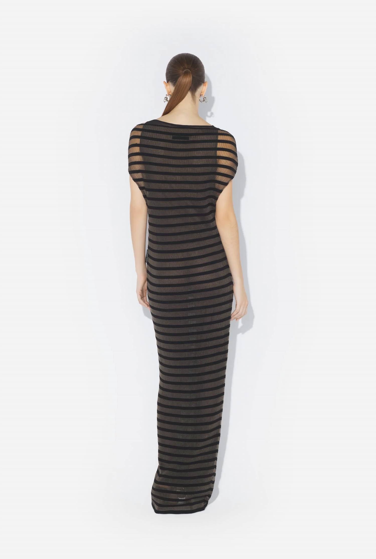 A maxi dress that is just as cute as it is comfortable. Embrace elegant sophistication with the Jean Paul Gaultier Nylon Long Dress, featuring a striking semi-transparent black knit with matte tonal Marinière stripe detail. This maxi dress in a bodycon silhouette offers a comfortable crew neck and lining underneath. Crafted from a blend of 70% viscose and 30% polyester, this exquisite piece is made in Italy. For maintenance, ensure to dry clean only.
