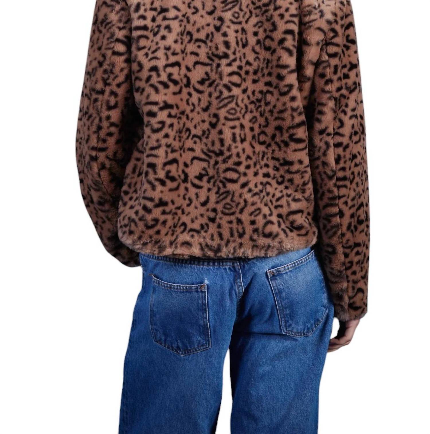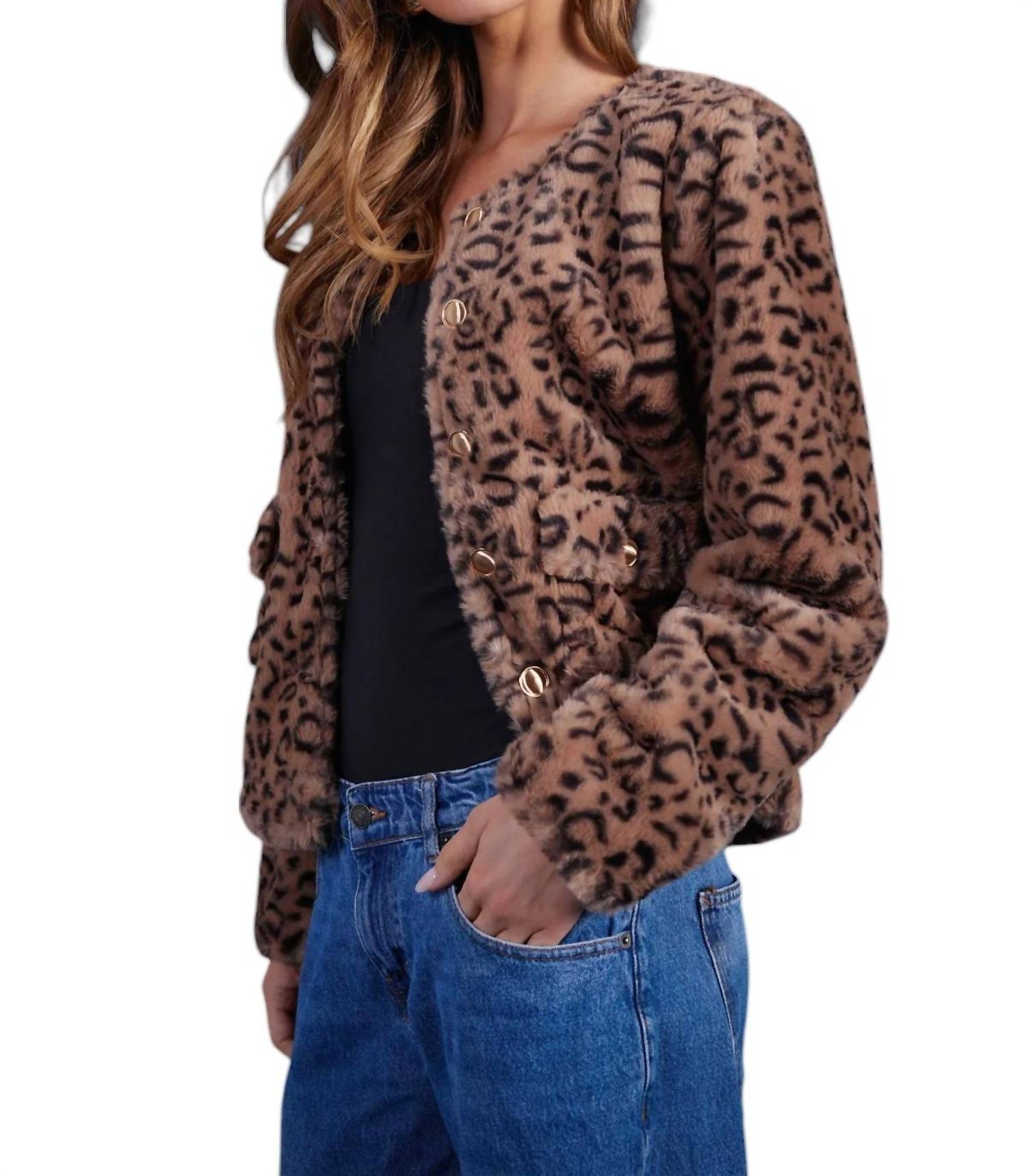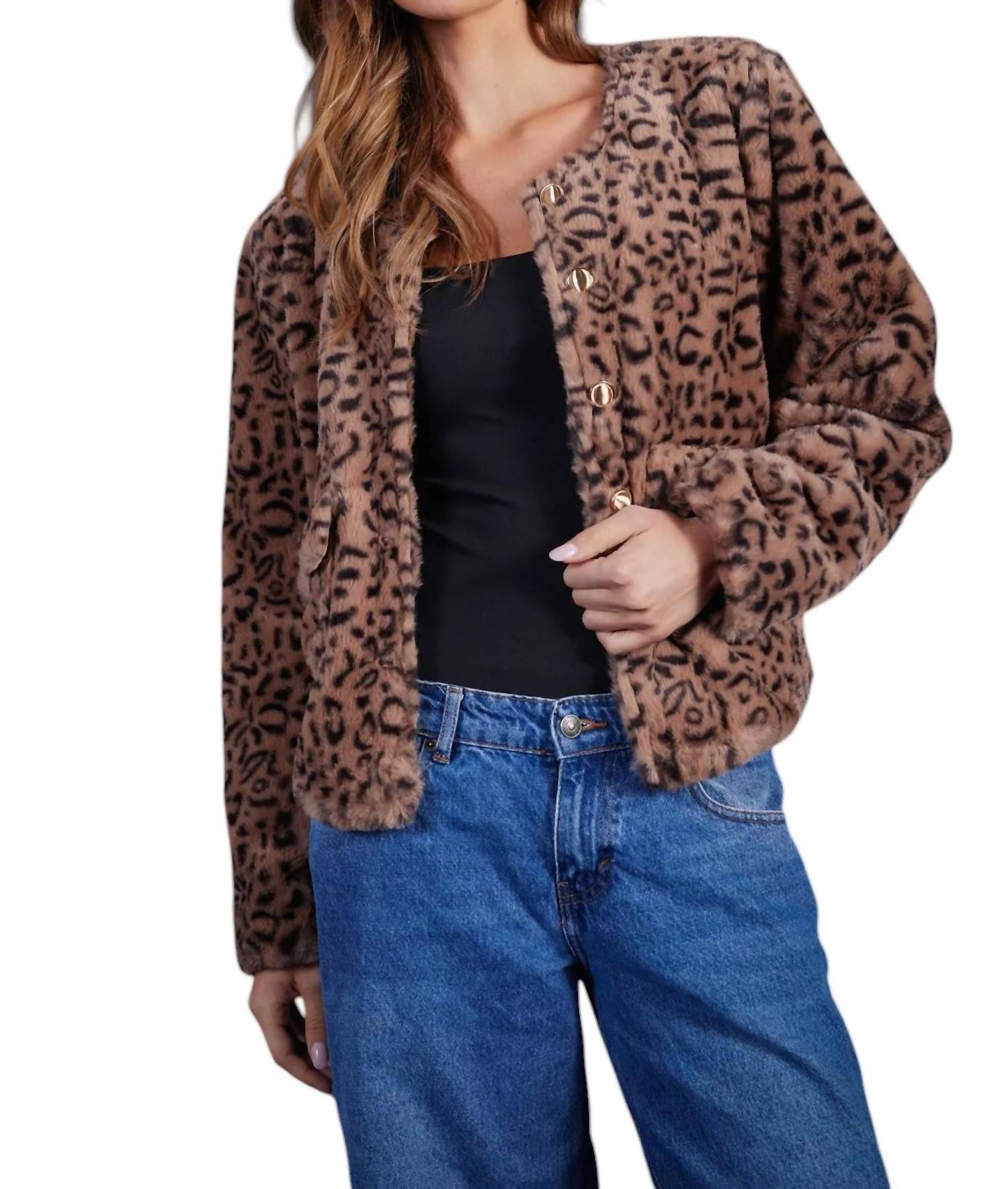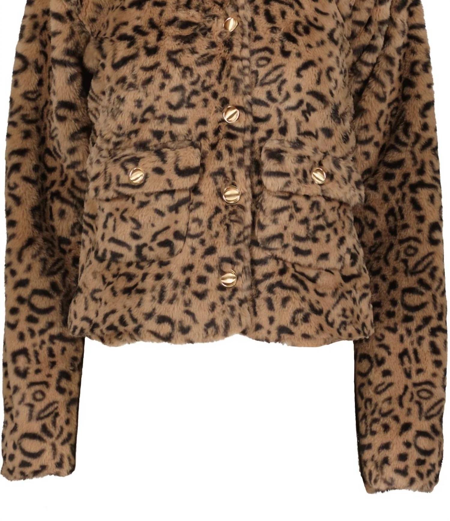 This hip-length faux fur jacket features a playful animal print and gold button accents. It has a scoopneck, button front closure, and front pockets. Made from 50% rayon and 50% tencel. True to size. Dry clean only.
