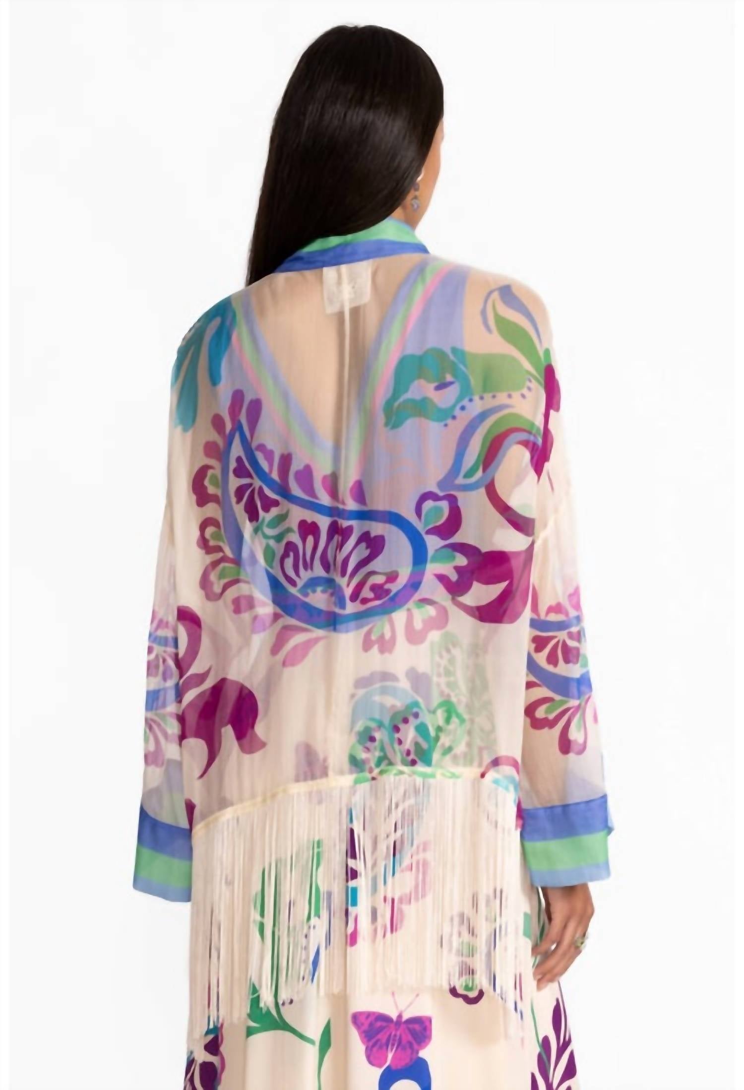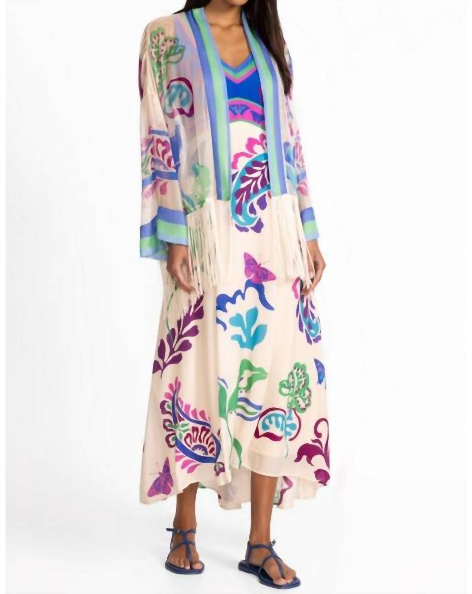 Throw on this amazing cape for extra warmth and style during the cooler seasons. Crafted from 100% luxurious silk, the Sunset Fringe Kimono is adorned with an ornate pattern in rich, saturated colors. Designed with an open front bordered with bold, contrasting stripes, this vibrant kimono is finished with an eye-catching fringe trim. Wear it over the Joni's Dream Lottie Maxi Dress to complete your evening out, or layer over a silk cami and pair with denim for a casual ensemble, perfect for a brunch date. The model is 5'10" and wearing a size Small.