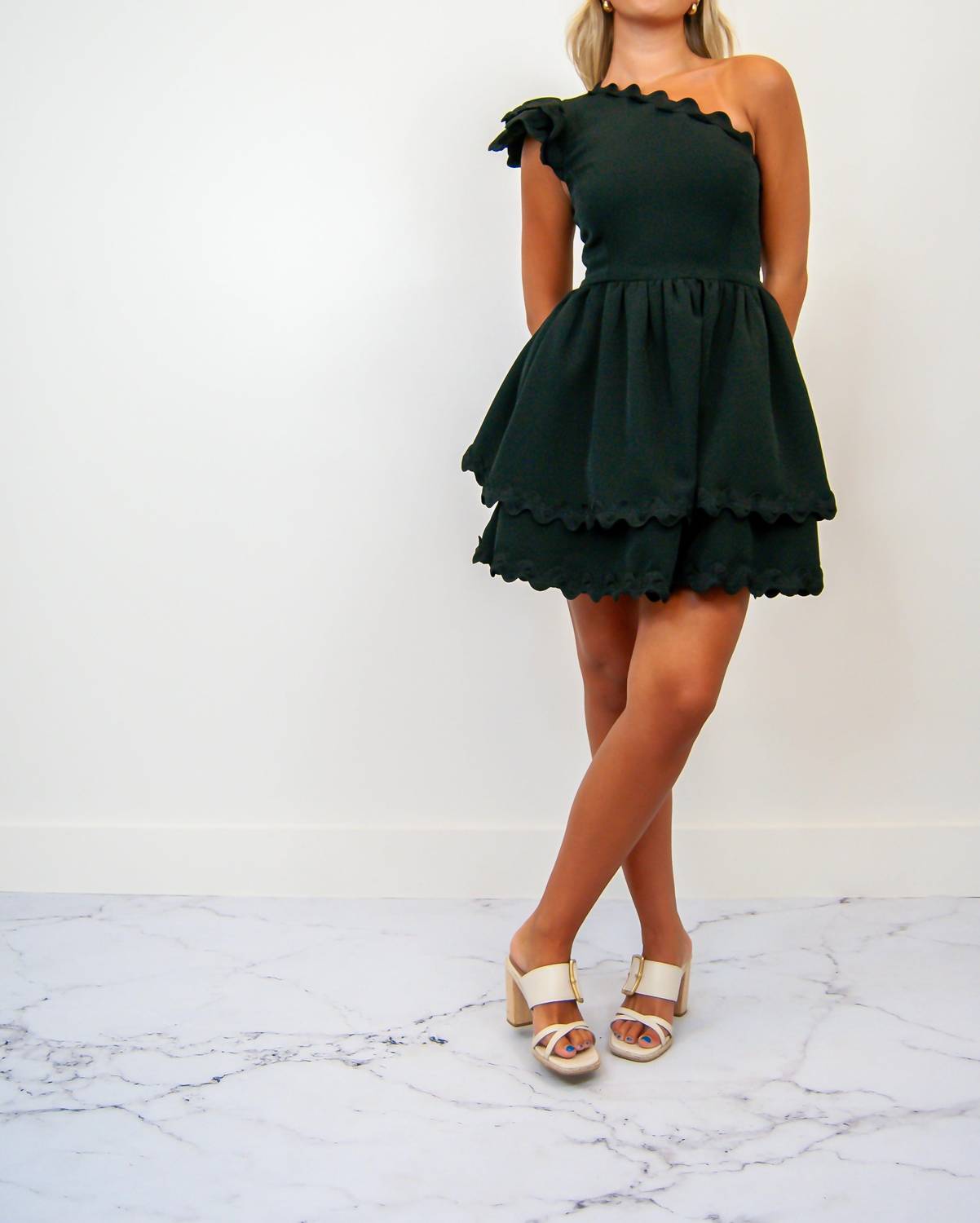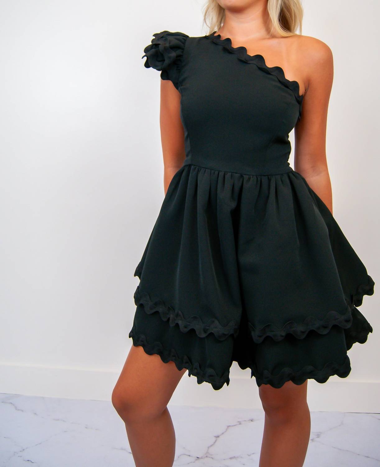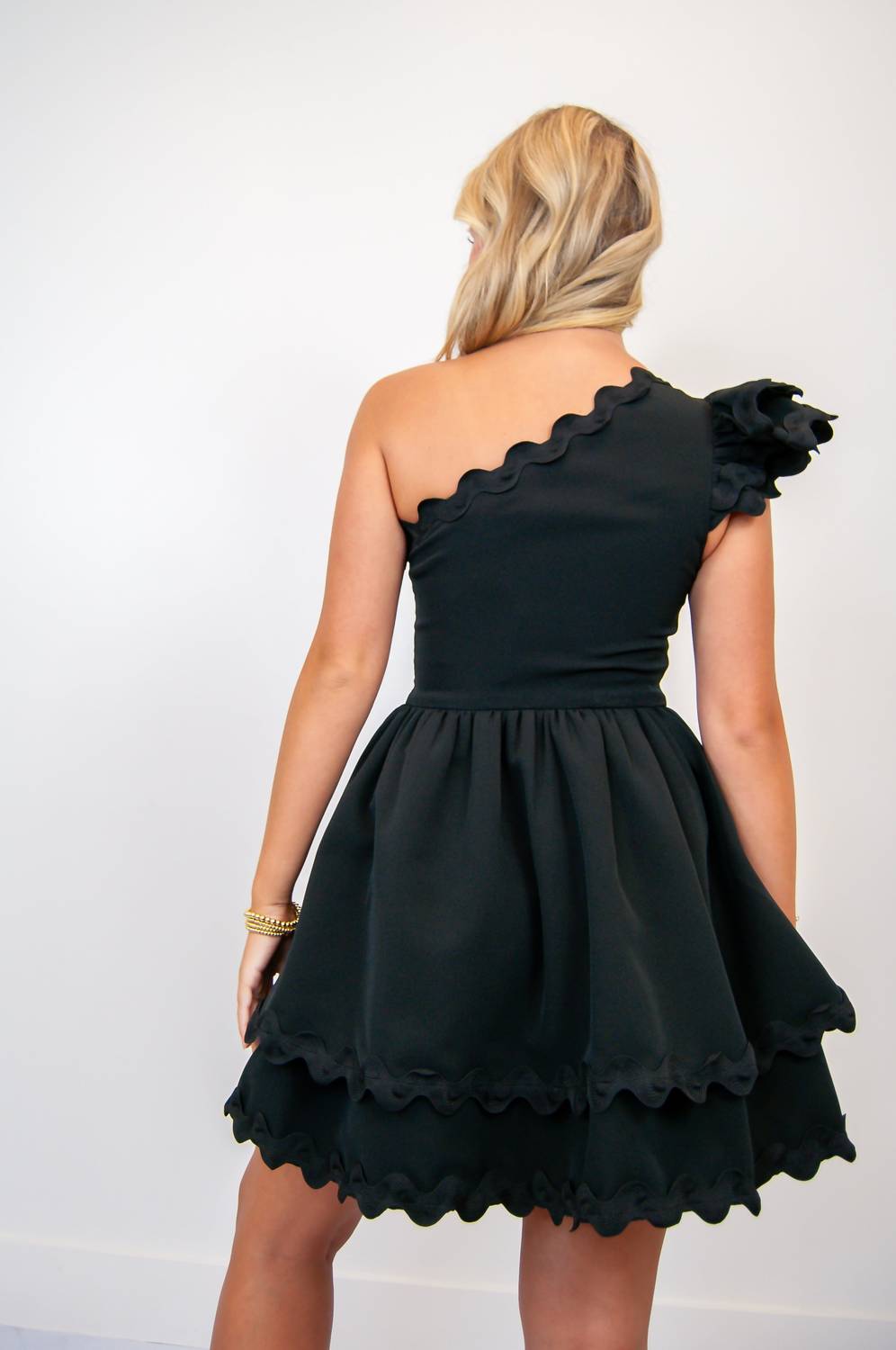 Nothing wrong with a little shoulder action. Elegant black sleeveless, one-shoulder dress. Boasts a delicate scallop edge and ric rac trim. Paired with a fitted waist and flared skirt for a flattering silhouette. Made with 95% polyester and 5% spandex. Promises both style and comfort. Side zipper closure. Hand wash only.