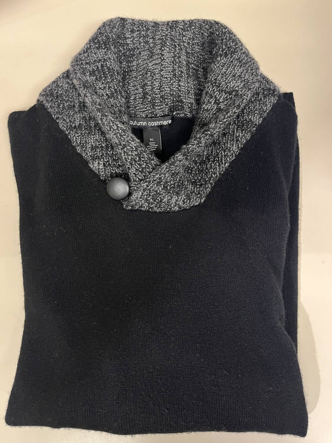 Shawl Collar Black Cashmere Sweater with Marbled collar and one button. Long Sleeve. 100% Cashmere