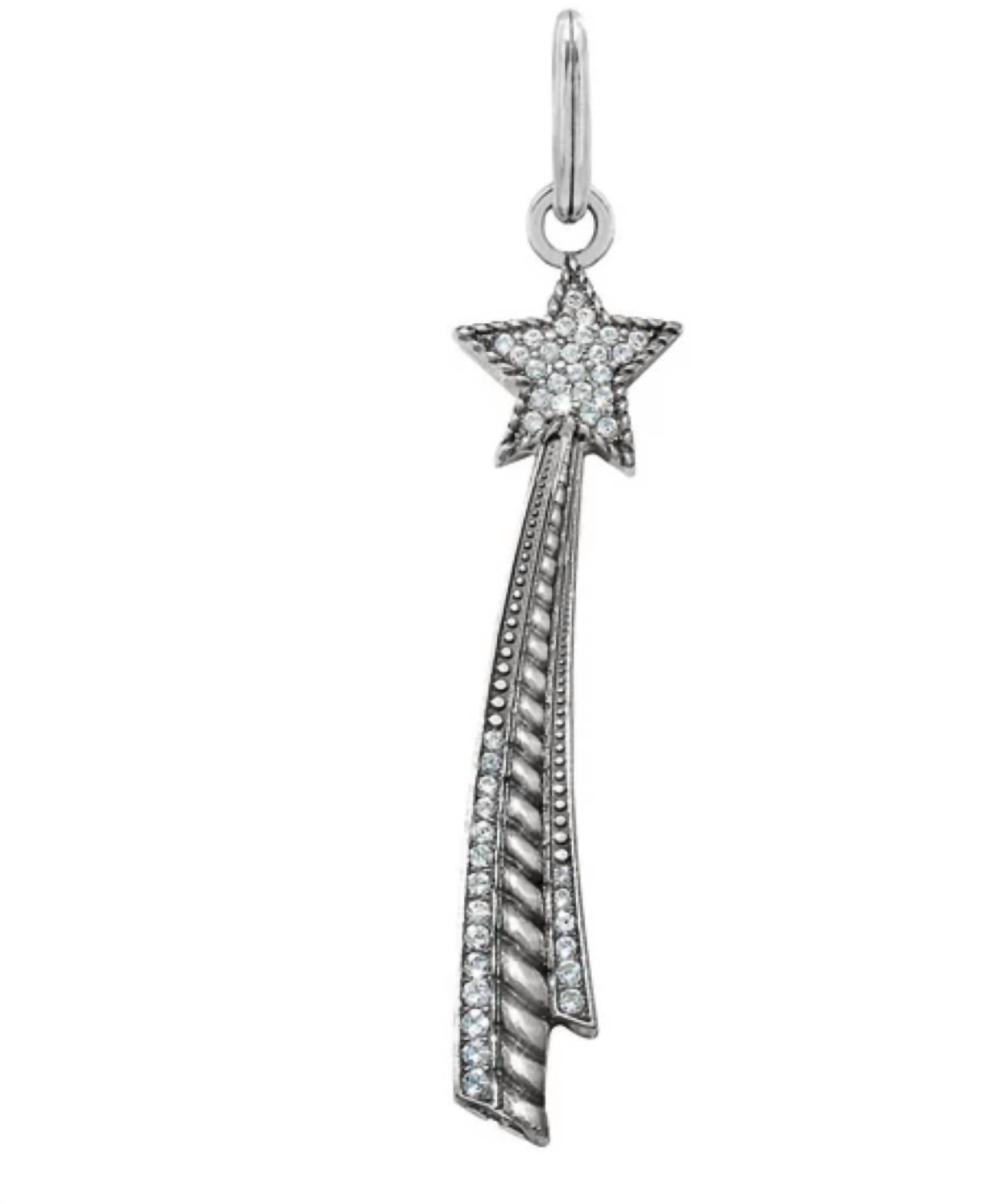 Wish upon this shooting star amulet that is covered in Swarovski crystals. The back has "make a wish" engraved into it. Width: 1/2" Height: 2 3/8" Material: Swarovski Crystal Finish: Silver Plated