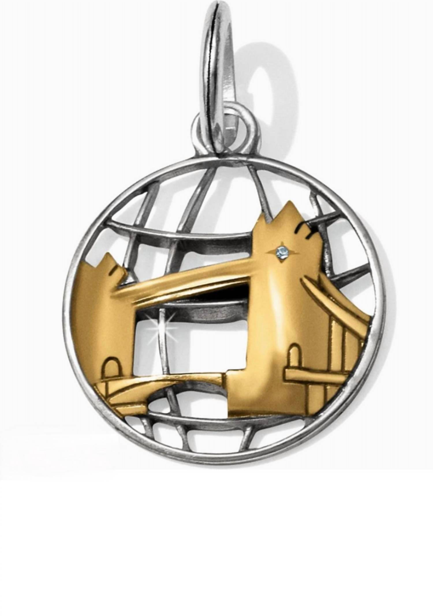 Against global lines of latitude and longitude, London Bridge shines in brushed gold. The perfect amulet for the traveler. Style: # JC4240 Color: Silver-Gold Width: 1" Height: 1 1/2" Finish: Two Tone