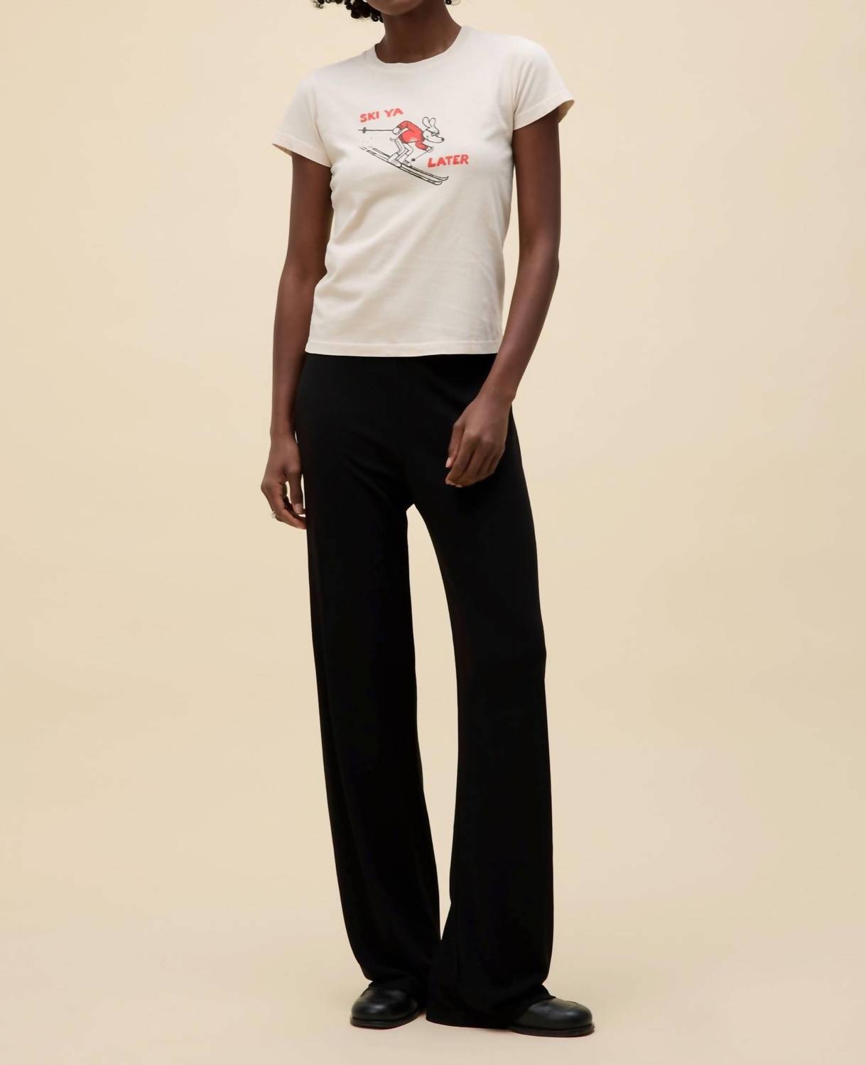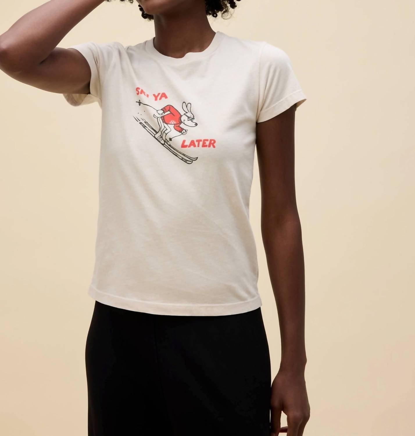 Look no further, you just found your perfect tee! Introducing the Women's Ski Ya Later Headliner Top by DAYDREAMER, a white graphic tee that's perfect for streetwear style during your spring vacation. This short sleeve top features a casual crewneck and a convenient pull-on closure. Ideal for effortless, laid-back looks, this tee is made for women seeking comfort and trendiness. Enhance your wardrobe with this versatile piece, whether for casual outings or relaxed travels.