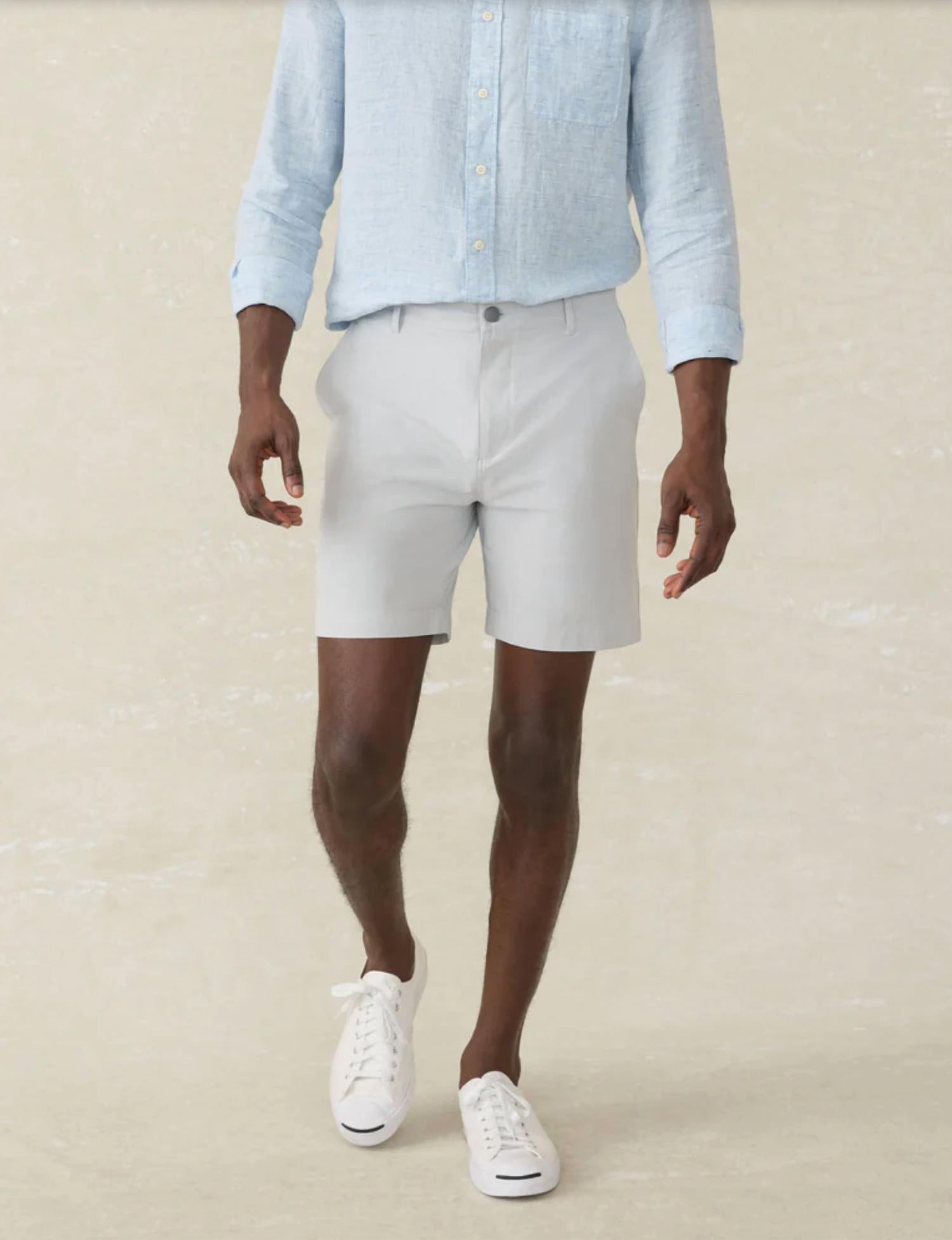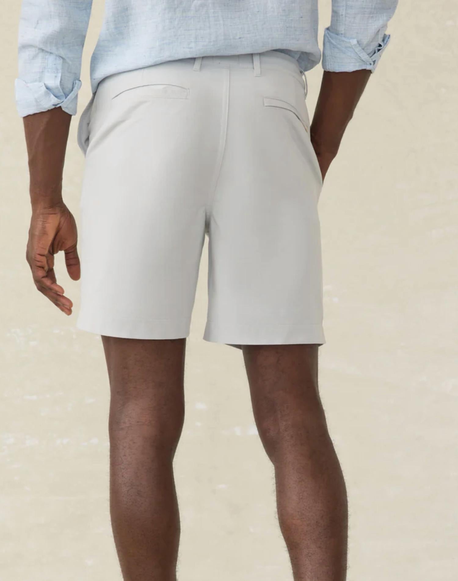 Introducing the Faherty All Day 2.0 Short, a refined addition to any men's vacation wardrobe. These versatile shorts in stone color boast a 5" inseam and feature a solid pattern, crafted from high-performance polyester for all-day comfort and quick-drying capability. Sporting mesh-lined pockets, a lower profile shank button closure, and an inner drawstring, they offer a tailored appearance with a flat front style. Care is simple with machine wash and tumble dry instructions, making them ideal for minimalist spring adventures.