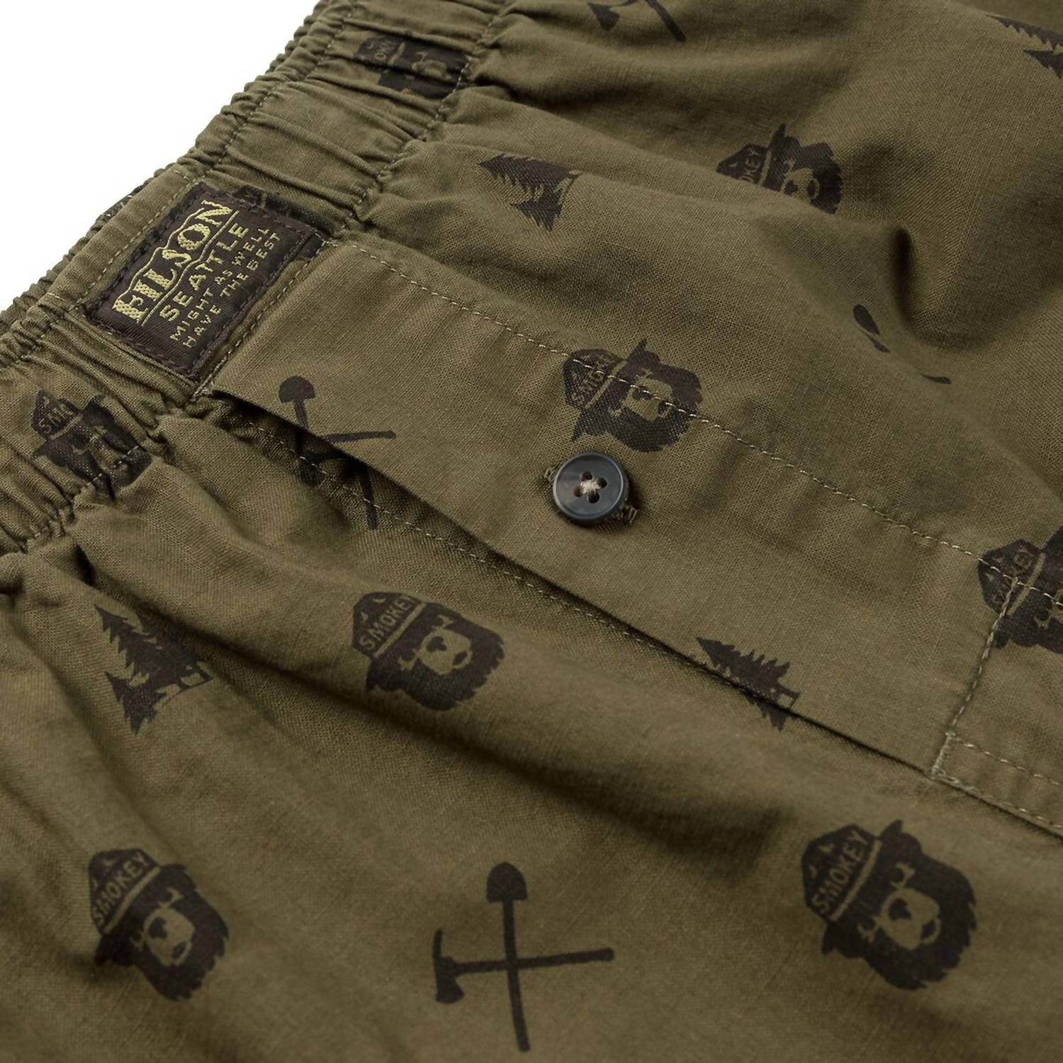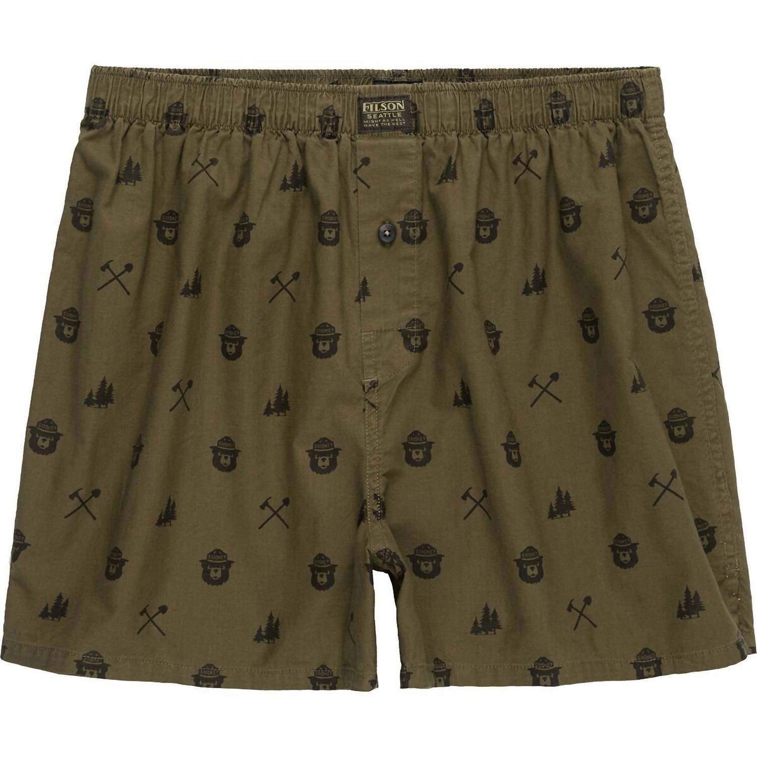 Introducing the Men's Smokey Bear Lounge Shorts by FILSON, a comfortable choice for showcasing support for wildland firefighters. Crafted from 100% cotton, these midweight boxers offer remarkable softness for a premium feel. They feature a single-button fly and a Filson label on the waist in a MarshOlive color, exuding a minimalist yet graphic style. Ideal for casual, vacationing in the summer, these shorts feature a button closure for easy wear.